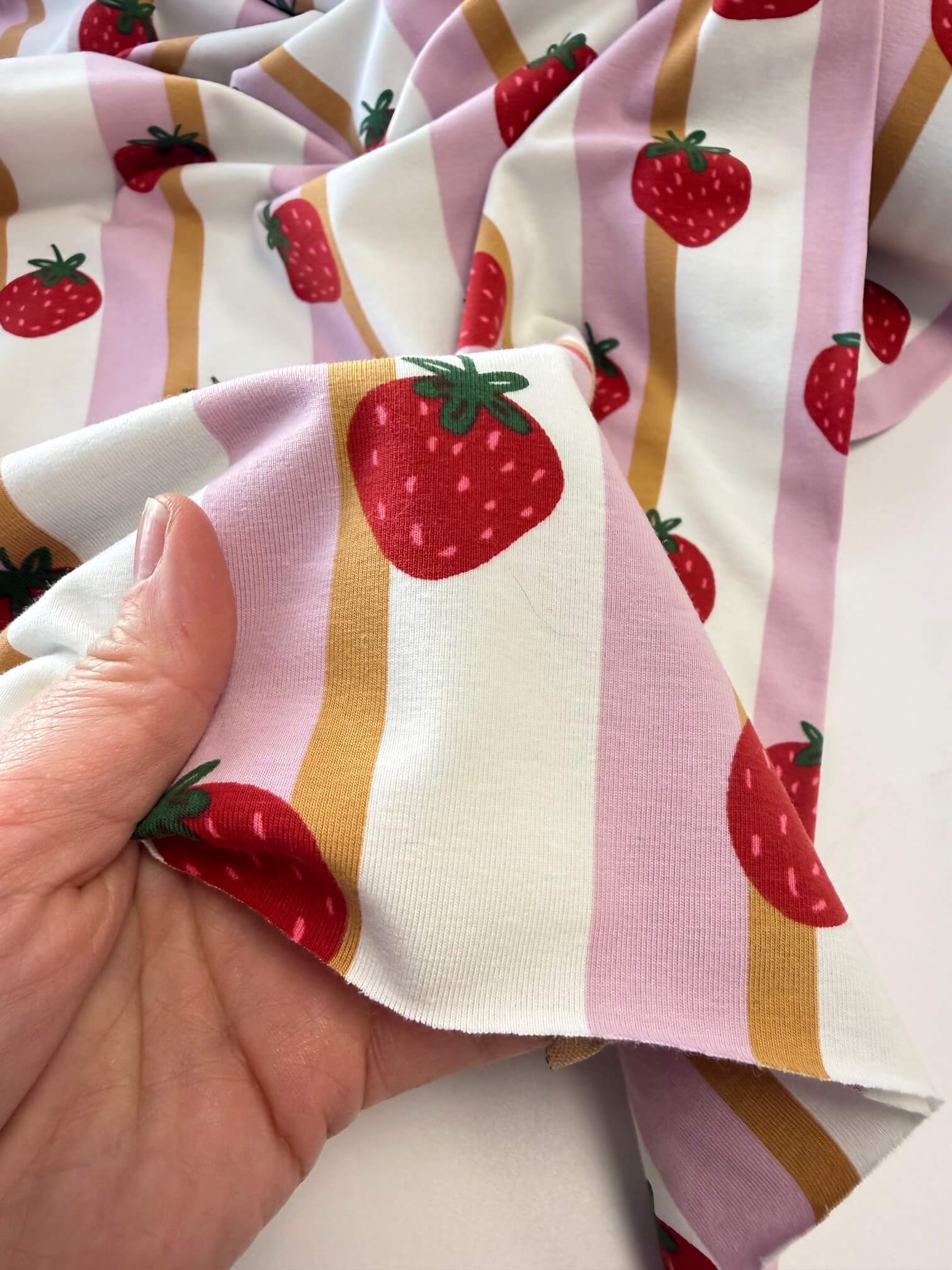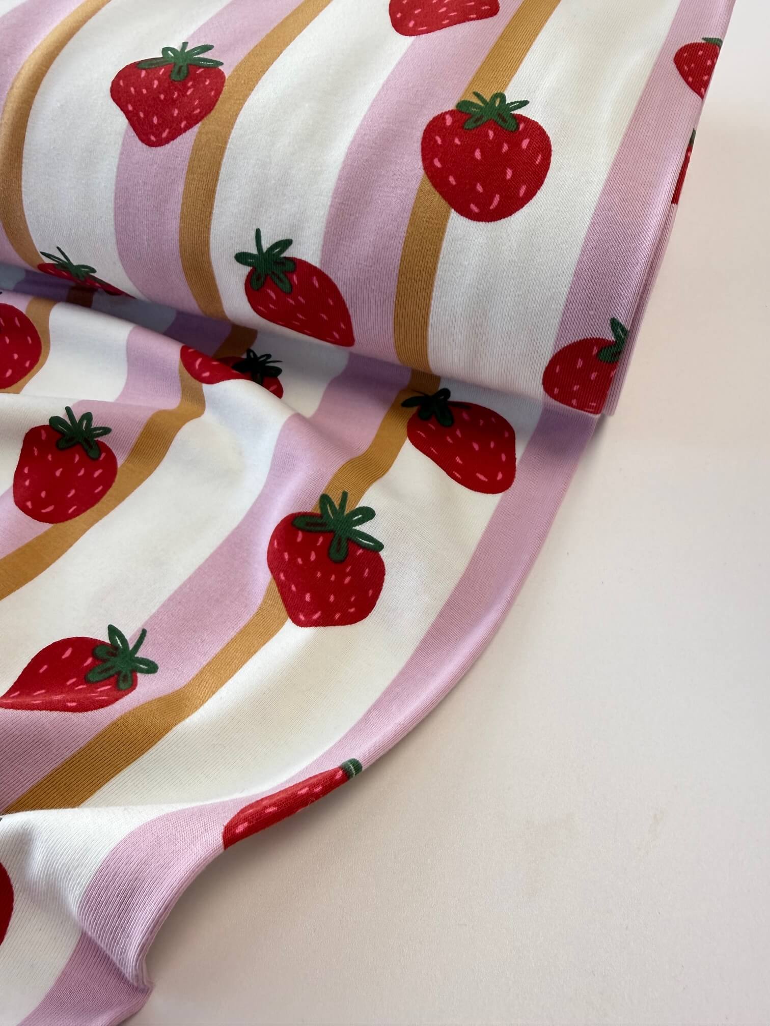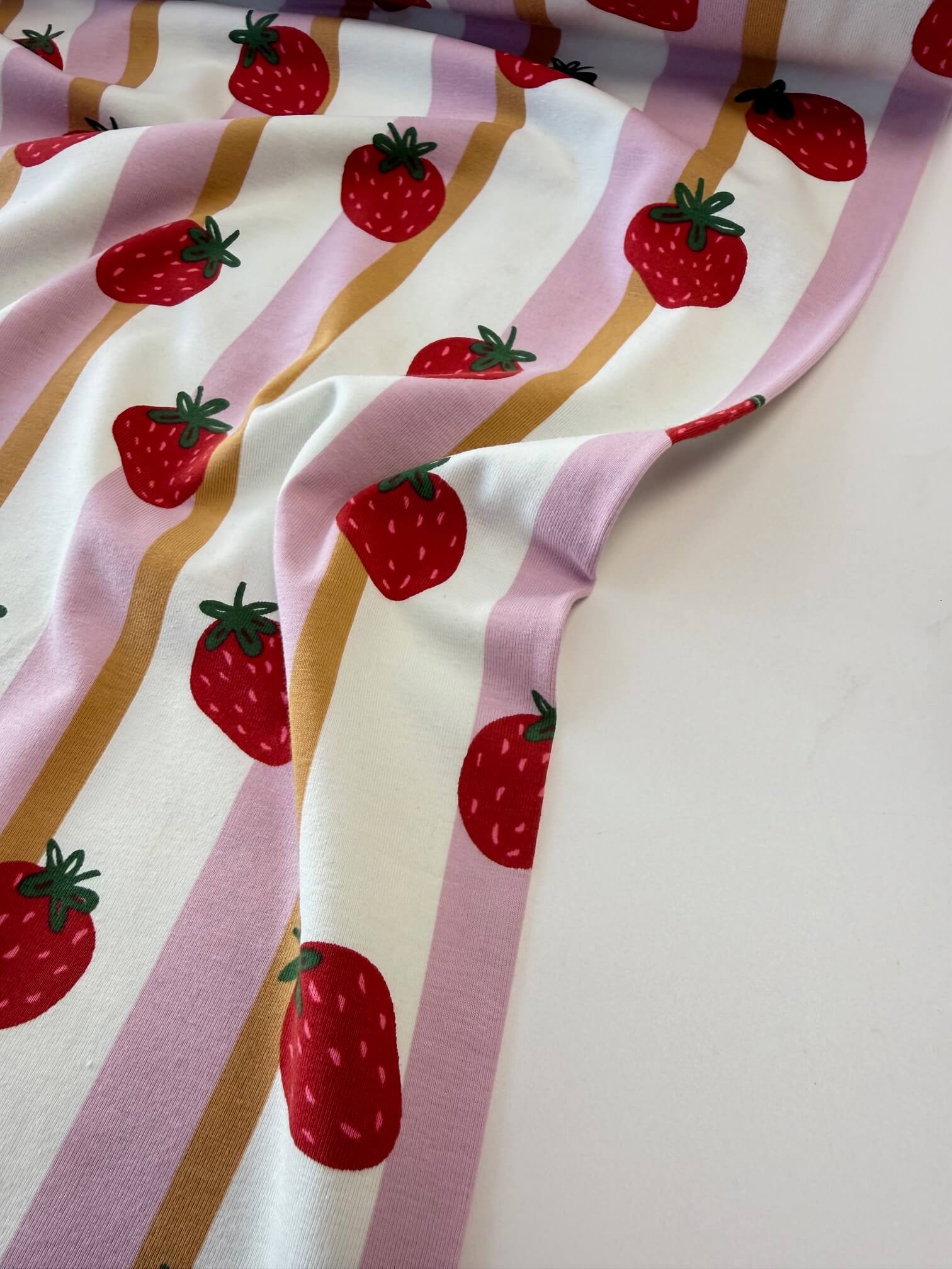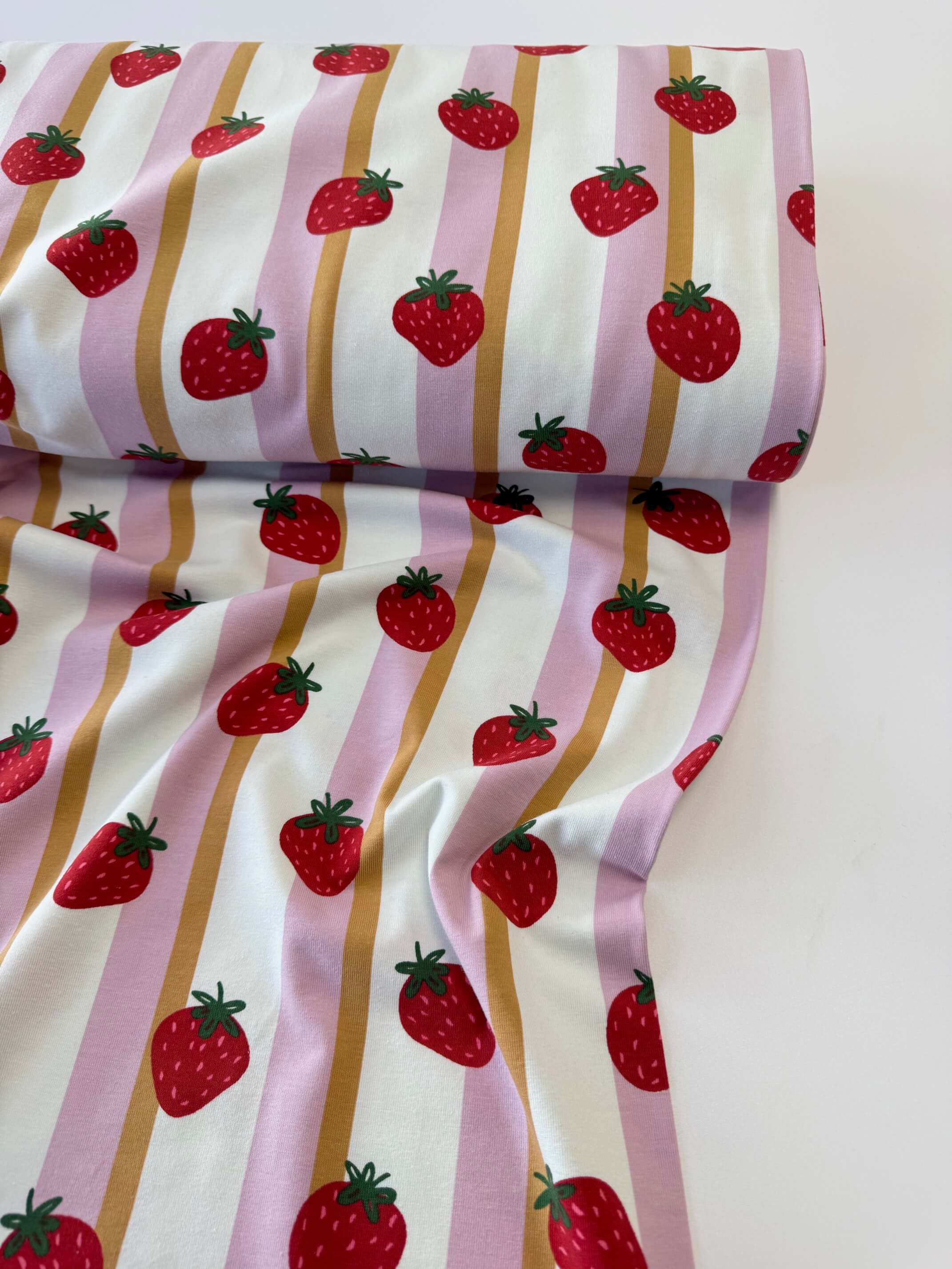 Bold strawberries scattered across wide retro stripes , this print feels like seaside sweet shops and summer market stalls. The strong stripe layout keeps it graphic and modern, while the juicy red strawberries bring all the cheerful energy. Playful but not childish, it’s a statement jersey that still feels wearable.