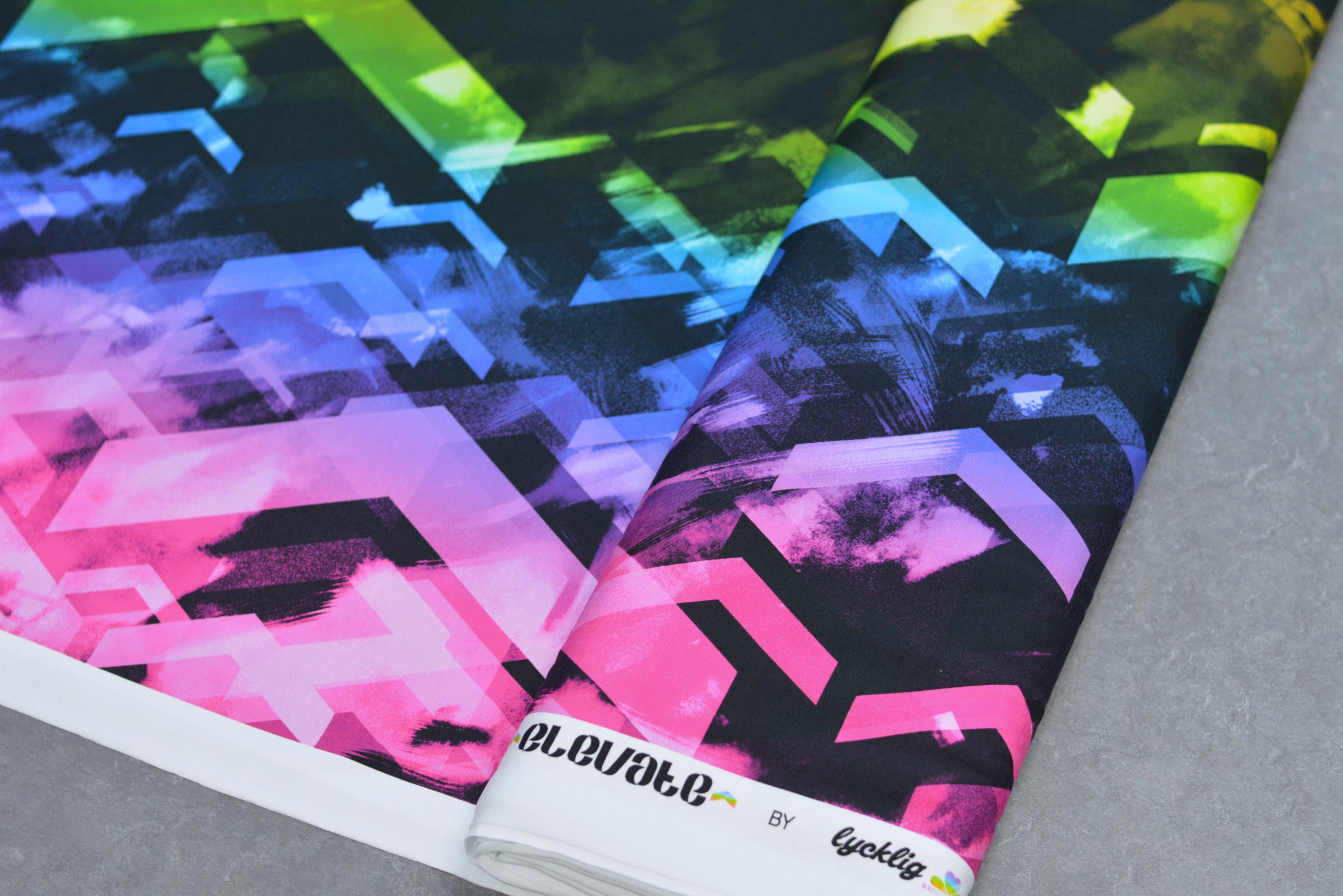Bold, graphic, and full of movement, Elevate is all about upward energy. Layered chevrons and angular shapes stack, scatter, and climb across a deep inky background, splashed with vibrant flashes of colour that feel electric and expressive. There’s a real sense of motion in this design ,like colour and texture caught mid-lift giving it a confident, modern edge with just the right amount of drama. Eye-catching without being overwhelming, Elevate is a statement print that feels powerful, wearable, and effortlessly cool.