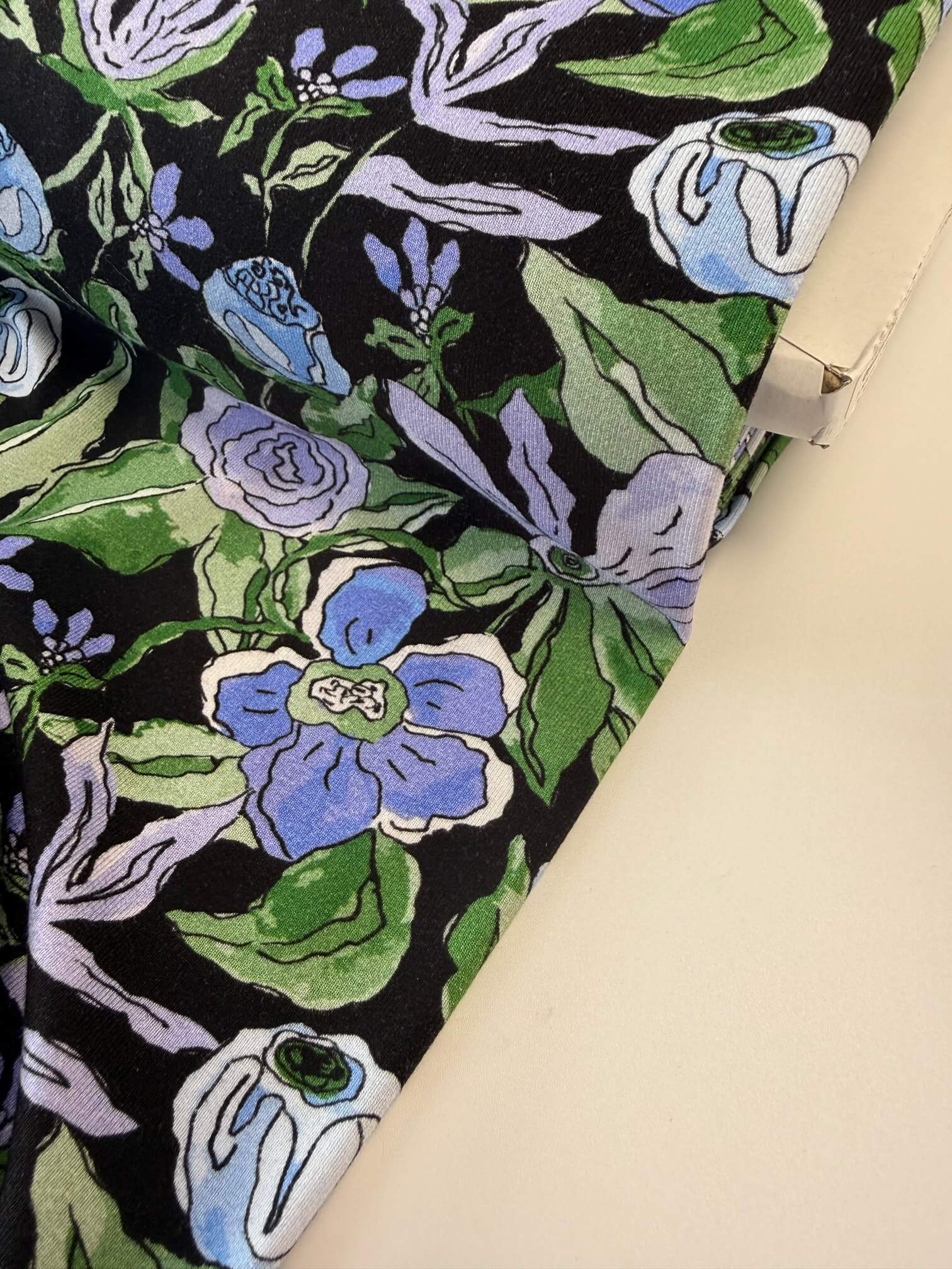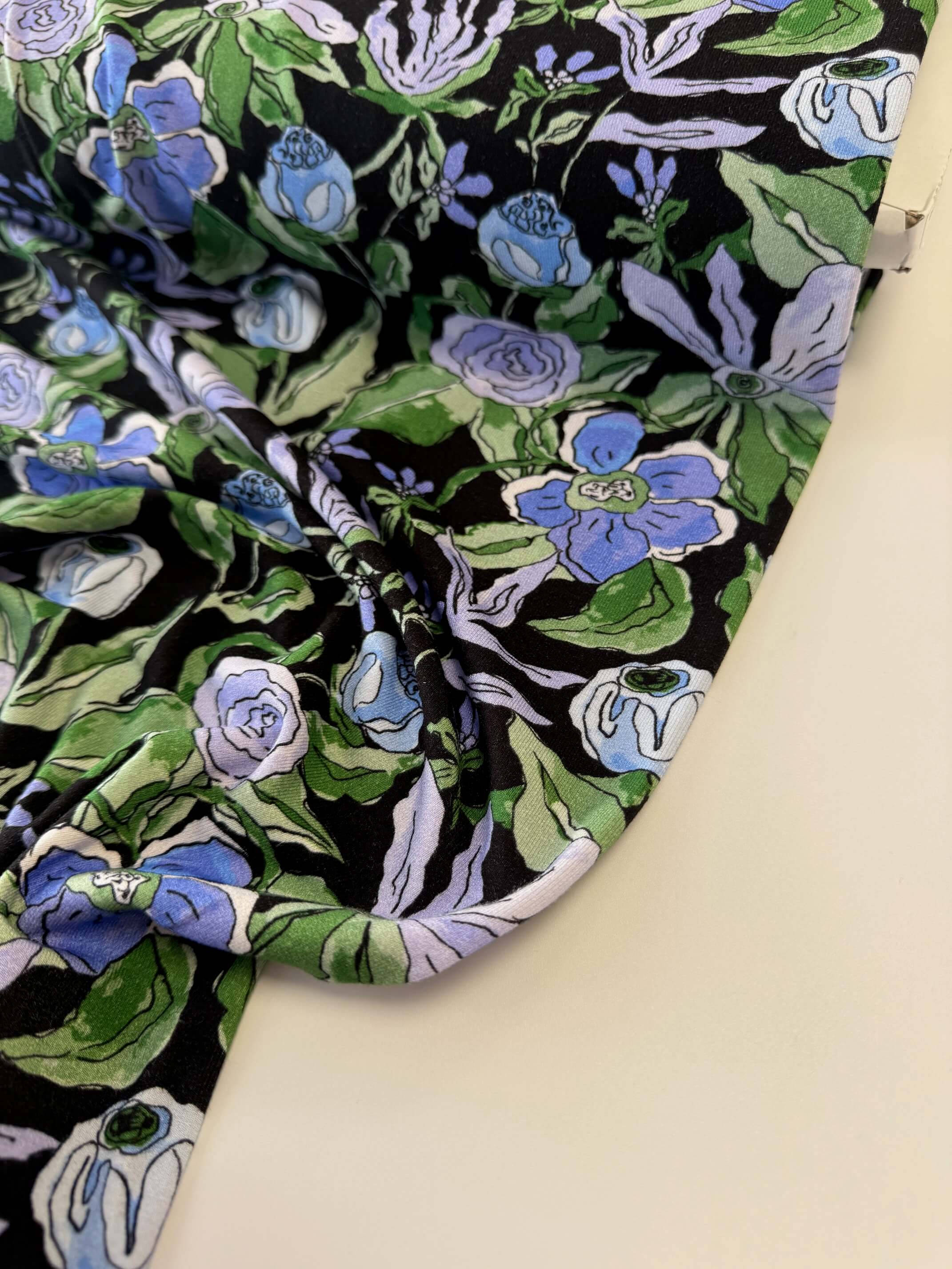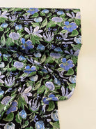 A striking floral set against a deep midnight ground, Indigo Reverie blends inky blacks with soft periwinkle, cornflower and sage green tones. The blooms have a hand-drawn, almost illustrative quality , bold outlines softened by painterly colour fills, giving the print a confident, contemporary edge while still feeling romantic.