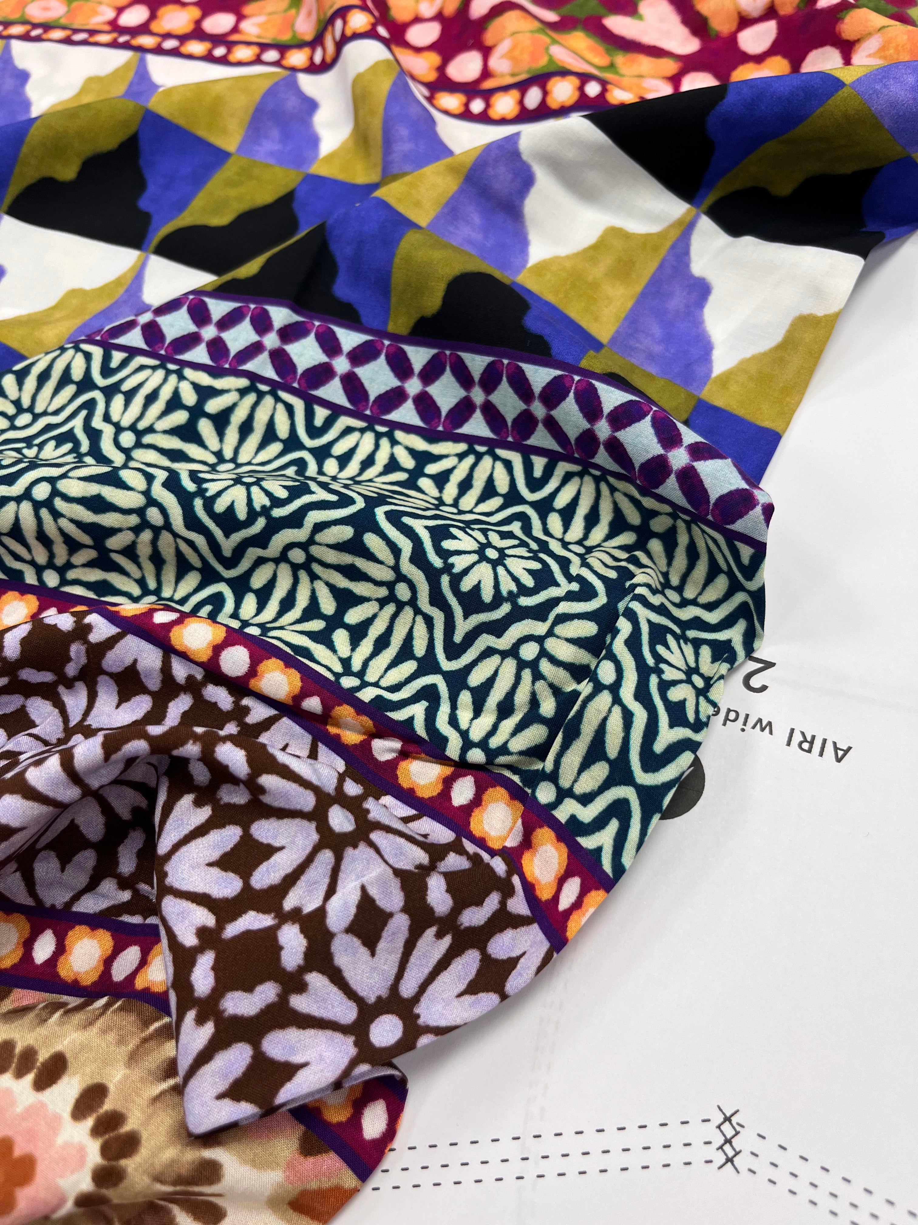 A joyful celebration of colour and pattern, this striking design unfolds in beautifully arranged horizontal bands that sweep across the fabric. Each stripe reveals its own intricate world of painterly florals, geometric shapes, and decorative motifs, creating a wonderfully dynamic, layered look. The mix of rich tones and artistic detailing gives the print an eclectic, wanderlust-inspired charm.