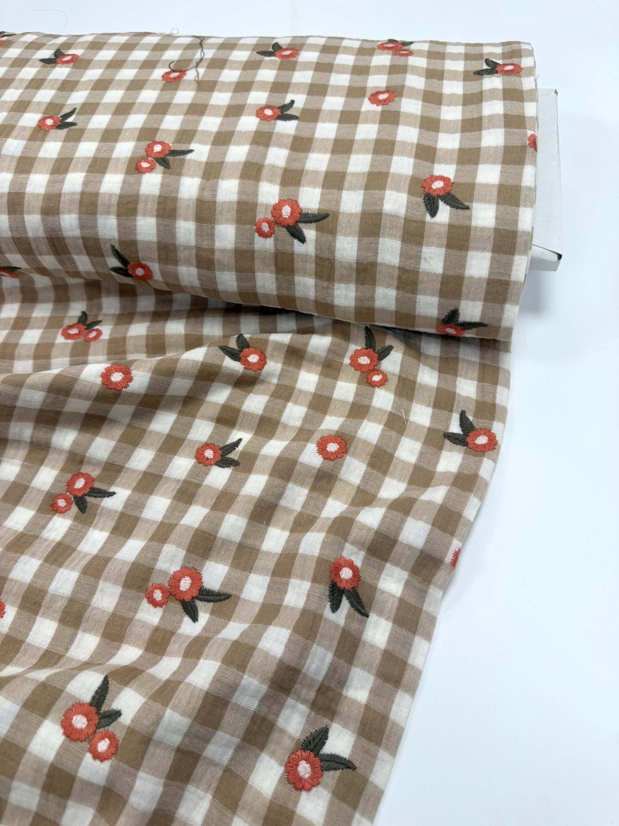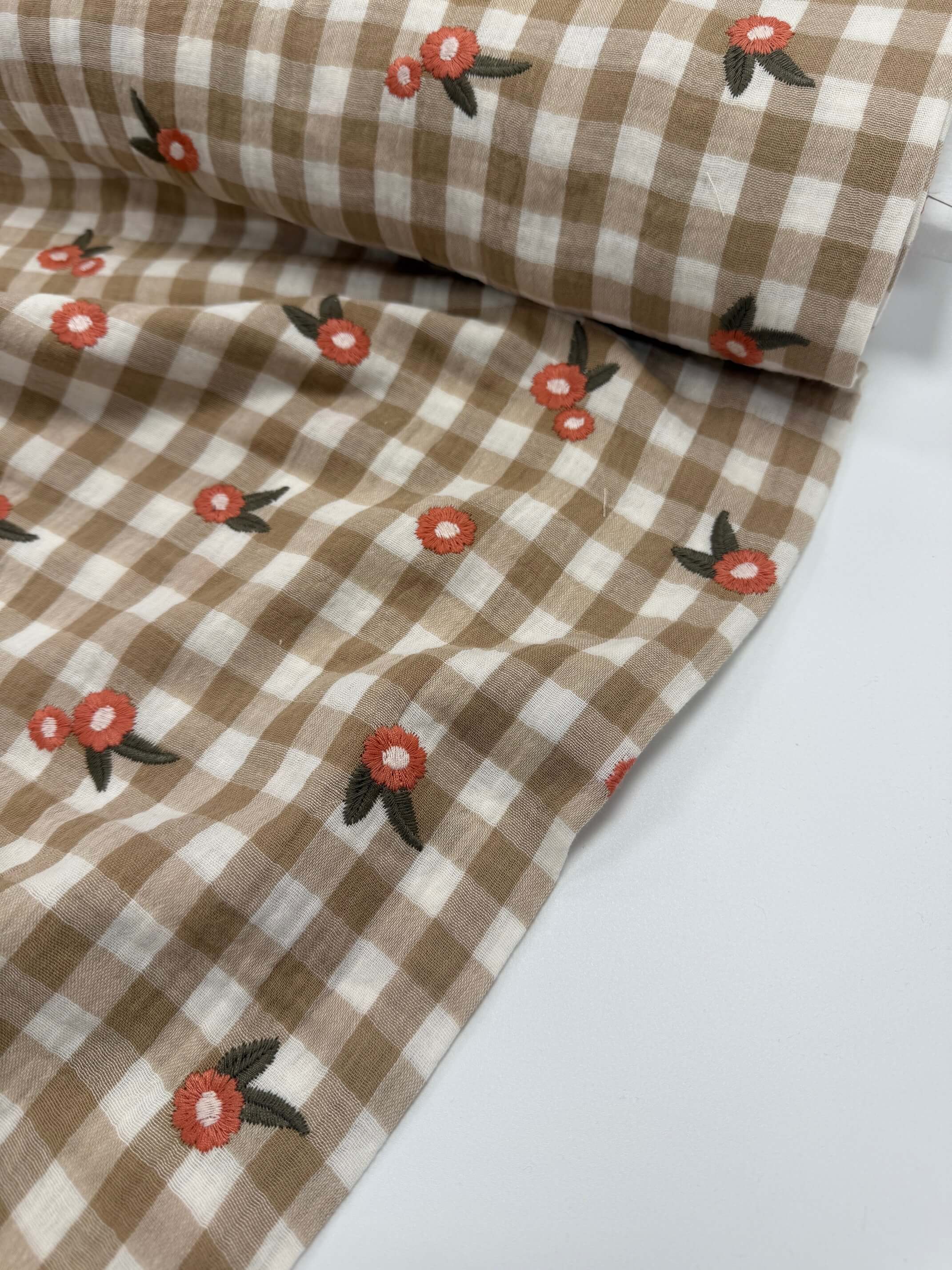 Quiet Check is a beautifully soft double gauze featuring a classic gingham base scattered with delicate embroidered flowers. The lightweight, airy handle makes it a dream to wear, while the subtle embroidery adds just the right amount of charm without overwhelming the simplicity of the check.