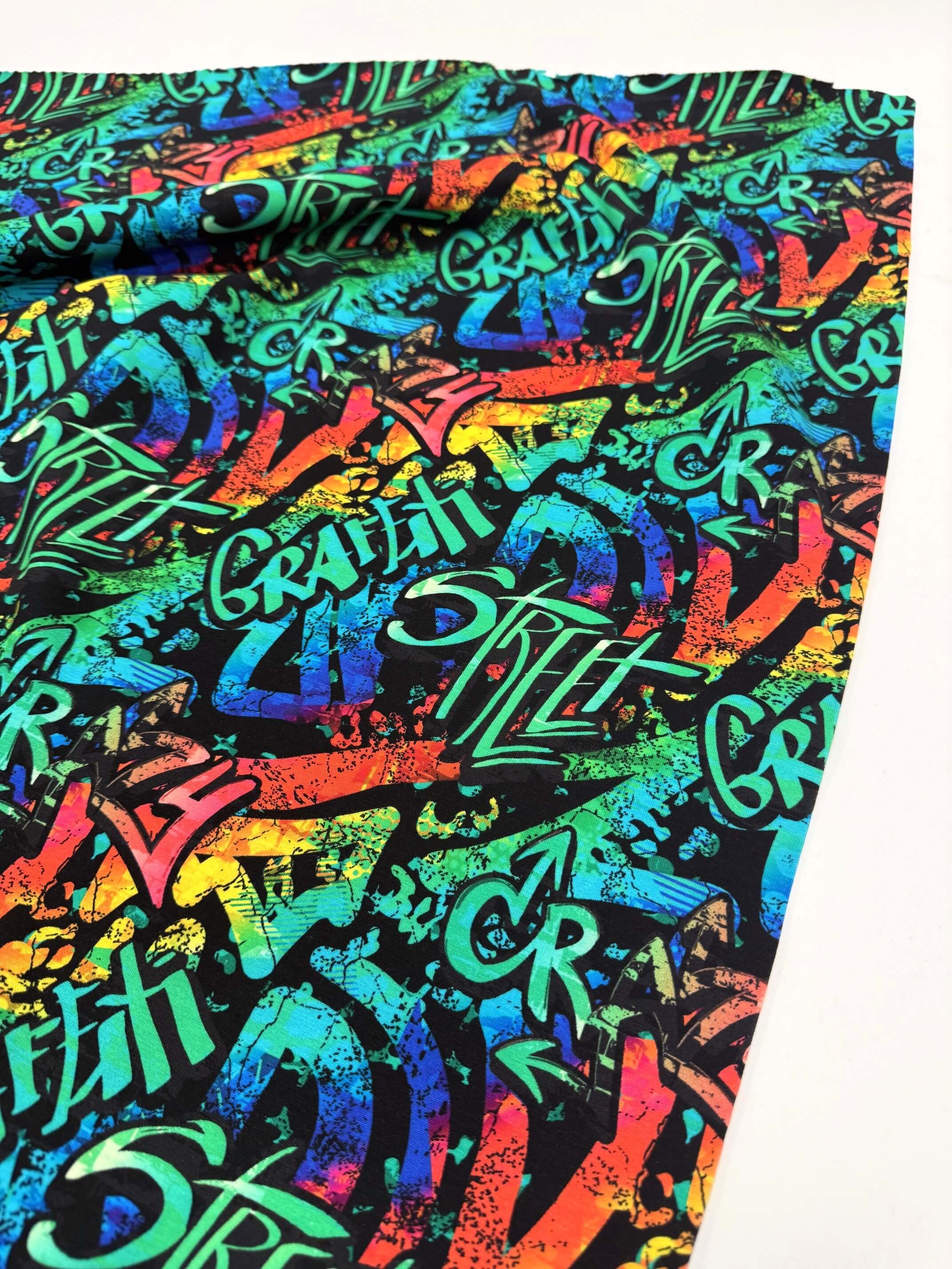 A high-impact graffiti print bursting with neon brights, painterly textures and street-art attitude, all set against a deep black base. Electric pinks, teals, greens and yellows collide in a design that feels energetic, creative and unapologetically bold, perfect for statement makes that refuse to blend in.