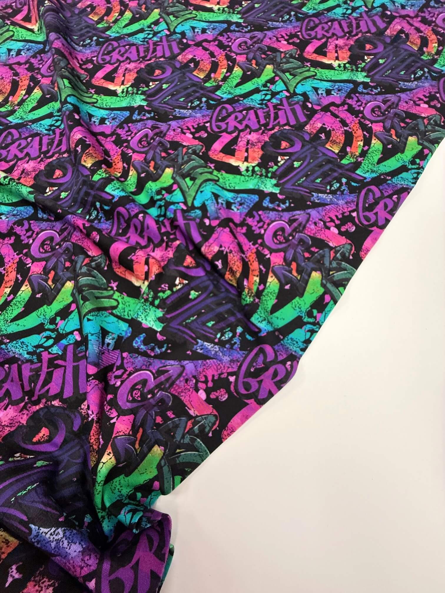 A high-impact graffiti print bursting with neon brights, painterly textures and street-art attitude, all set against a deep black base. Electric pinks, teals, greens and yellows collide in a design that feels energetic, creative and unapologetically bold, perfect for statement makes that refuse to blend in.