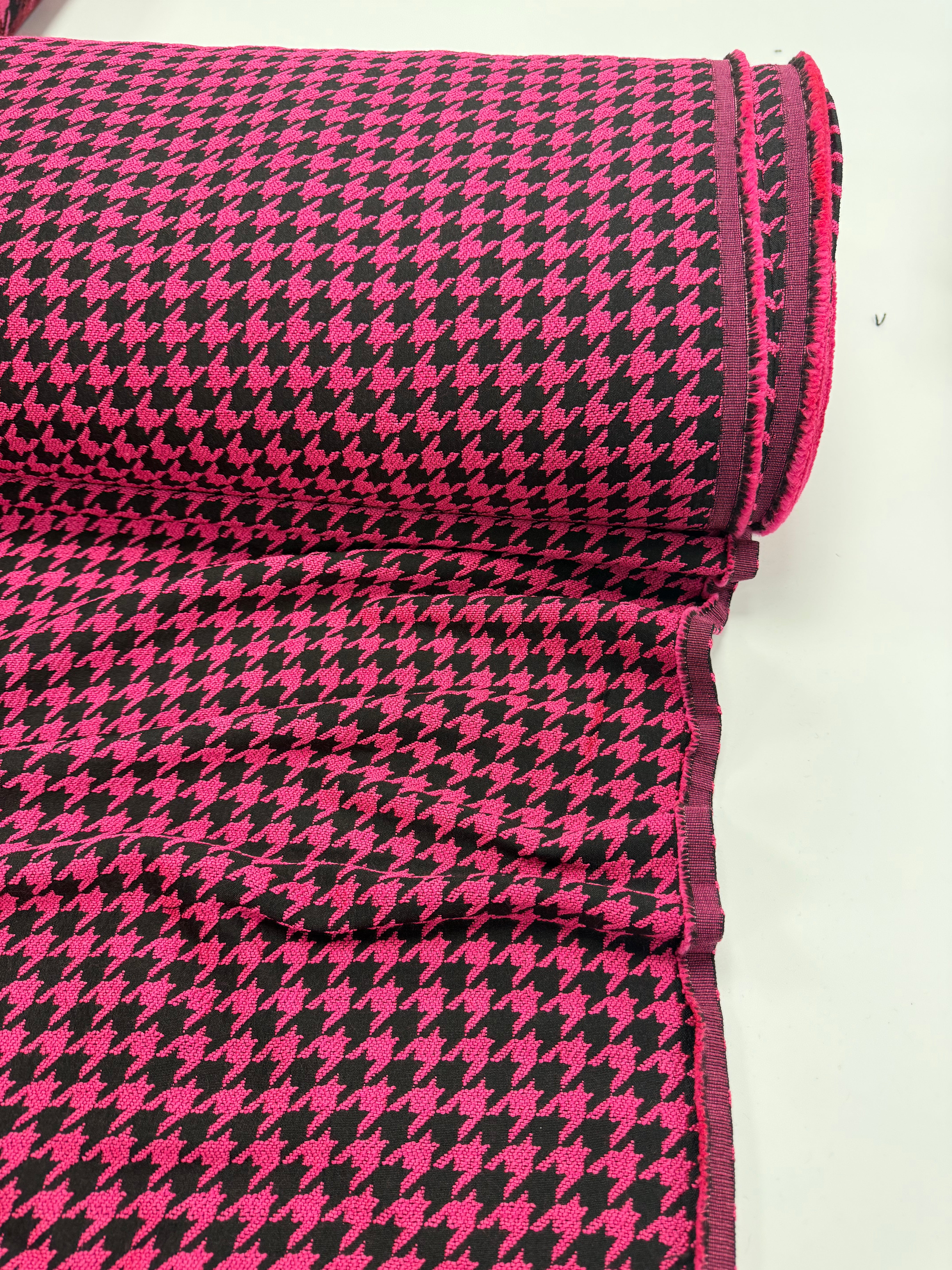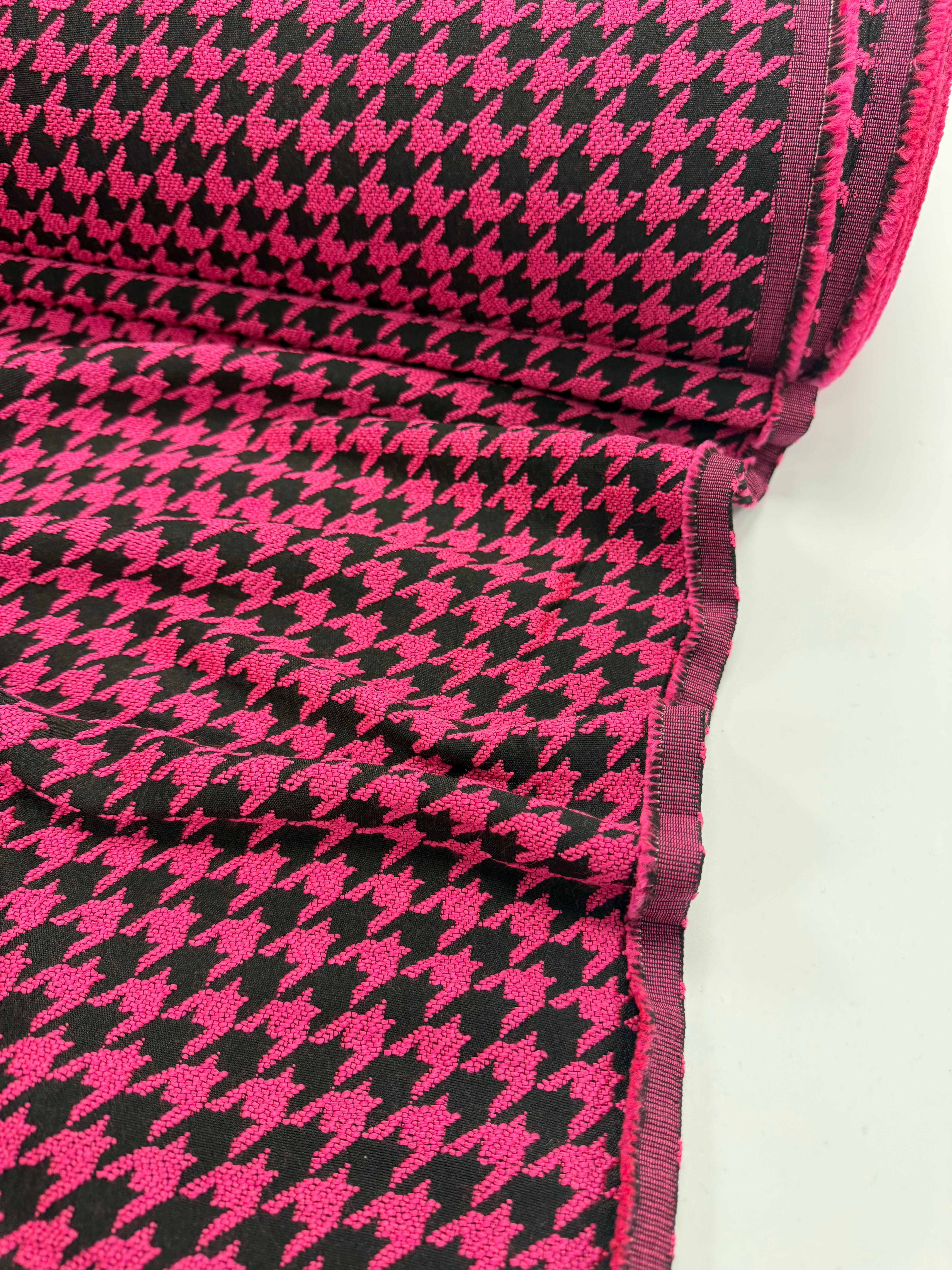Eye-catching oversized houndstooth in fiery red and vivid pink tones. A dramatic fabric full of personality, great for striking jackets, pinafores, or bold separates.