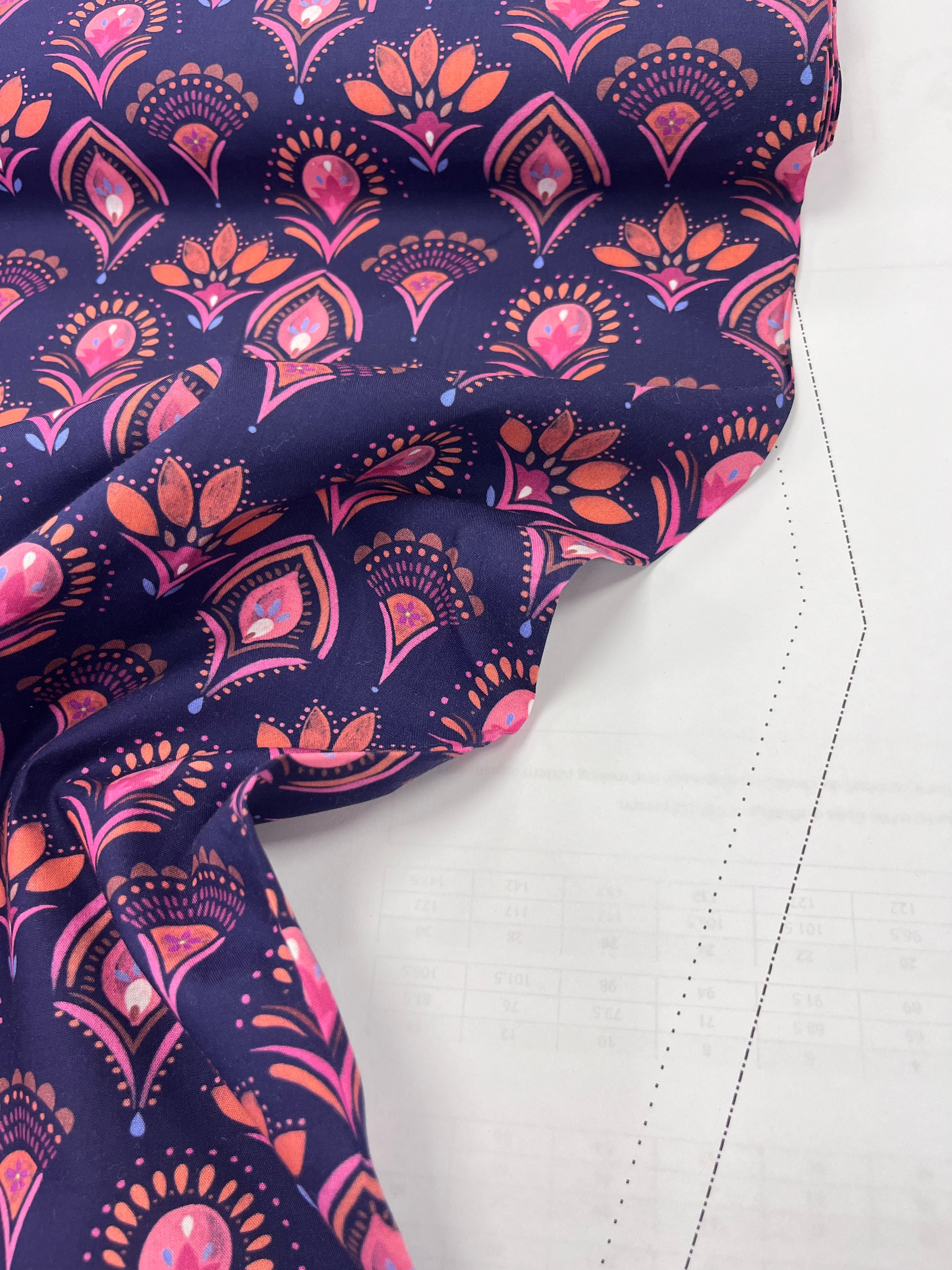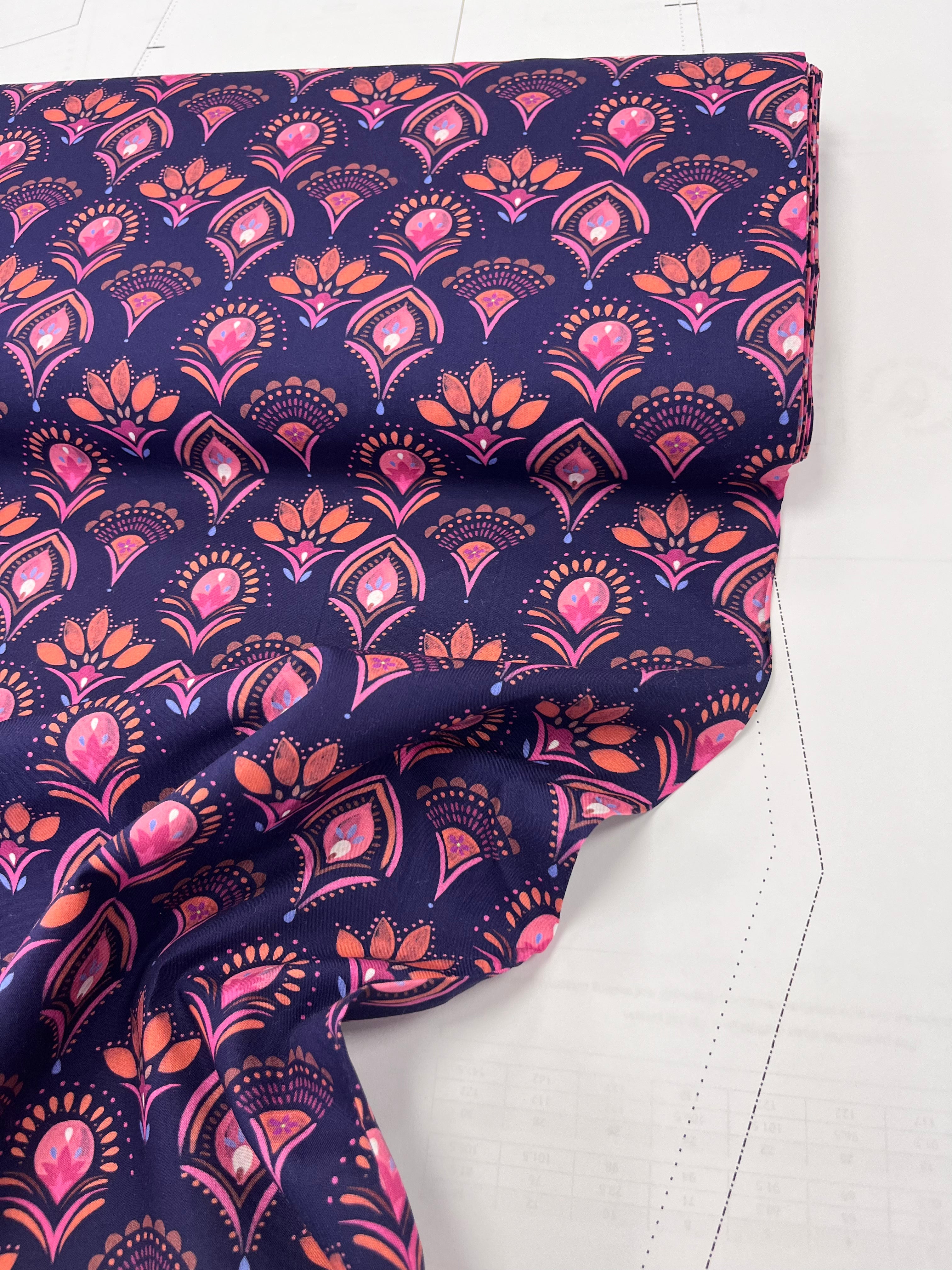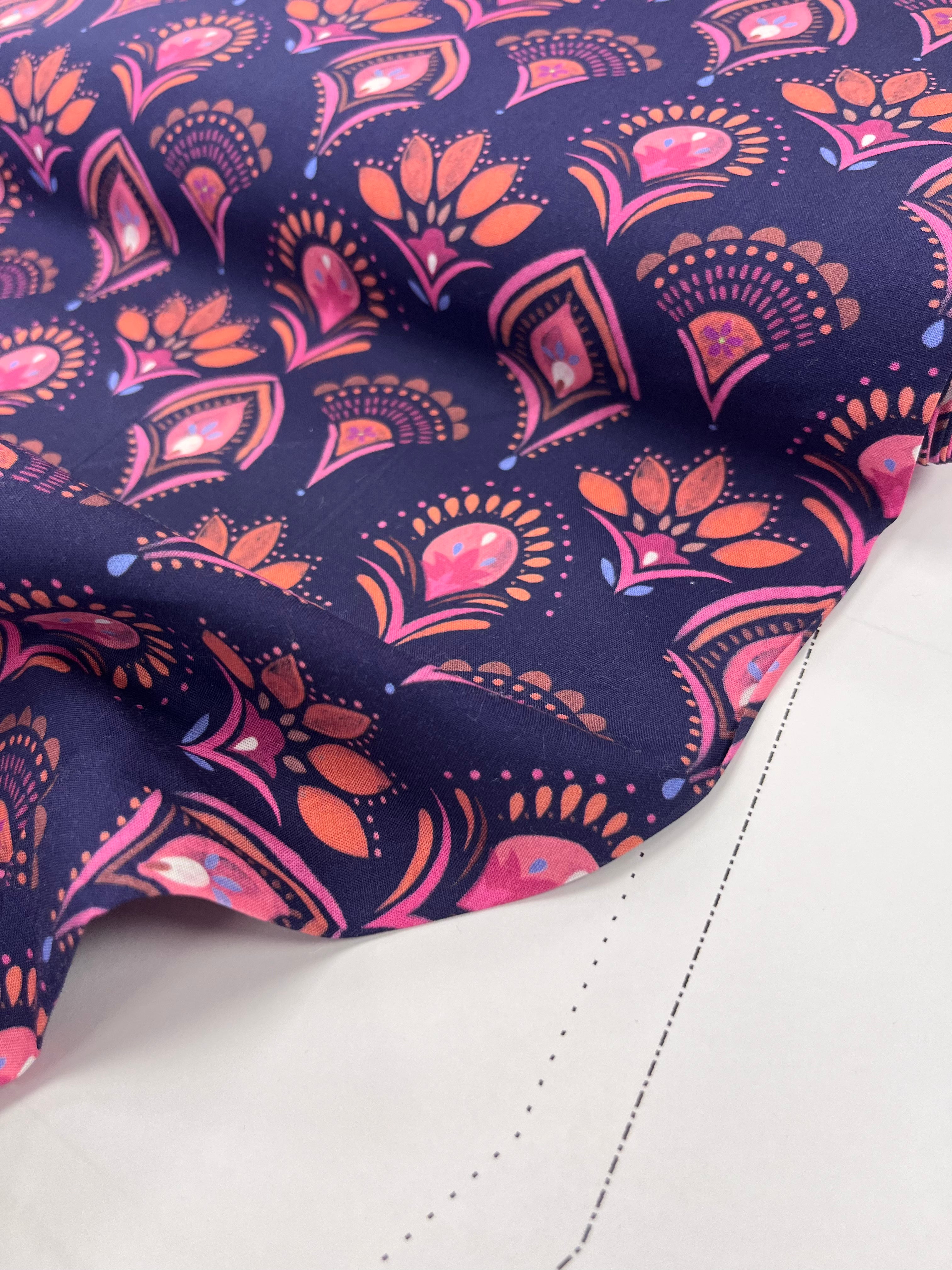This fabric features a rich navy background with a stylized, symmetrical floral motif in vibrant shades of pink, coral, and orange. The design feels both elegant and playful, with a hint of Art Deco and Eastern influence