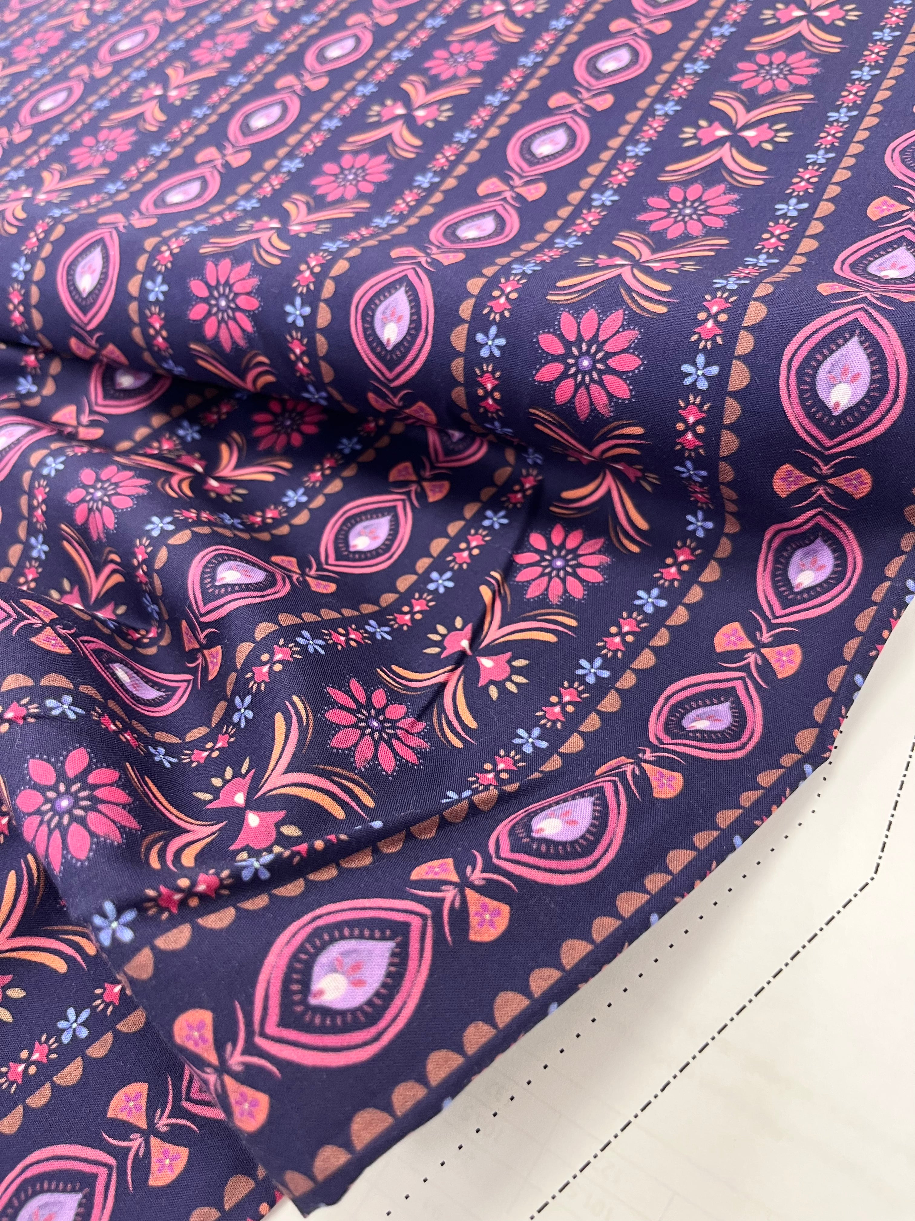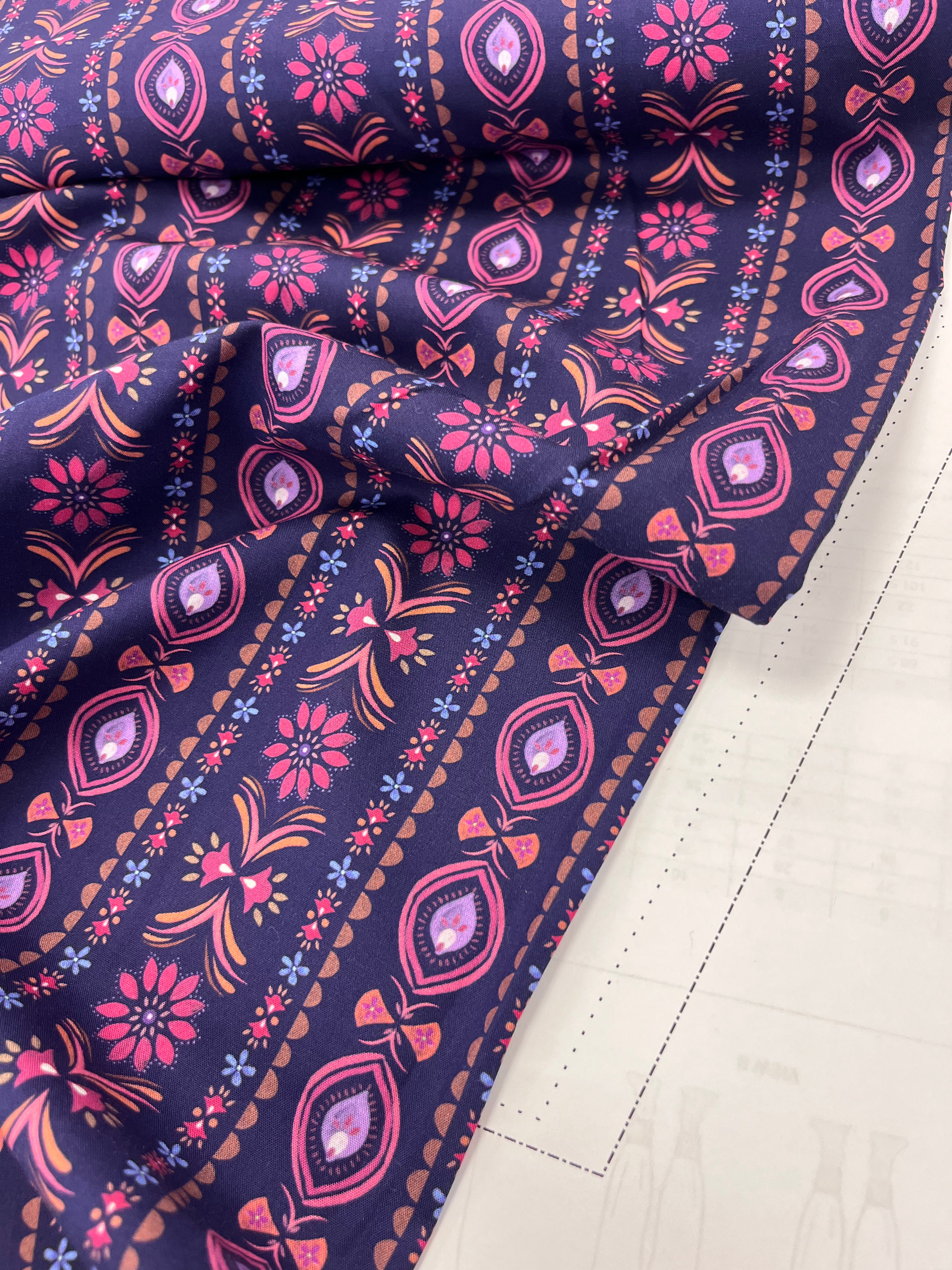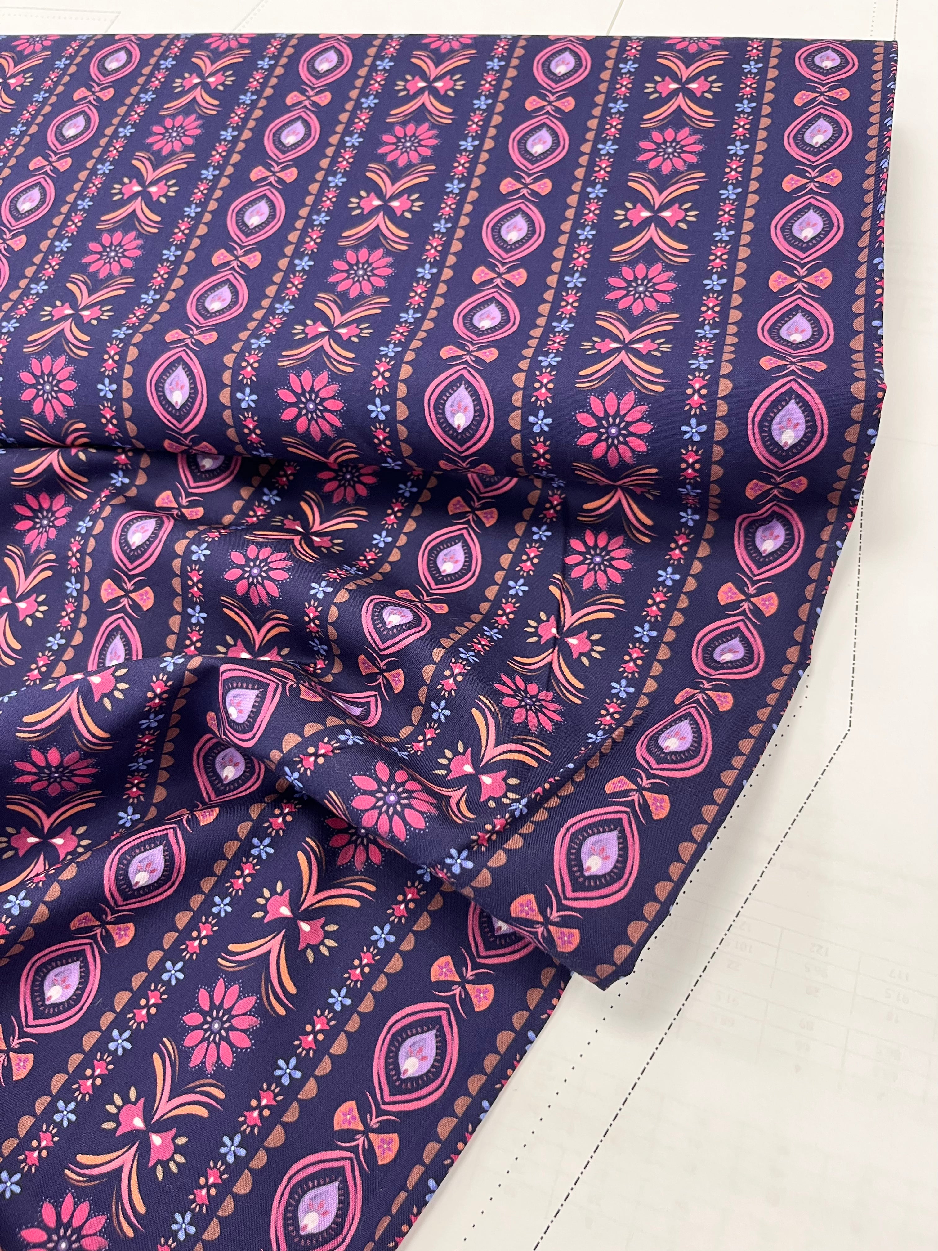 Floral Pagoda Stripe | Fine Poplin | Navy