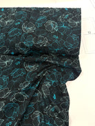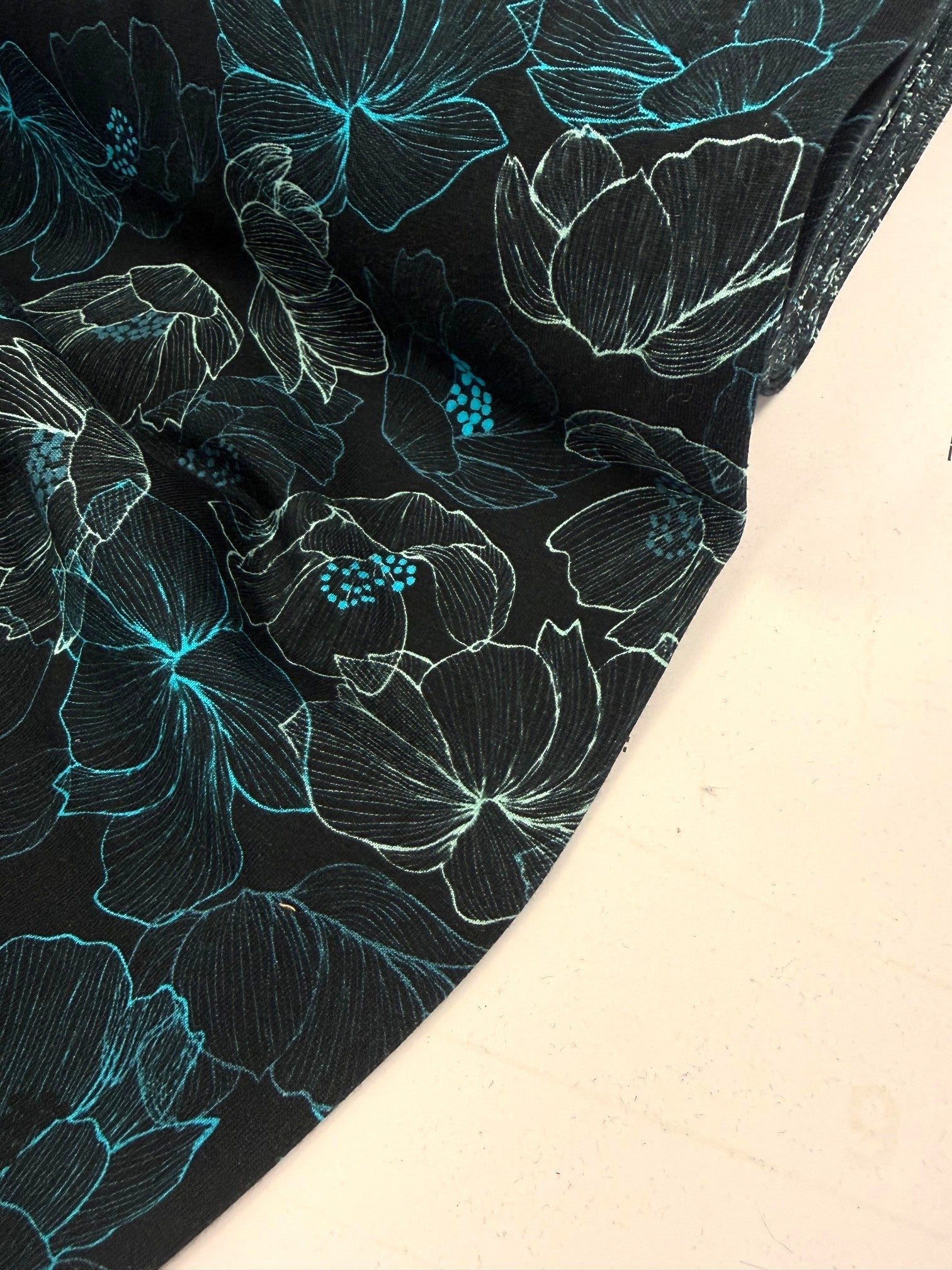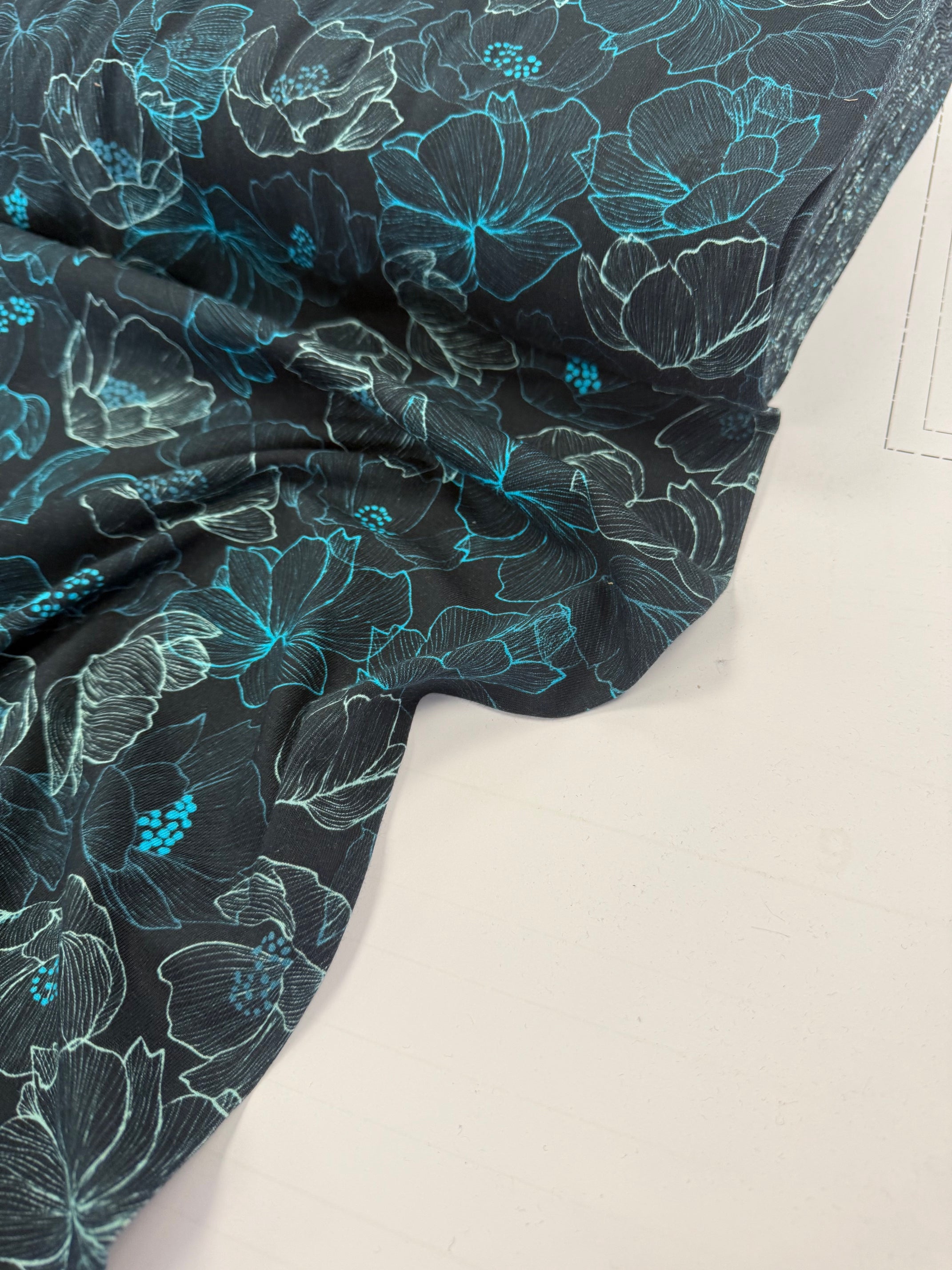 Delicate outlines of floral blooms in soft shades of turquoise and aqua dance across a deep navy background in this elegant cotton jersey. The fine linework gives the print a hand-drawn feel, perfect for adding a touch of sophistication to your handmade wardrobe.