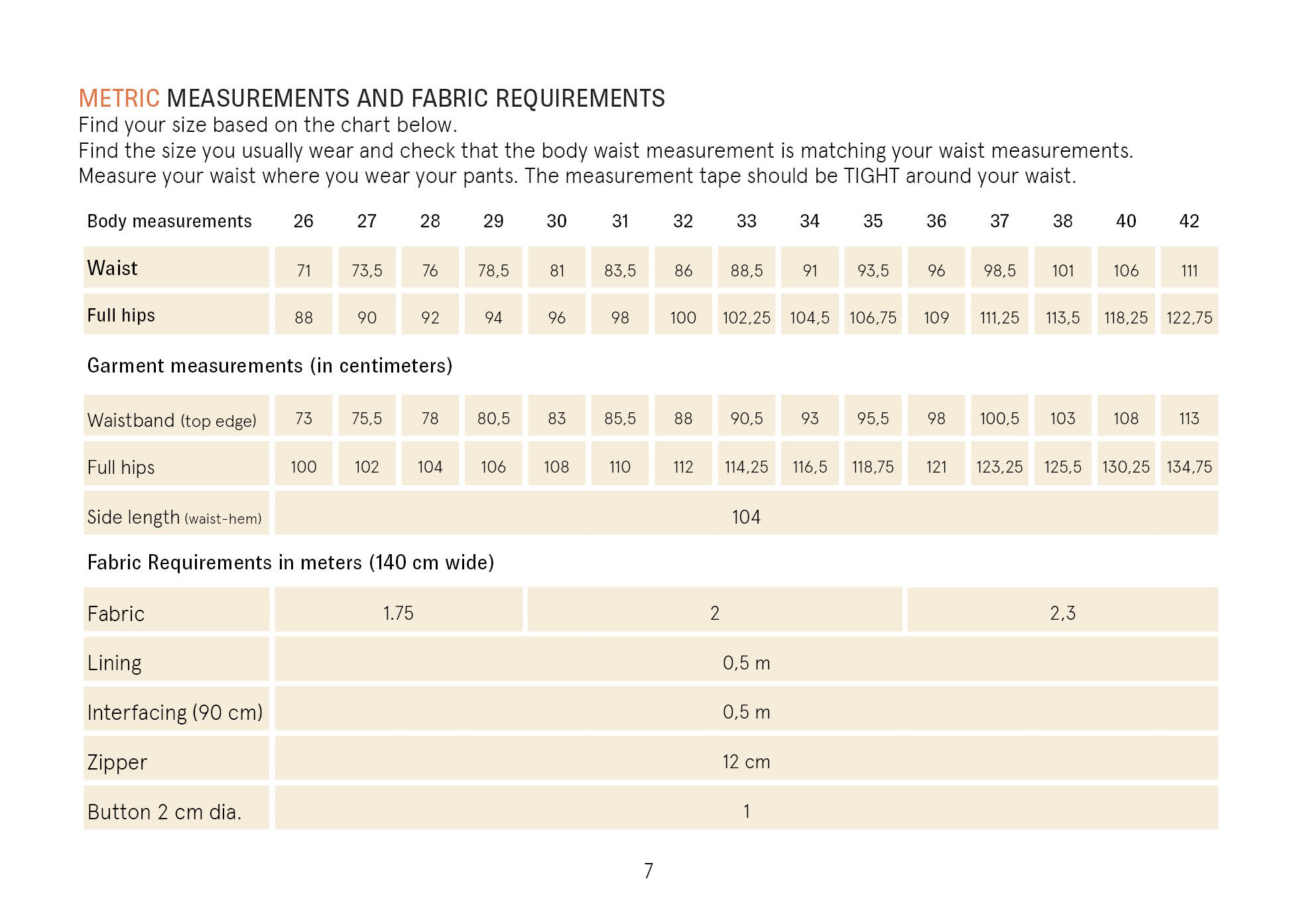 Flip through the images to find fabric requirements and measurements for the Chino pants sewing pattern.