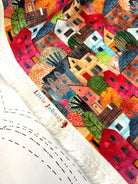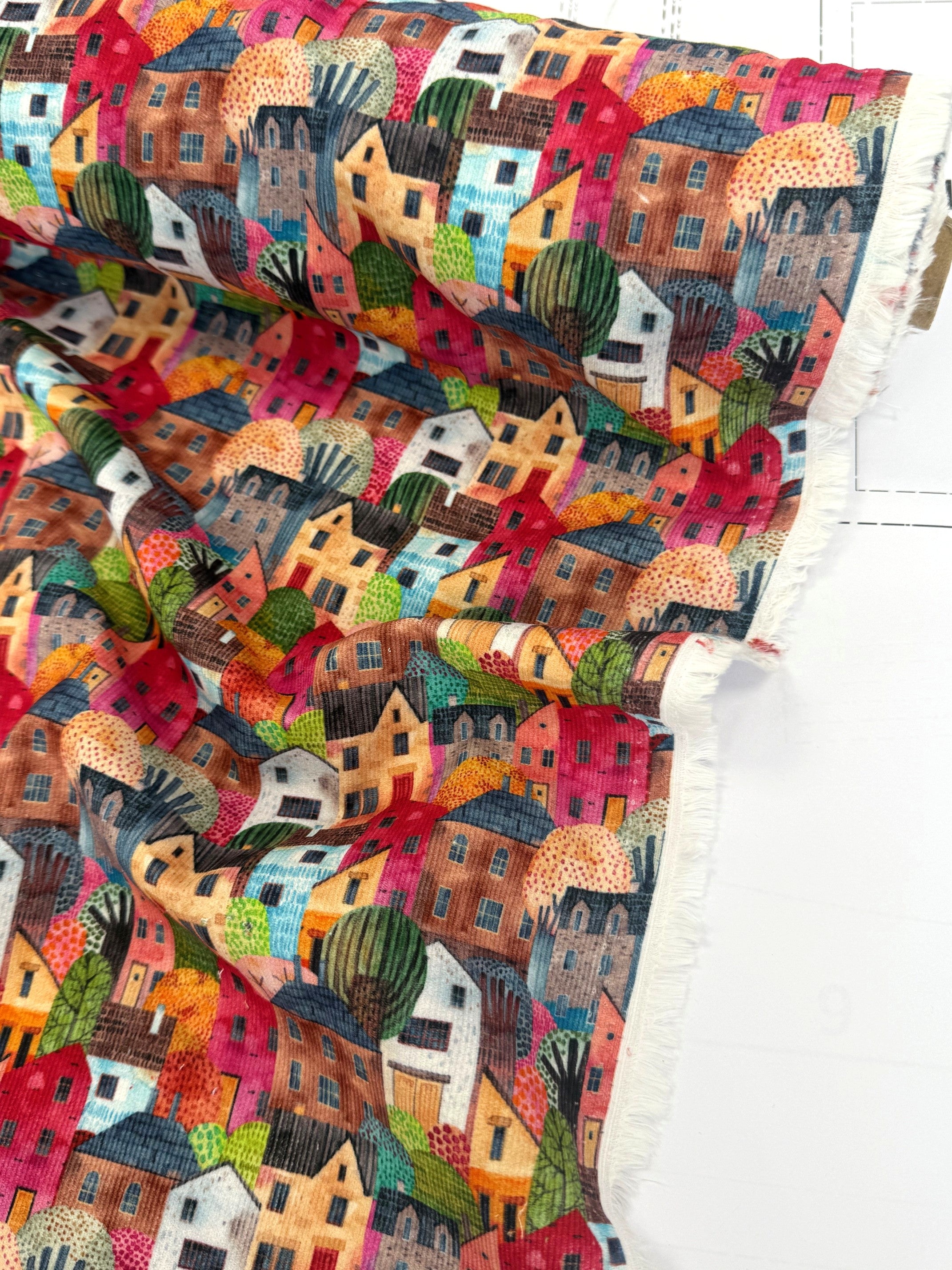 Rows of colourful houses and whimsical trees create a storybook feel in this playful print. Rich tones of teal, mustard, red, and green make it perfect for unique dresses, tunics, or children’s outfits.