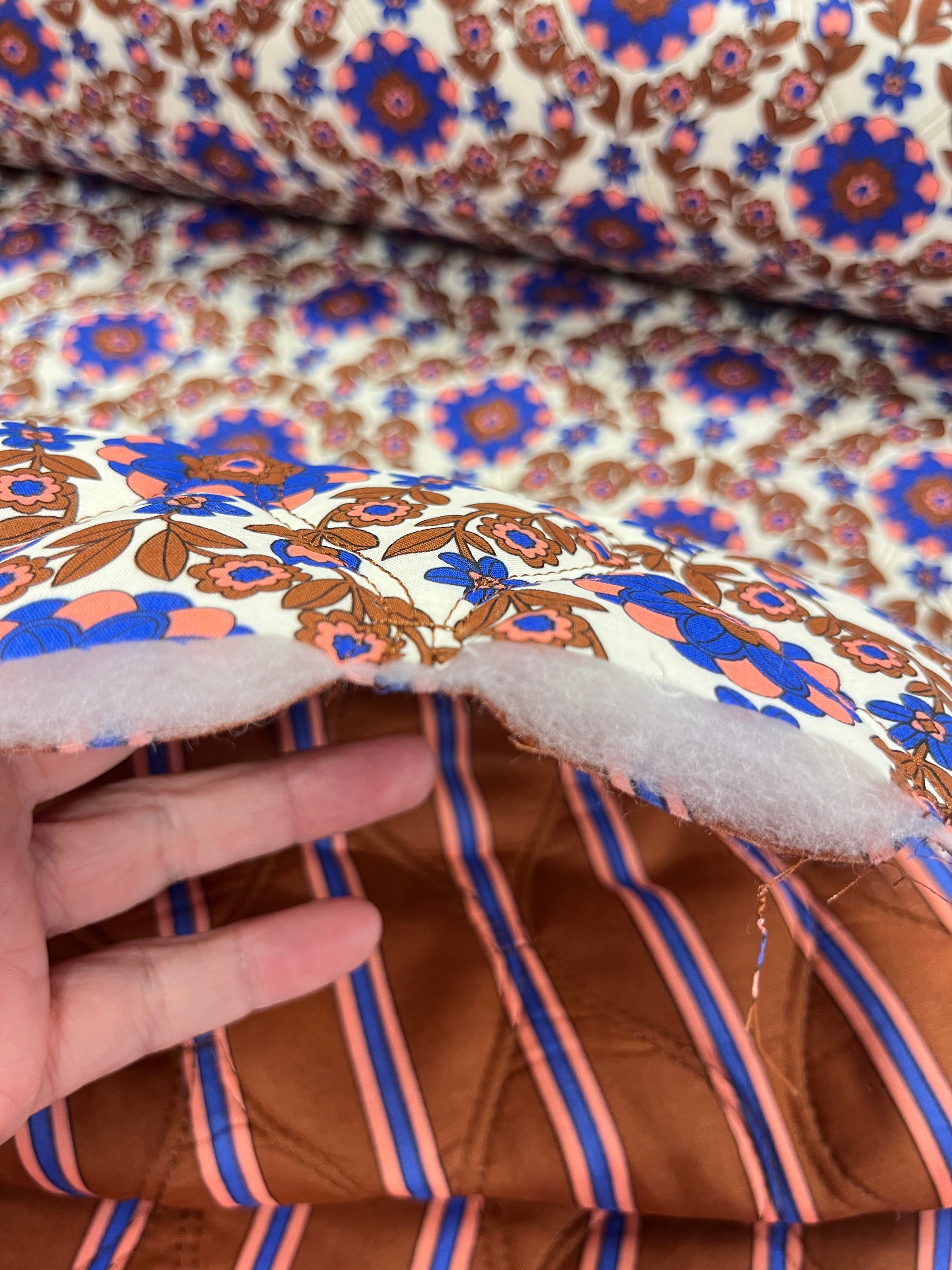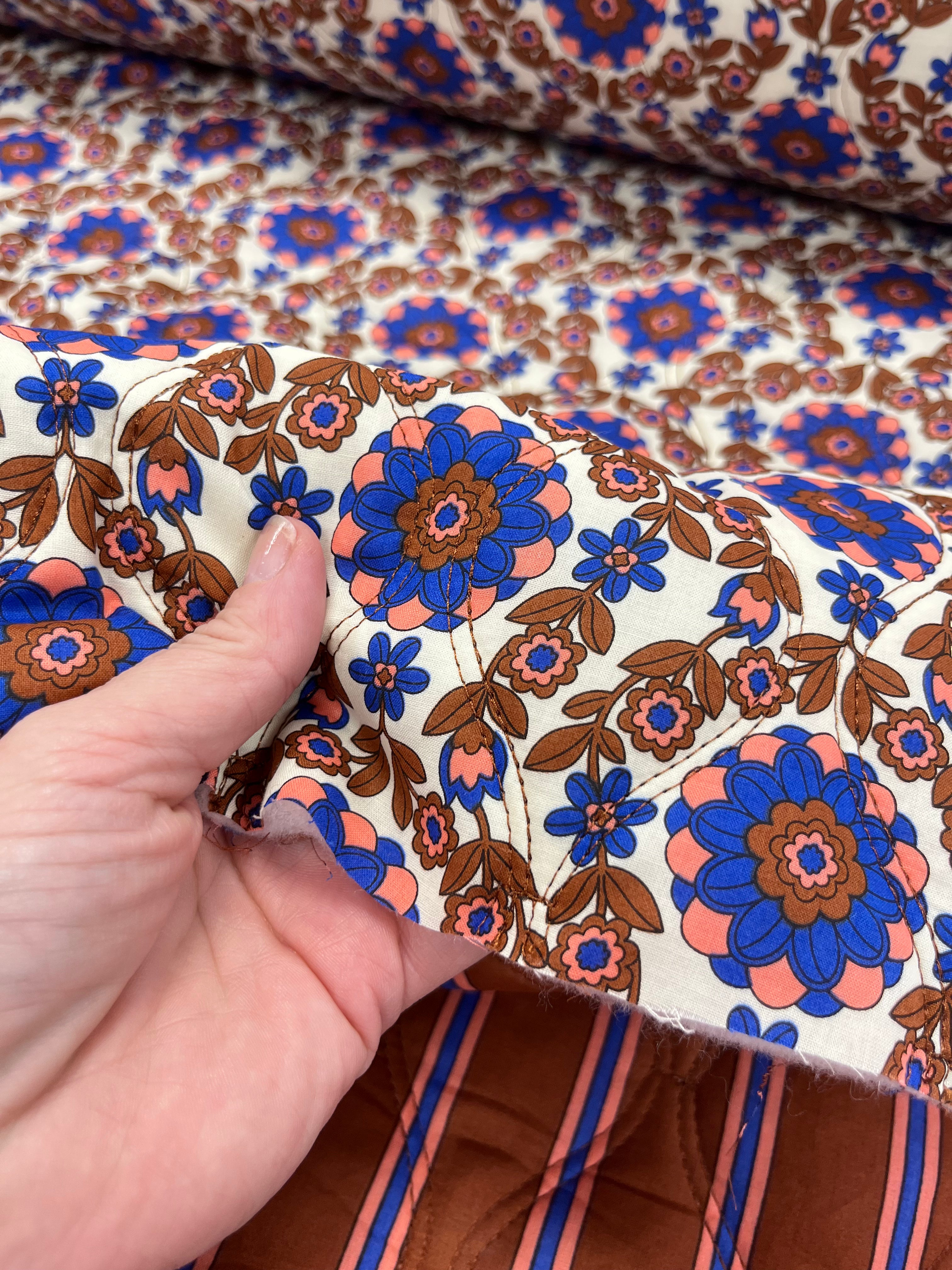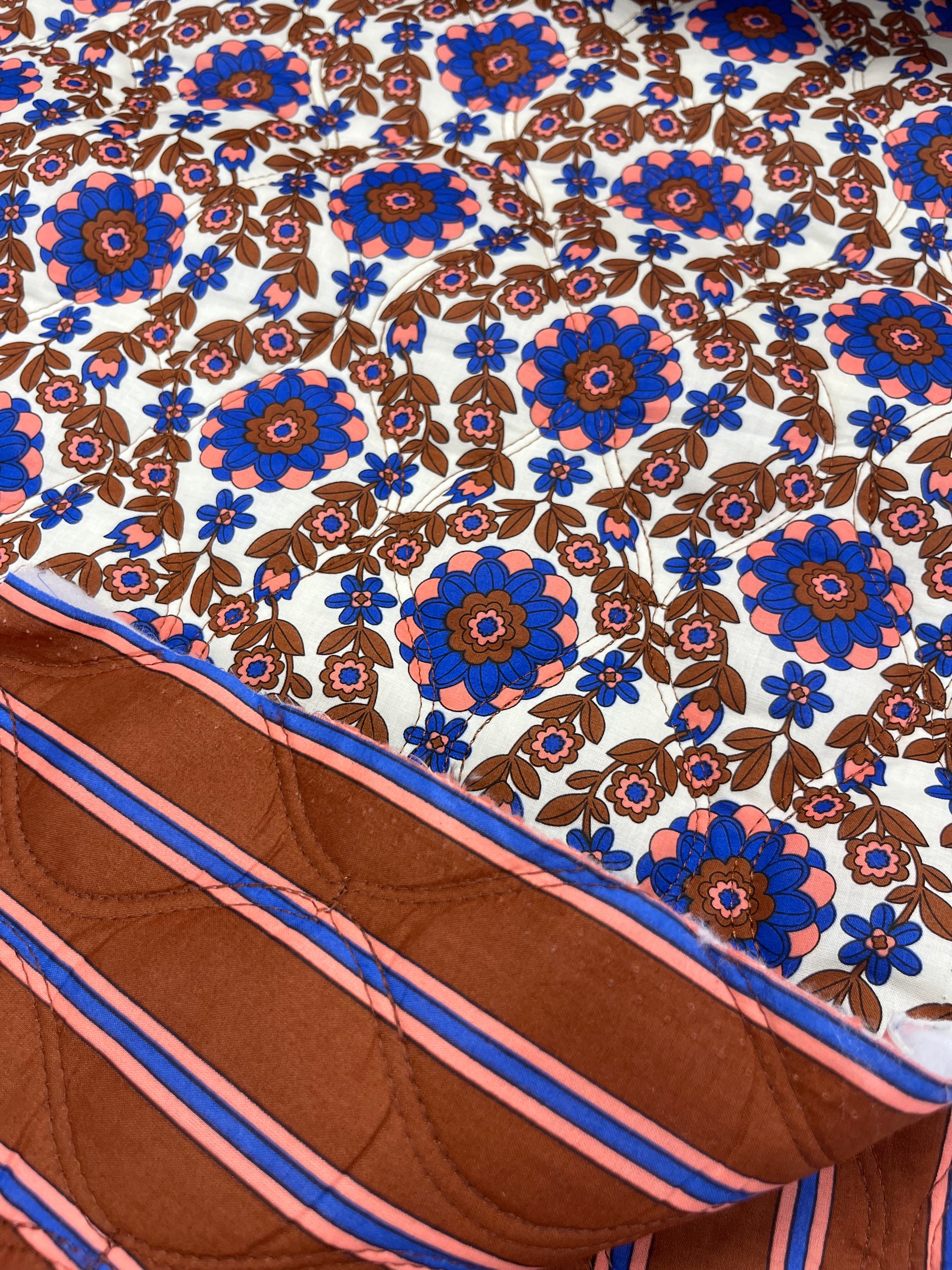 A vibrant, double-sided quilted fabric featuring bold retro florals on one side and striking stripes on the other. Lightly padded for warmth and structure, this fabric is perfect for creating statement jackets, gilets, vests, and outerwear with a fun vintage twist. Use either side as the feature, or showcase both for a fully reversible look.