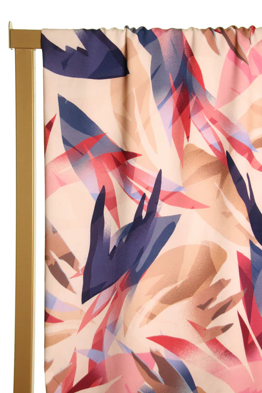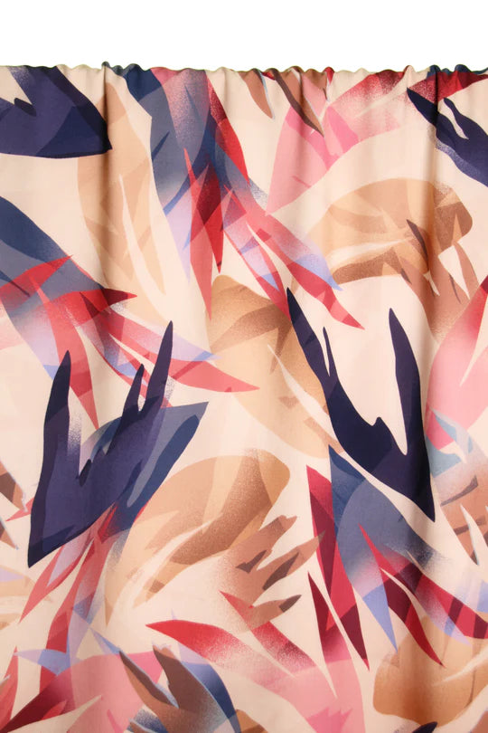 An off-white viscose with a print of colourful leaves. This fabric is perfect for blouses, dresses, skirts... There is also a black variant of this design.