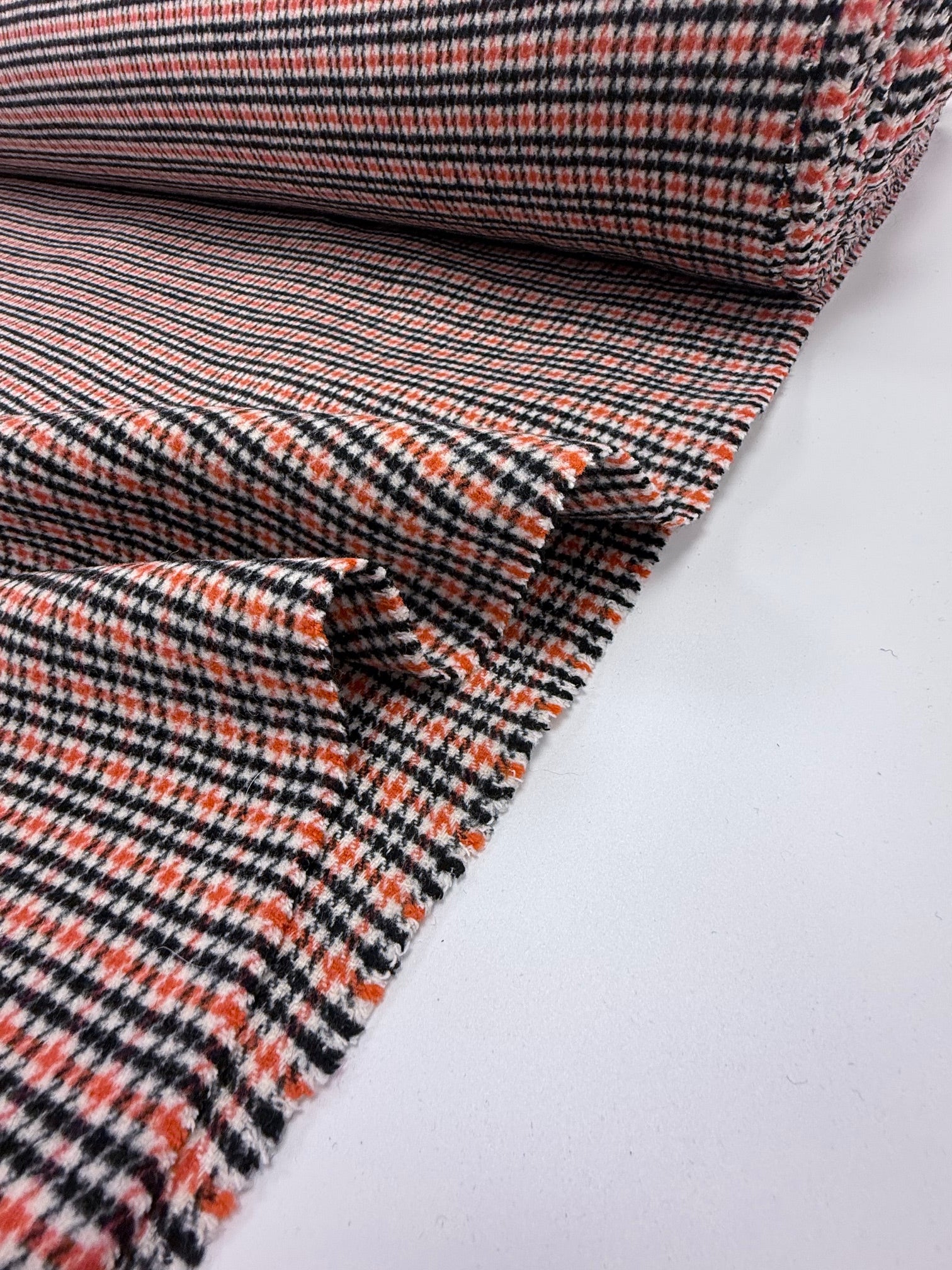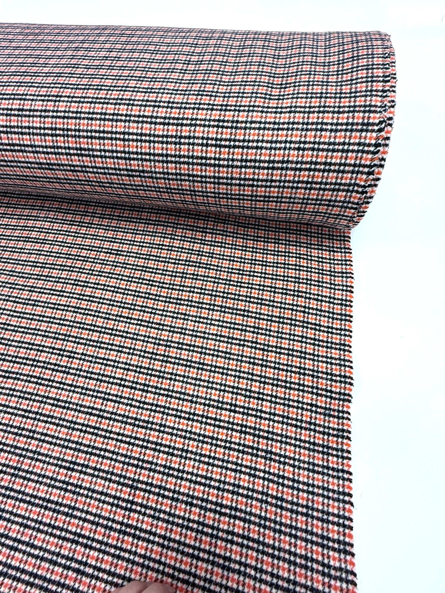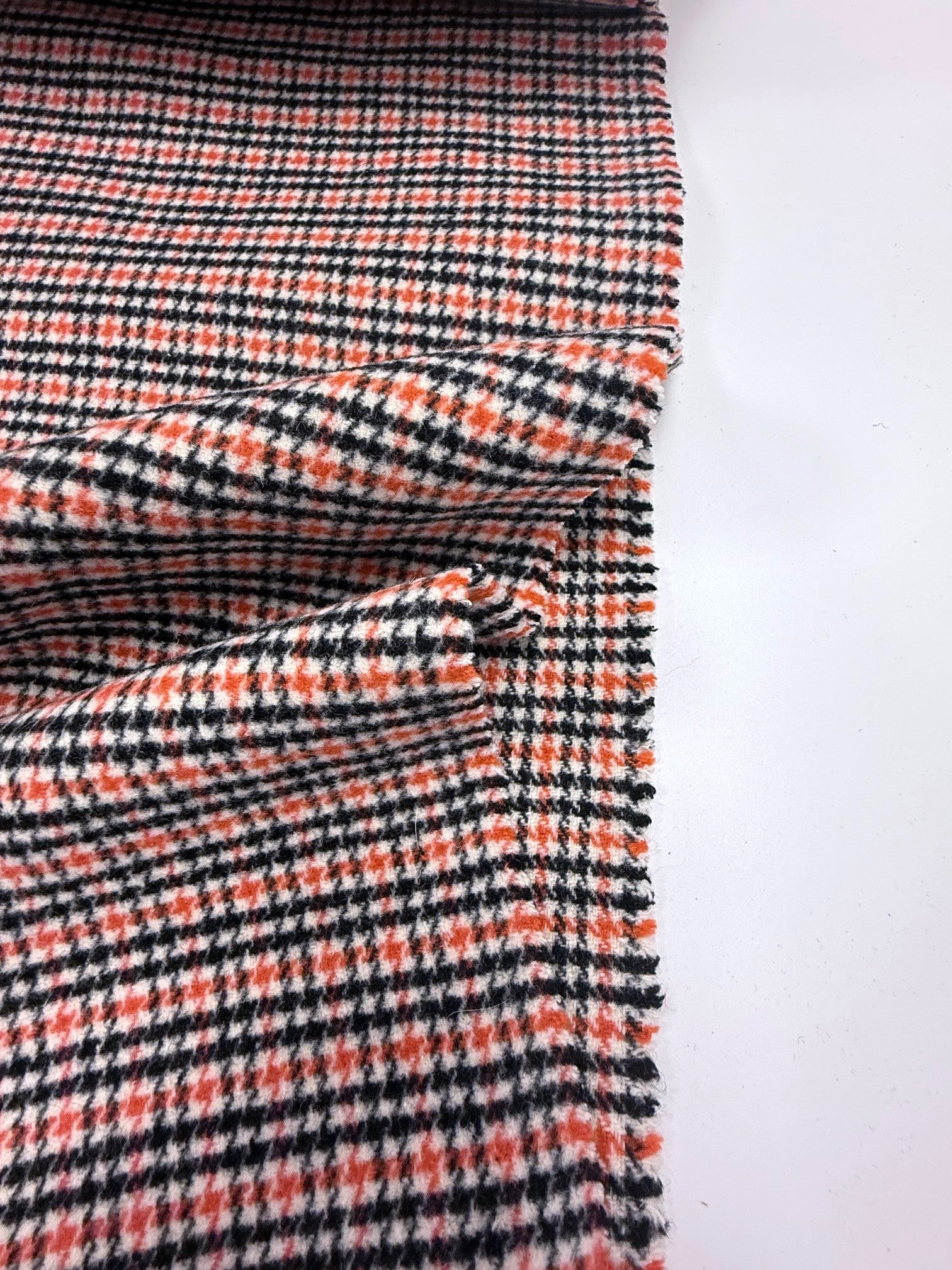 A bold and stylish houndstooth check fabric in black, orange and cream. With a soft, brushed finish and cosy feel, it’s perfect for making statement coats, jackets, skirts or capes. This fabric has a classic pattern with a modern twist, ideal for eye-catching autumn and winter makes.