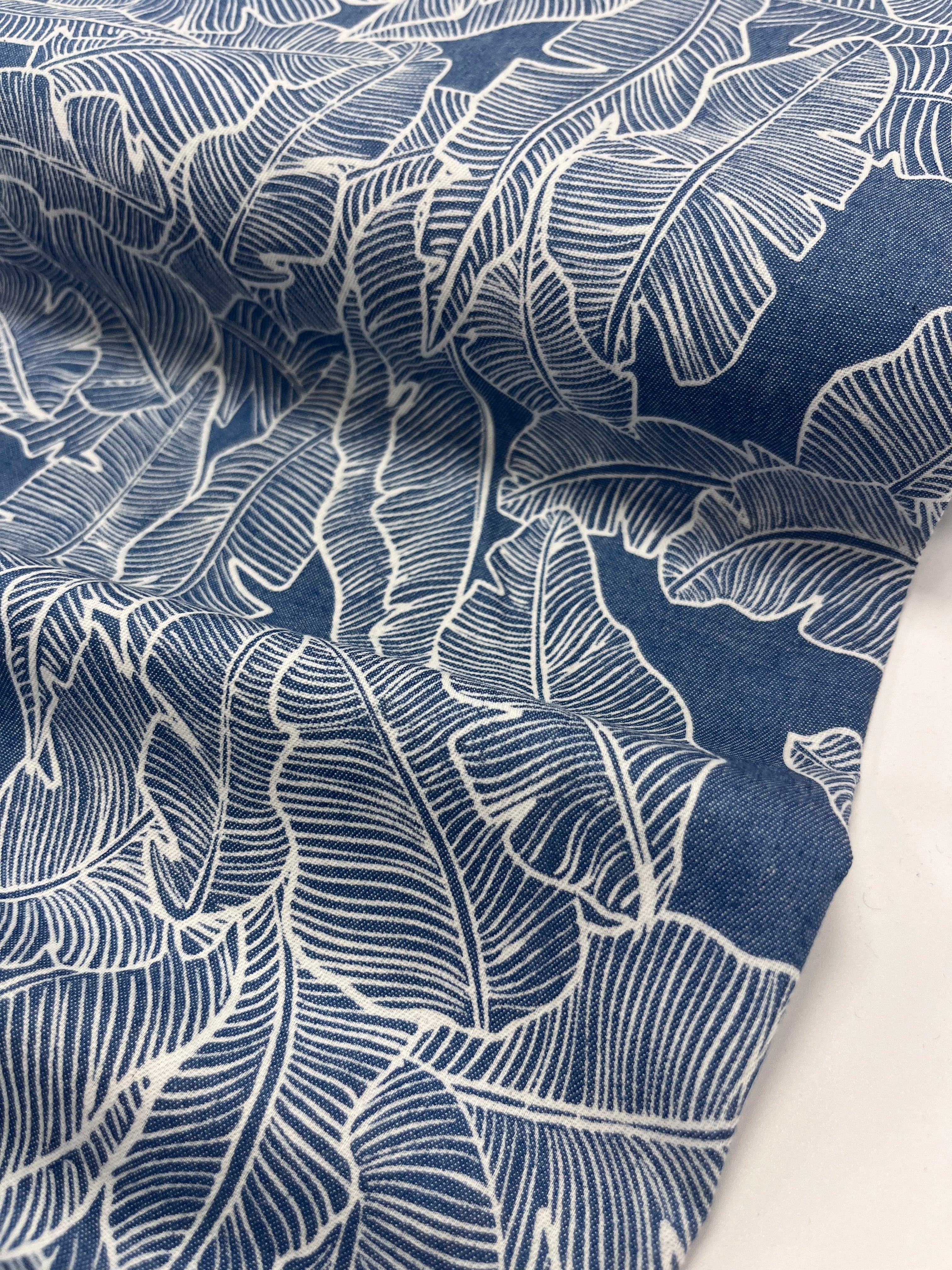 This lightweight indigo denim features a charming all-over leaf print, making it a playful choice for shirts, dresses, or skirts. Its soft texture and breathable feel ensure comfort while adding a touch of nature-inspired fun to your wardrobe creations. Perfect for those who love a fresh, stylish twist on classic denim!