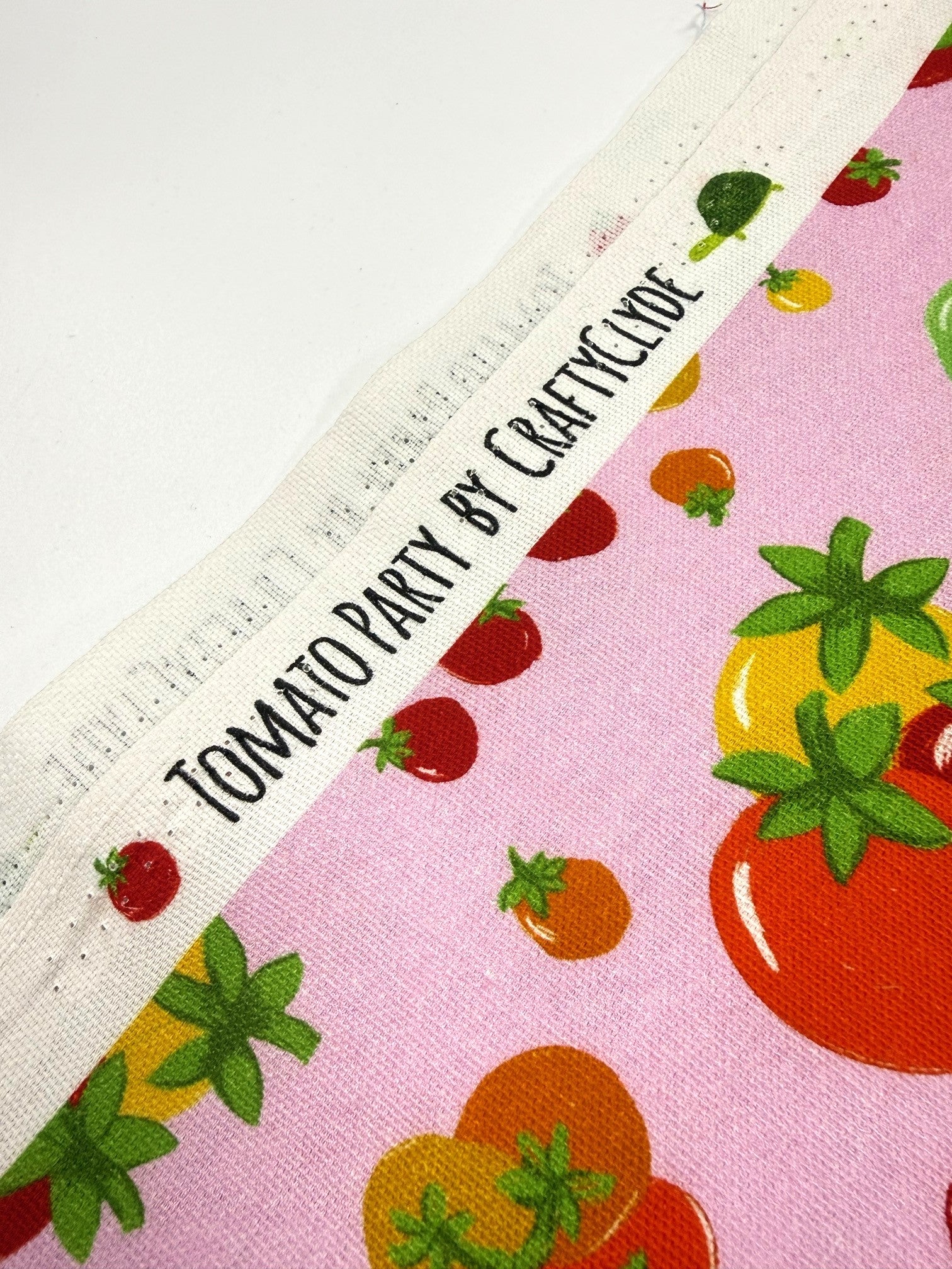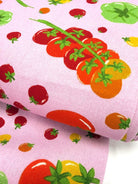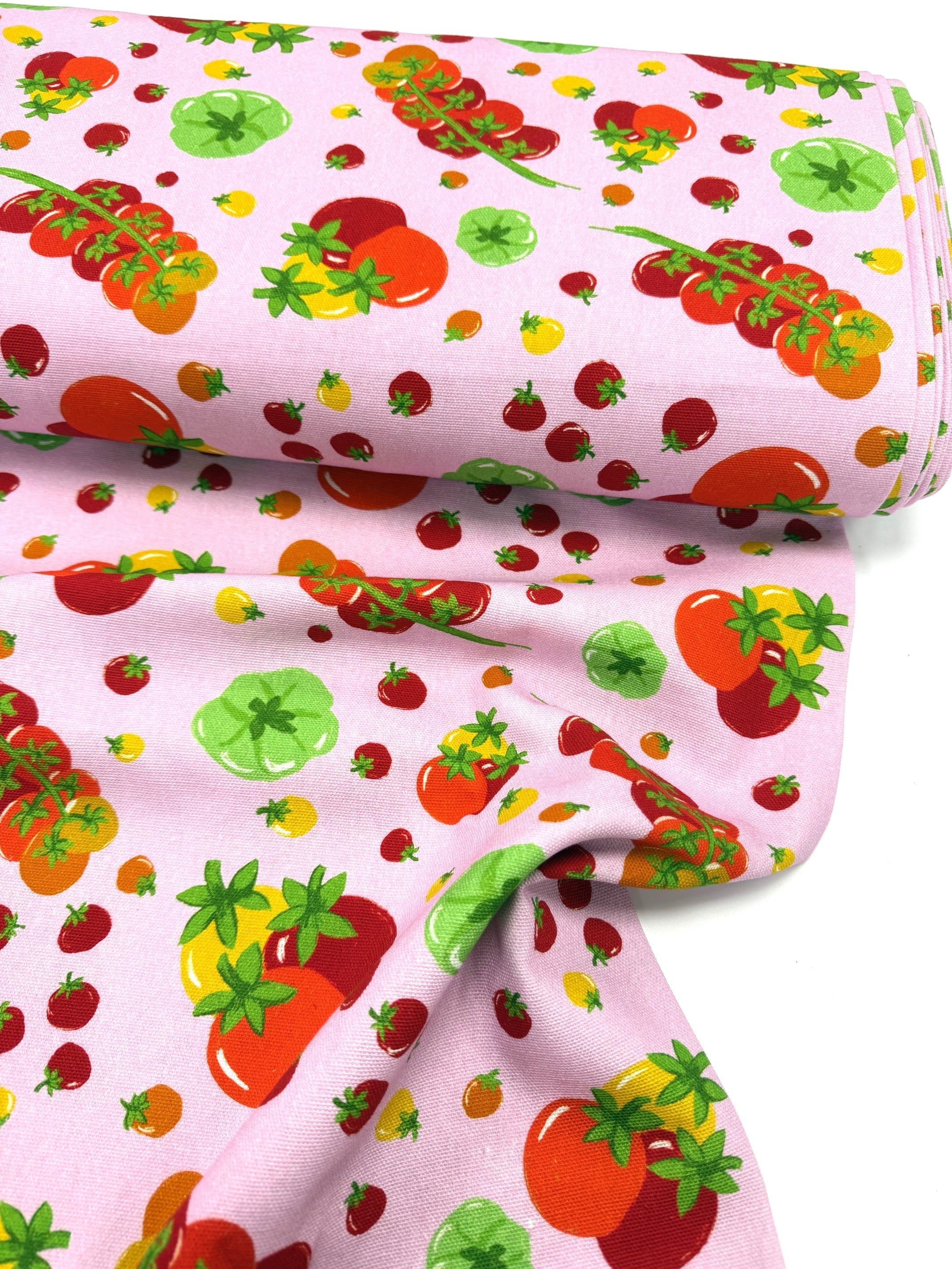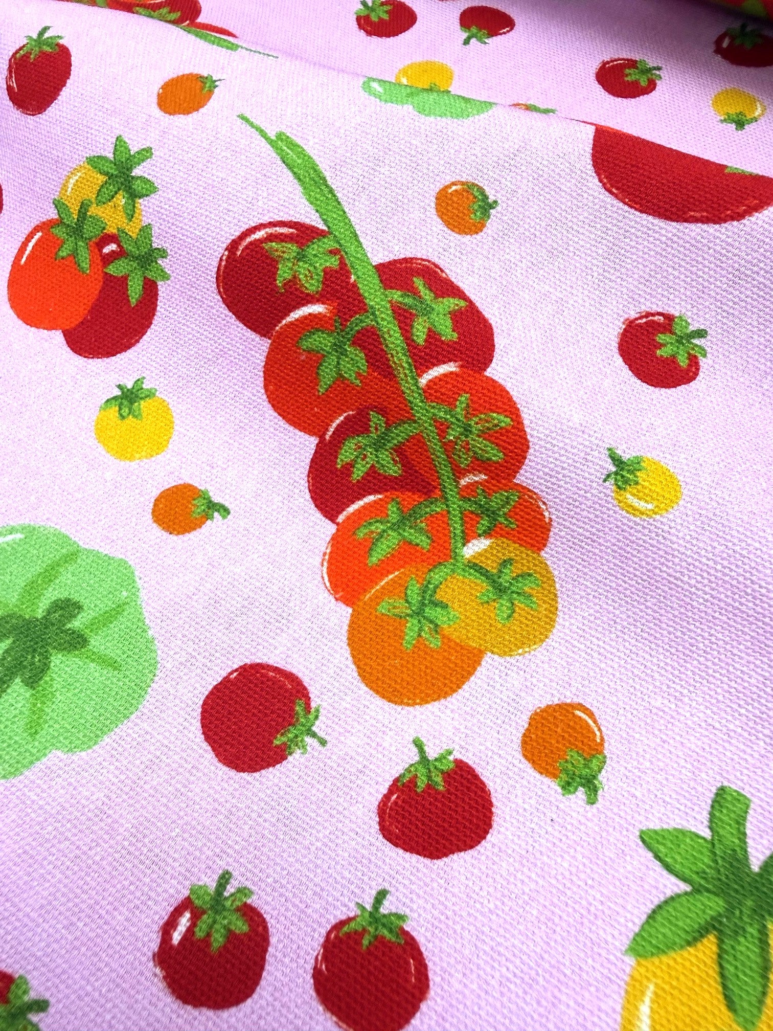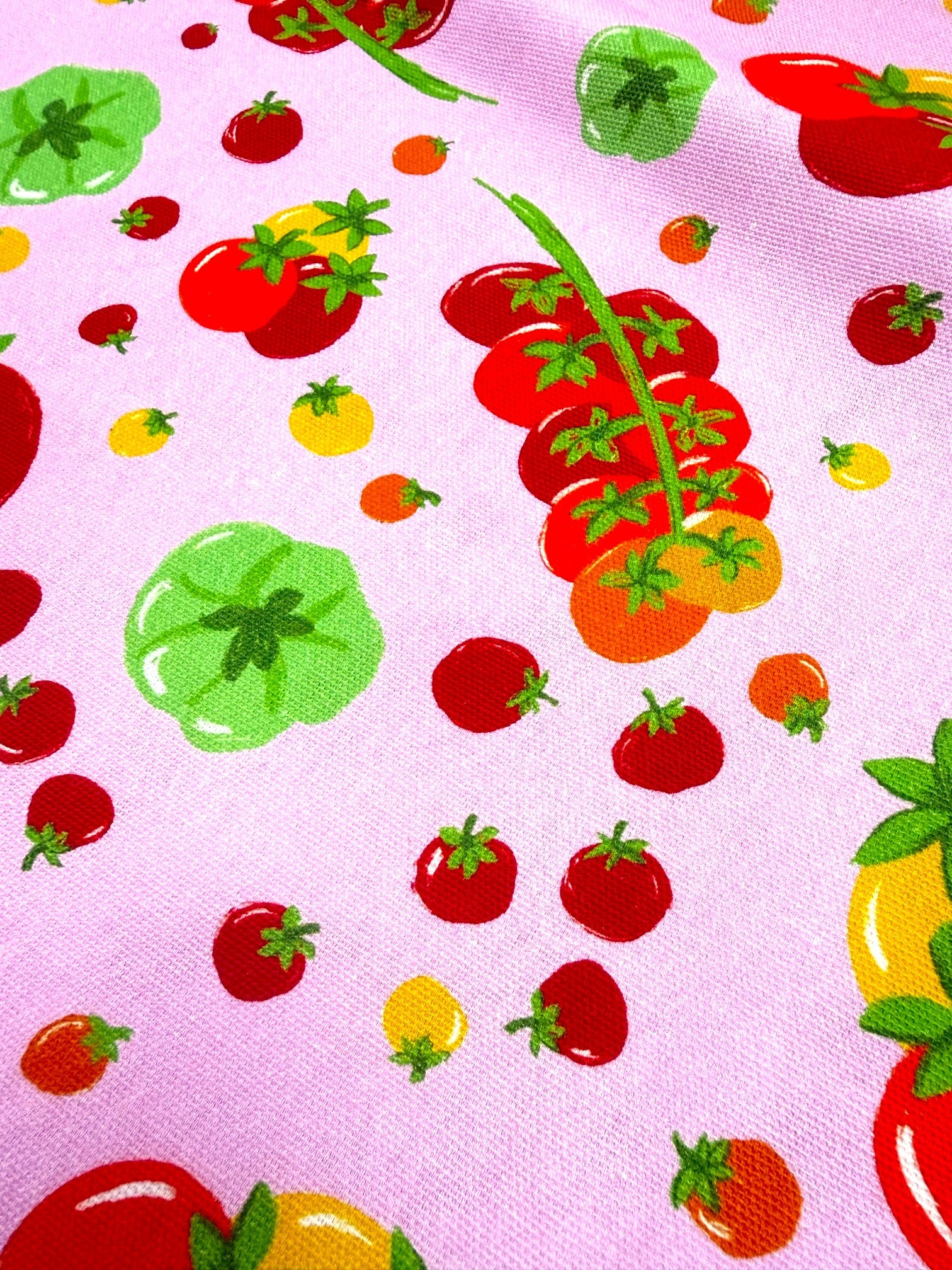 The bold hand-drawn design showcases juicy red, yellow, green, and orange tomatoes scattered across a sturdy cotton base. Perfect for adding a pop of personality to your handmade wardrobe or accessories!