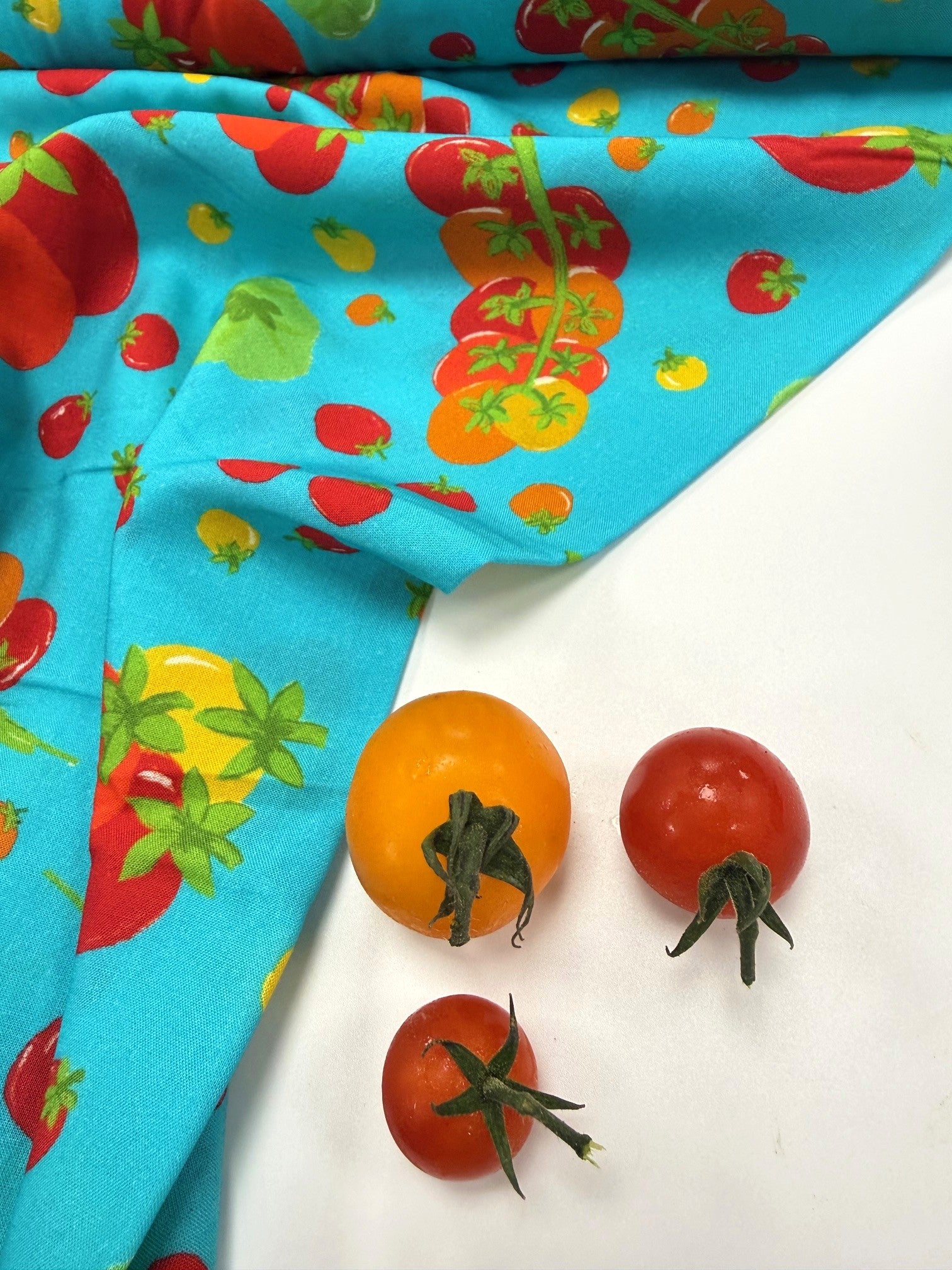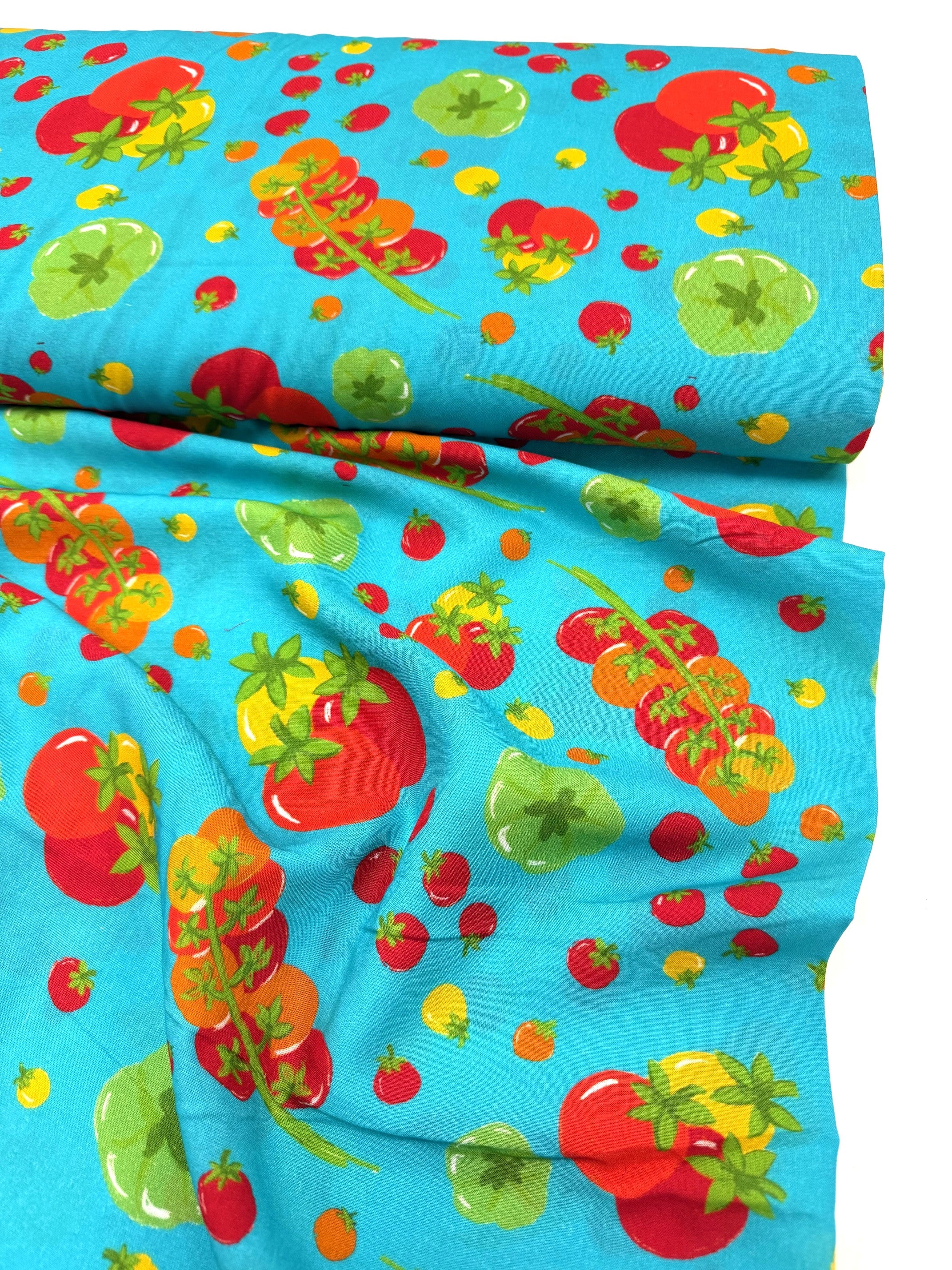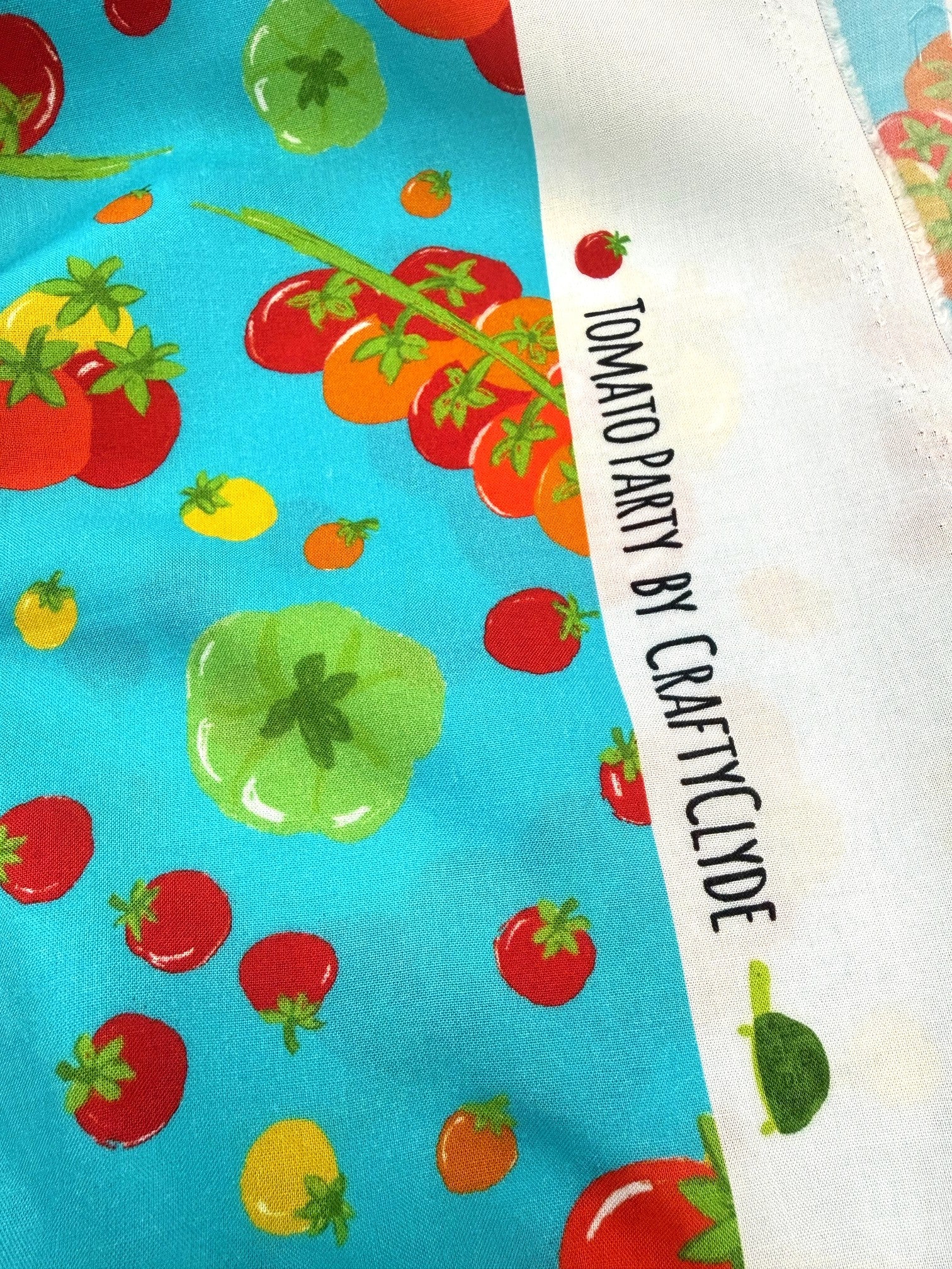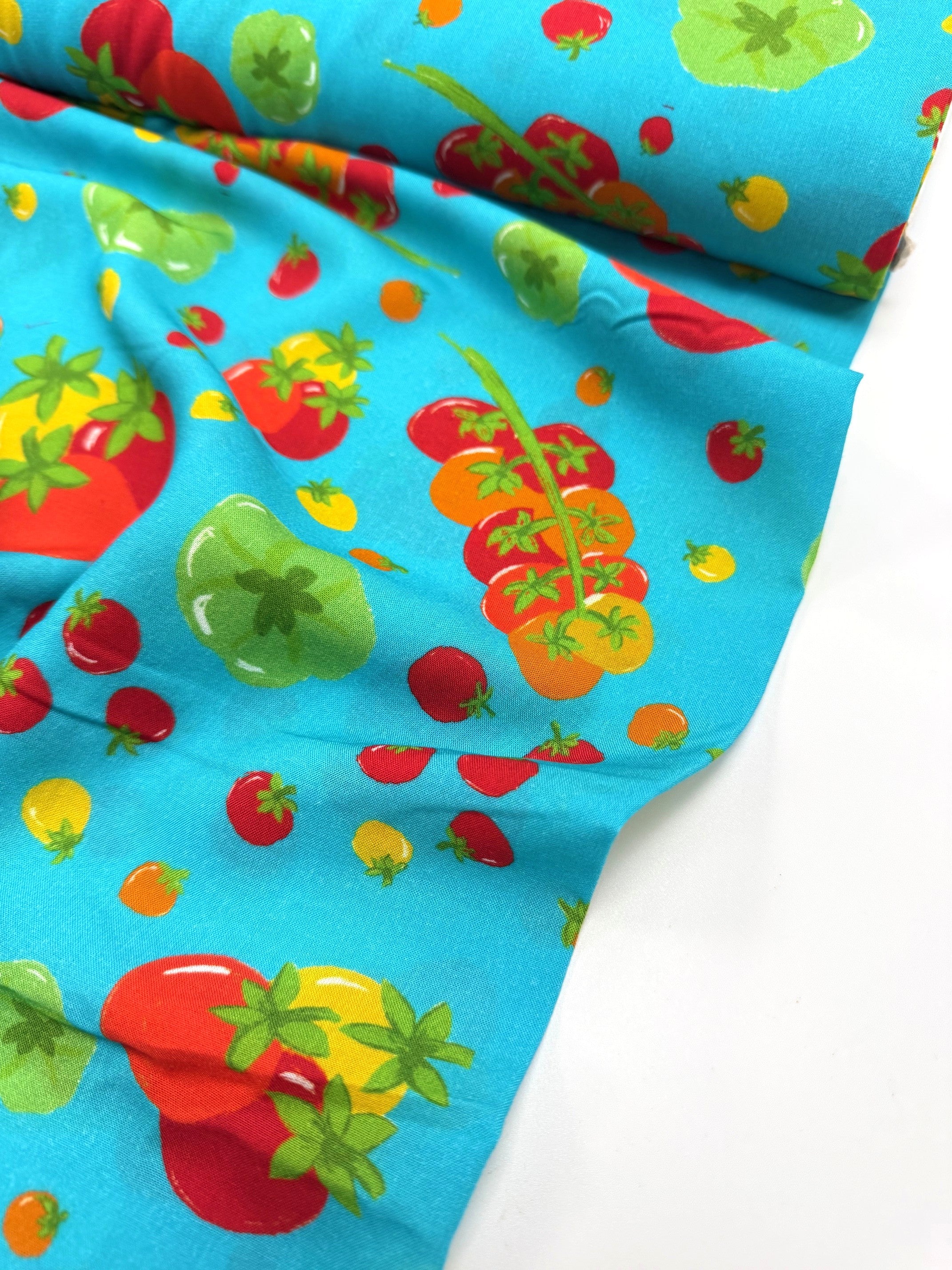 Fresh, fun, and full of colour! Designed by Emma (Craftyclyde on Instagram), this Tomato Party viscose is bursting with fruity charm. Juicy red, yellow, green, and orange tomatoes dance across vibrant backgrounds of turquoise, pink, or cobalt blue.
