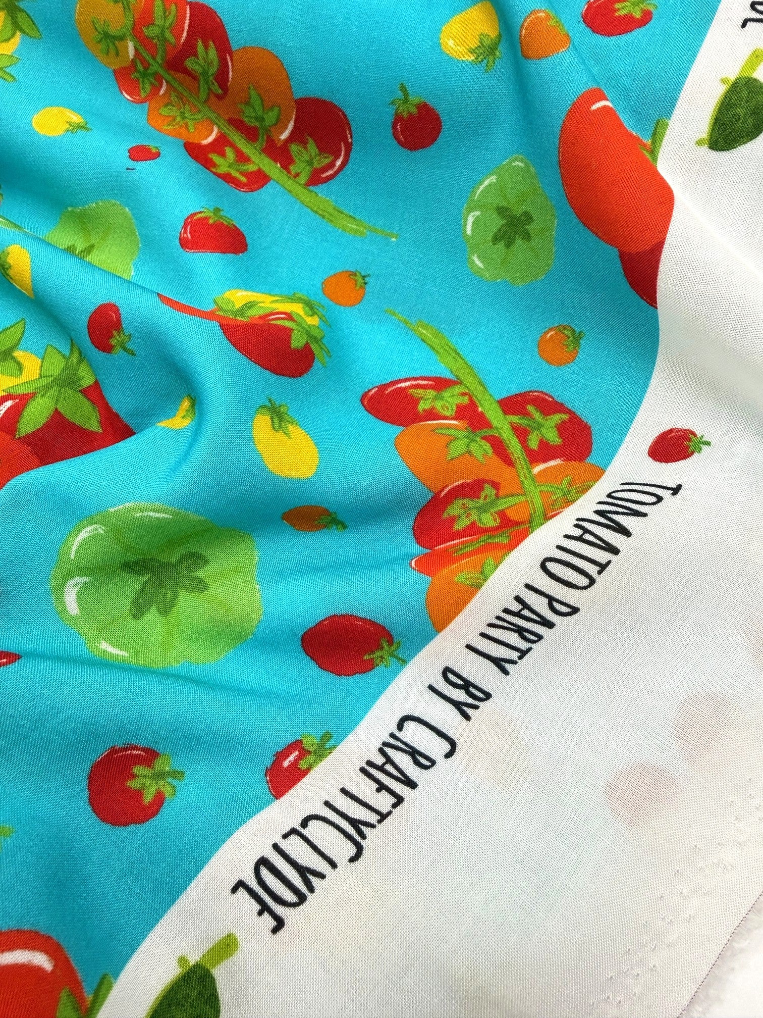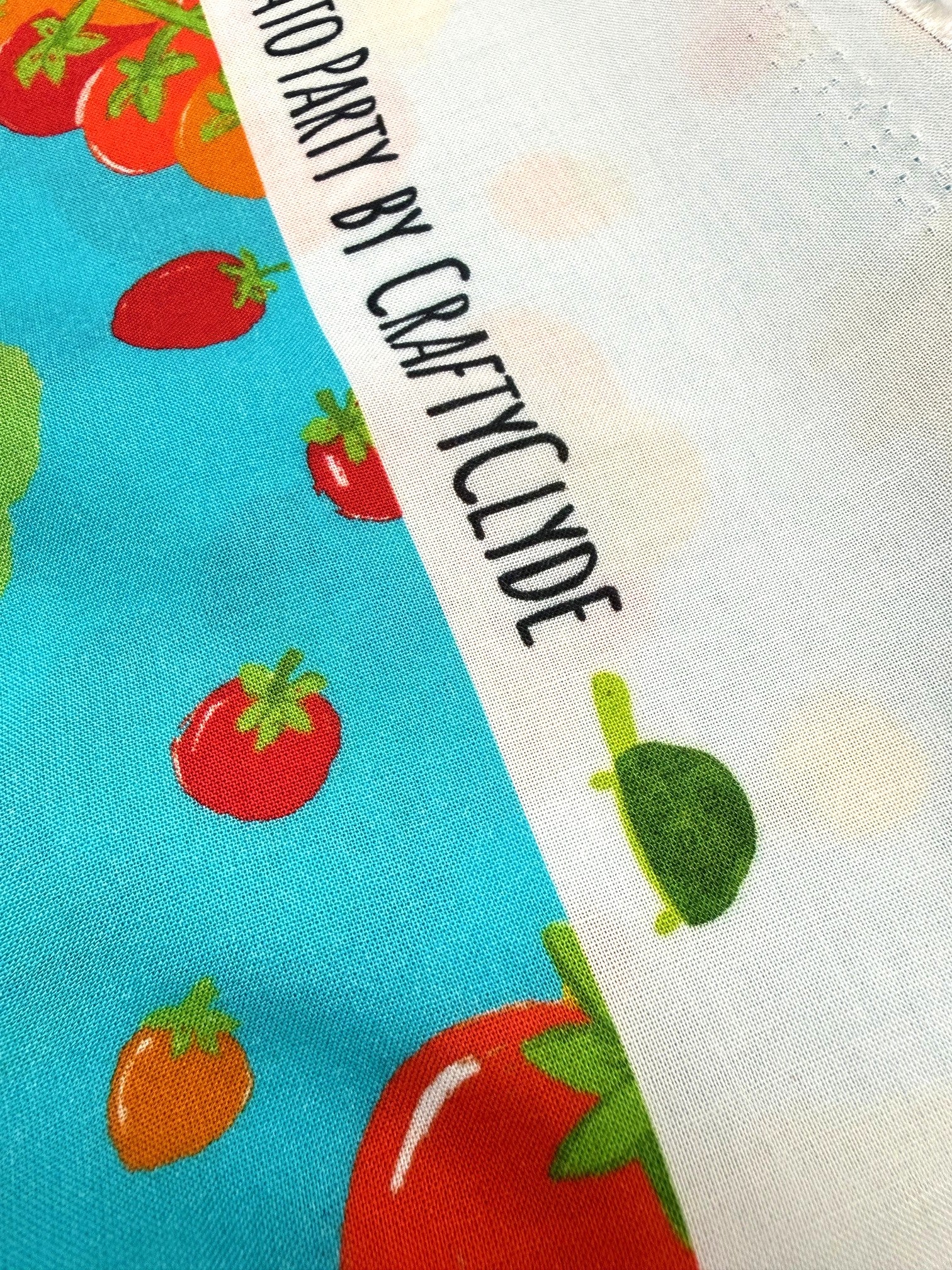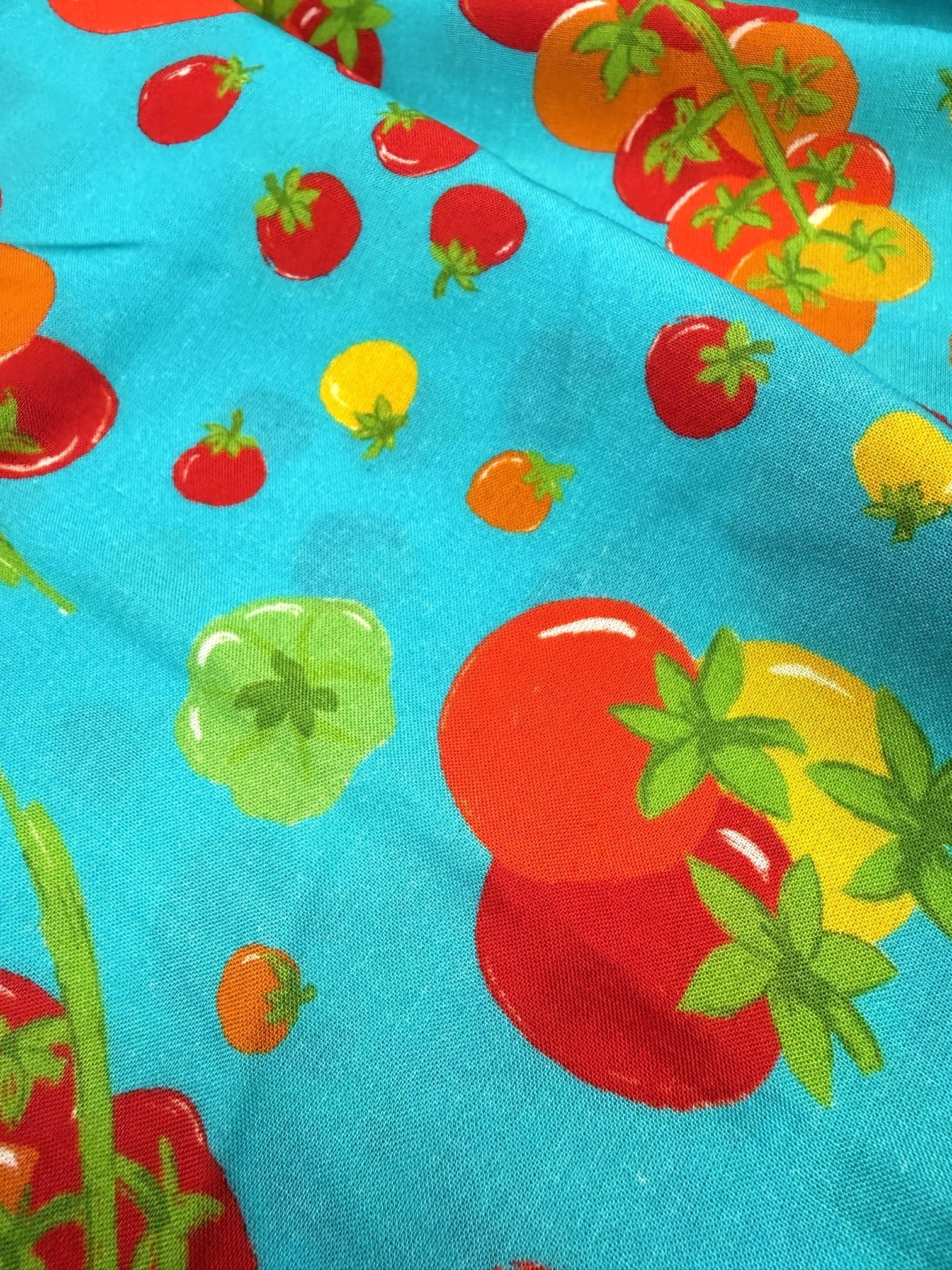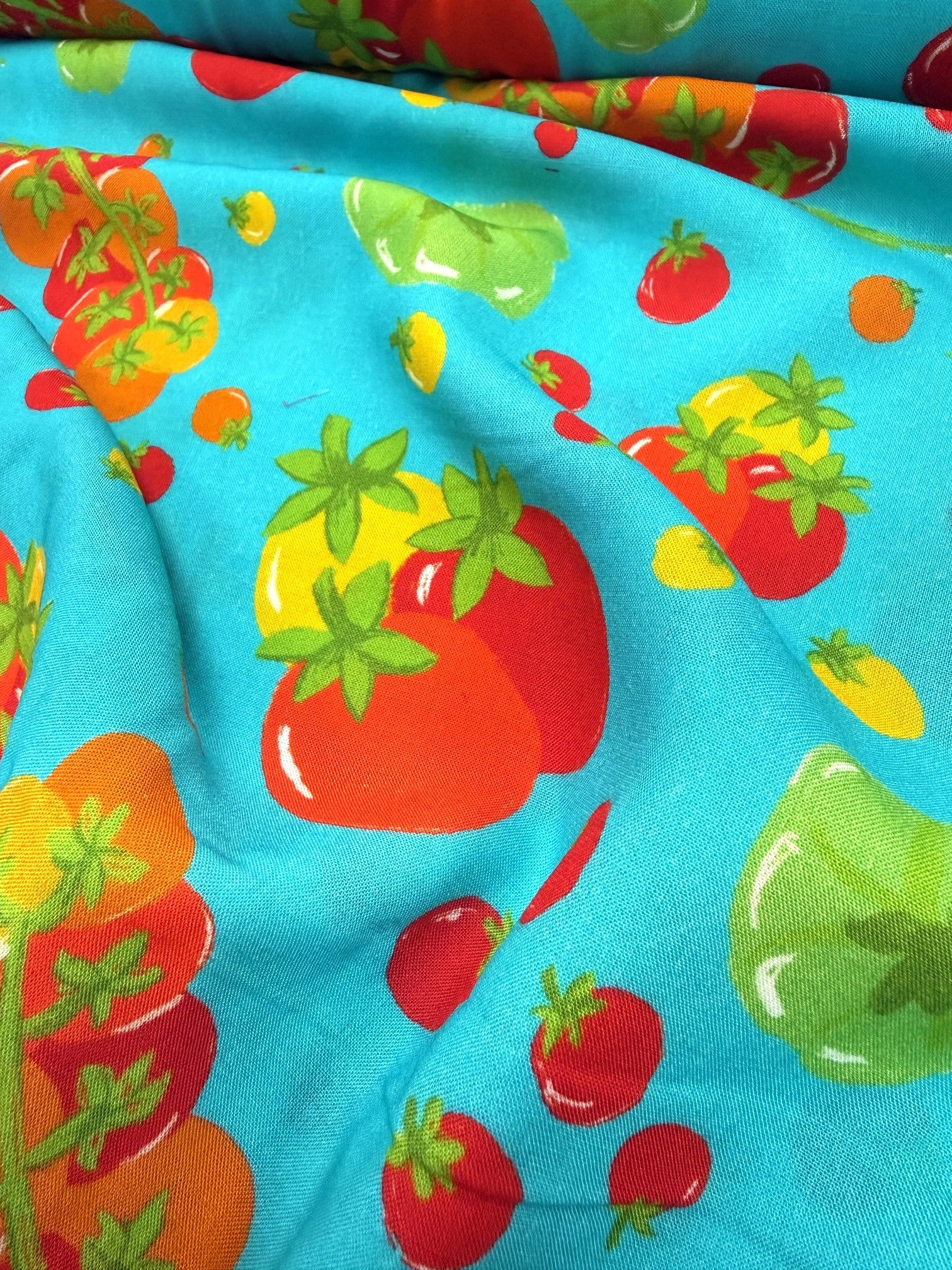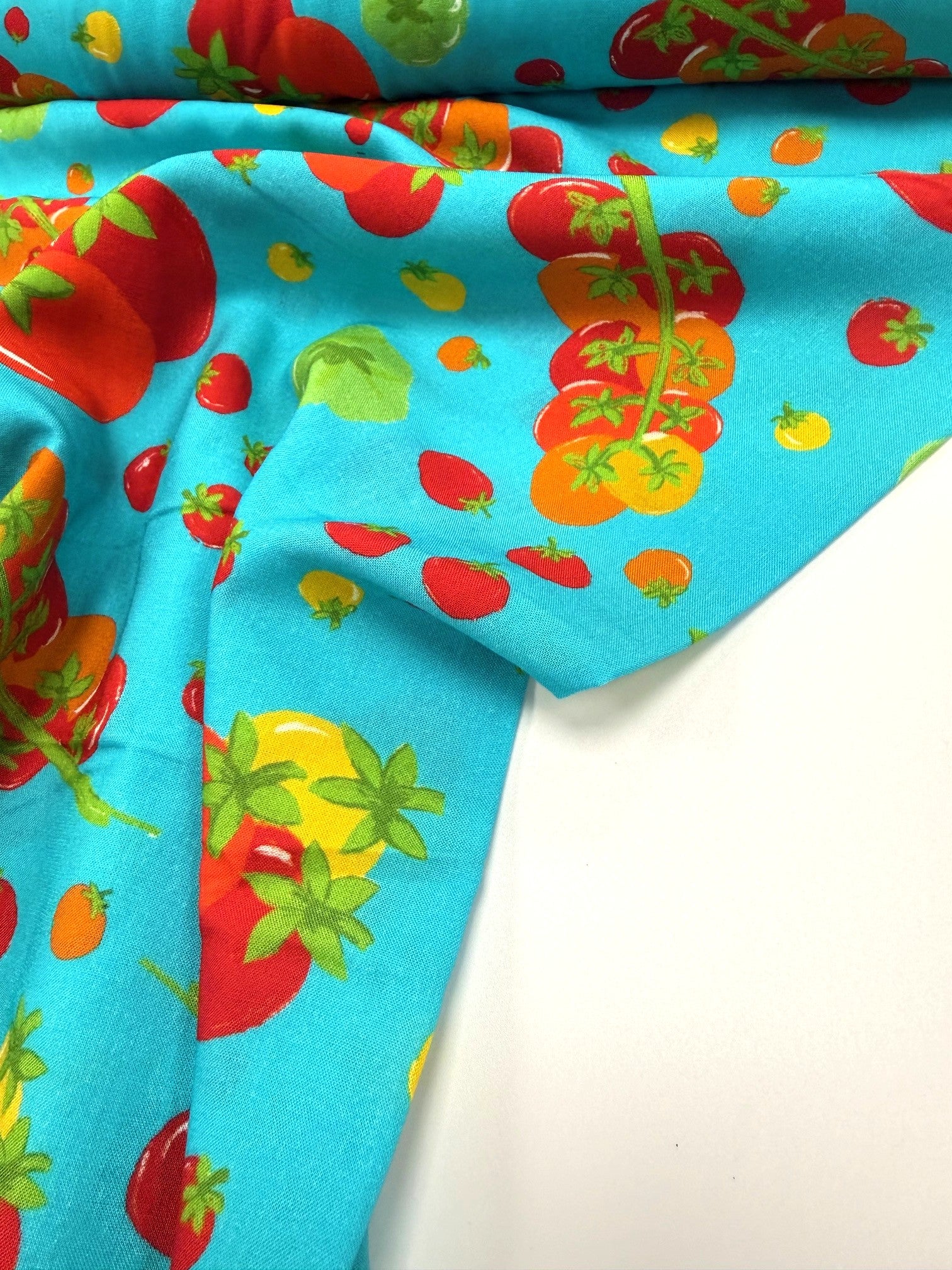 Fresh, fun, and full of colour! Designed by Emma (Craftyclyde on Instagram), this Tomato Party viscose is bursting with fruity charm. Juicy red, yellow, green, and orange tomatoes dance across vibrant backgrounds of turquoise, pink, or cobalt blue.