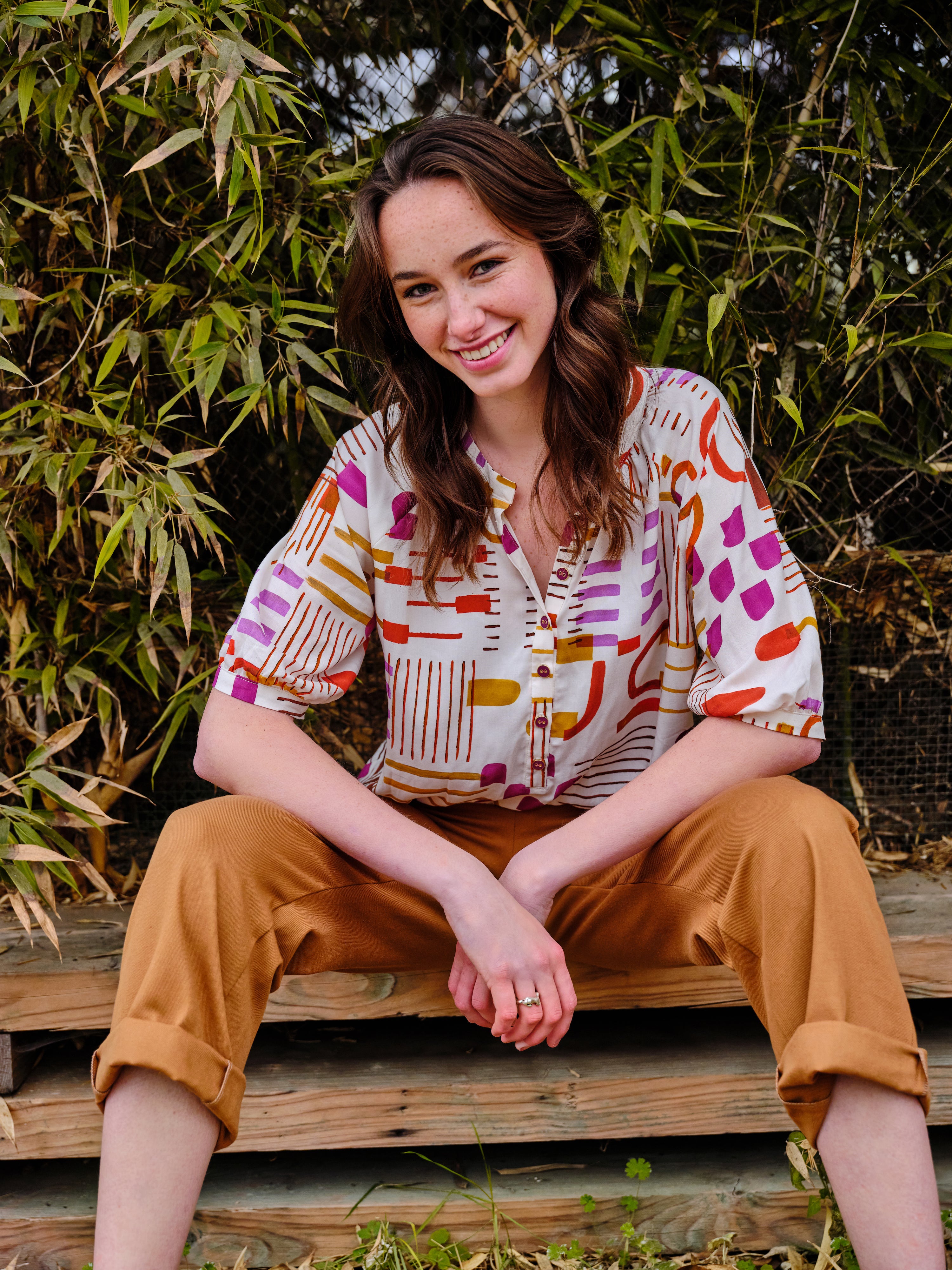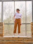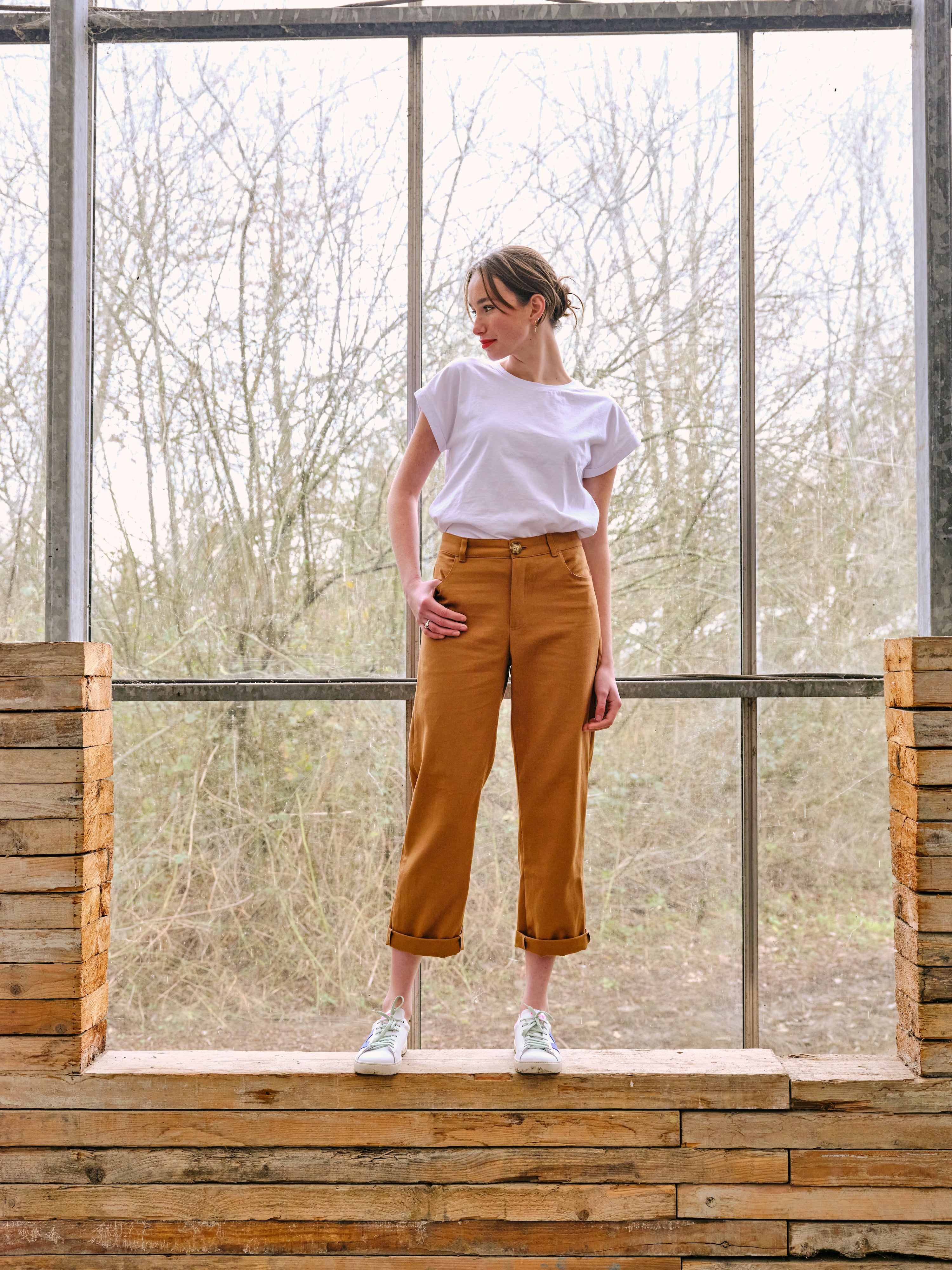 Frankie is a trendy pair of trousers that sits a little below the waist and has wide legs. The back yoke and rounded pockets at the front, together with the topstitching, give this pattern a timeless jeans look. Frankie is at its best in medium weight fabrics, to make the most out of the relaxed cut of the pattern. If you roll up the trouser legs, you’ll get a fun, casual look! In short, Frankie is just a perfect day-to-day pair of trousers!