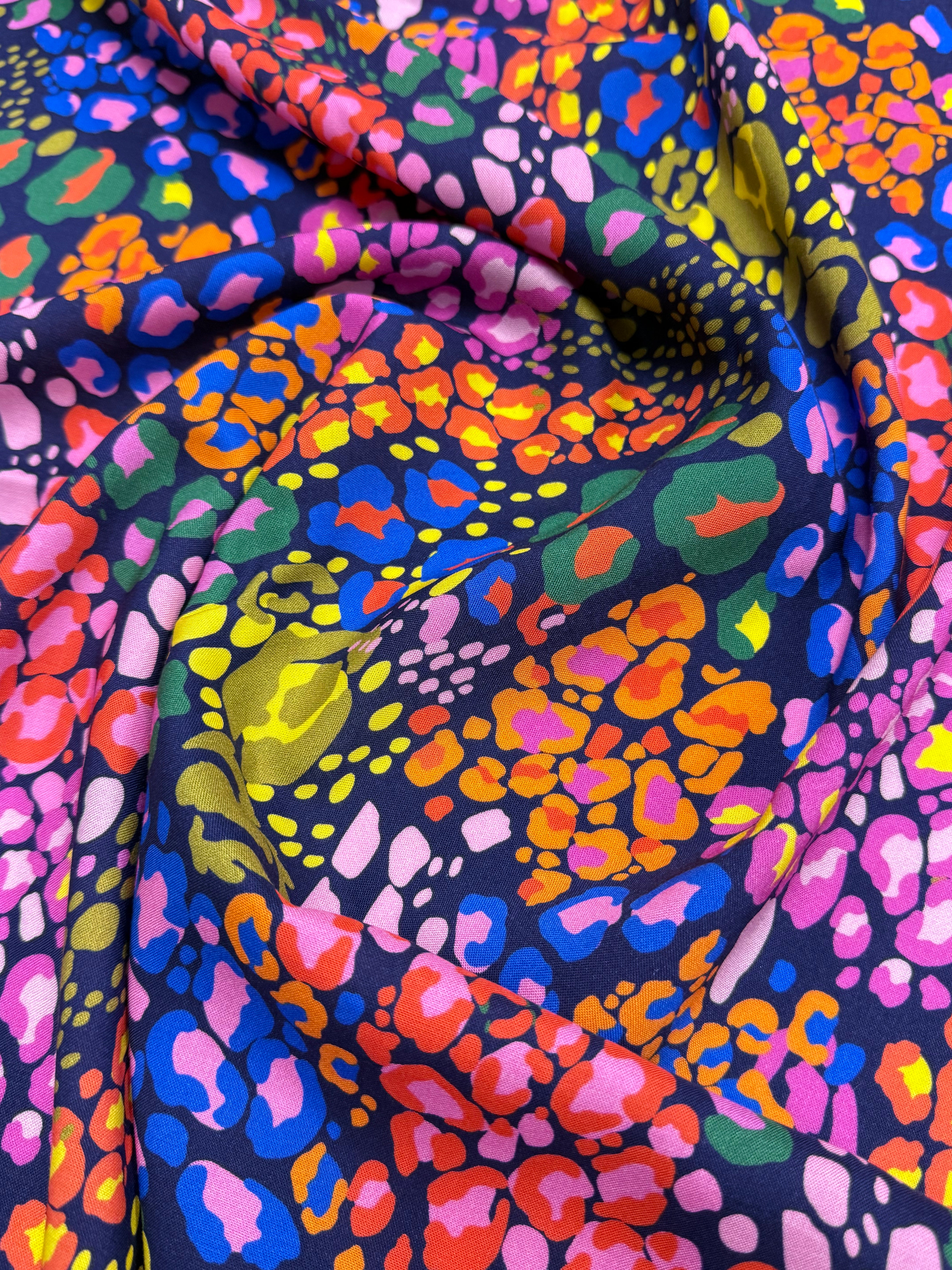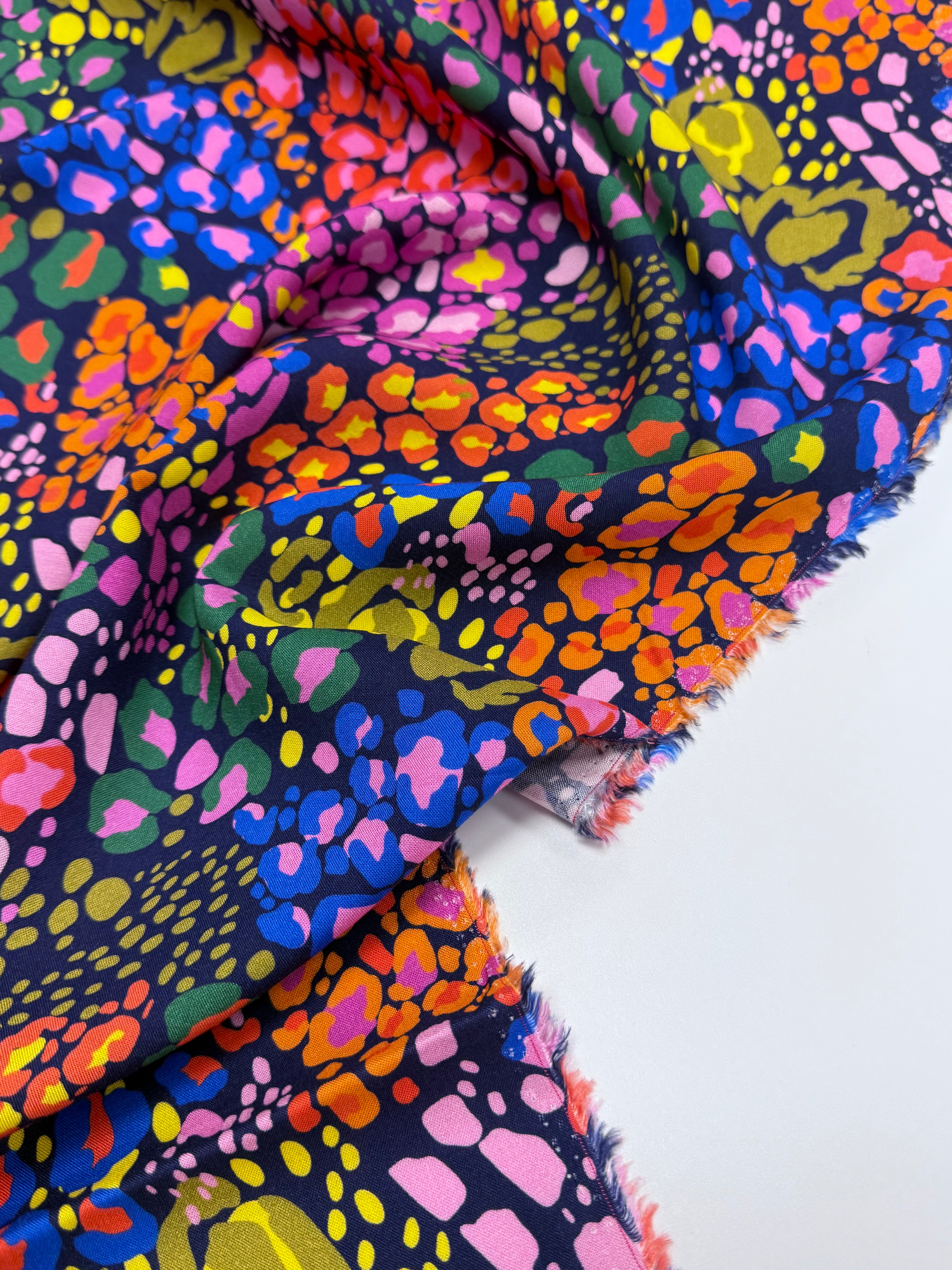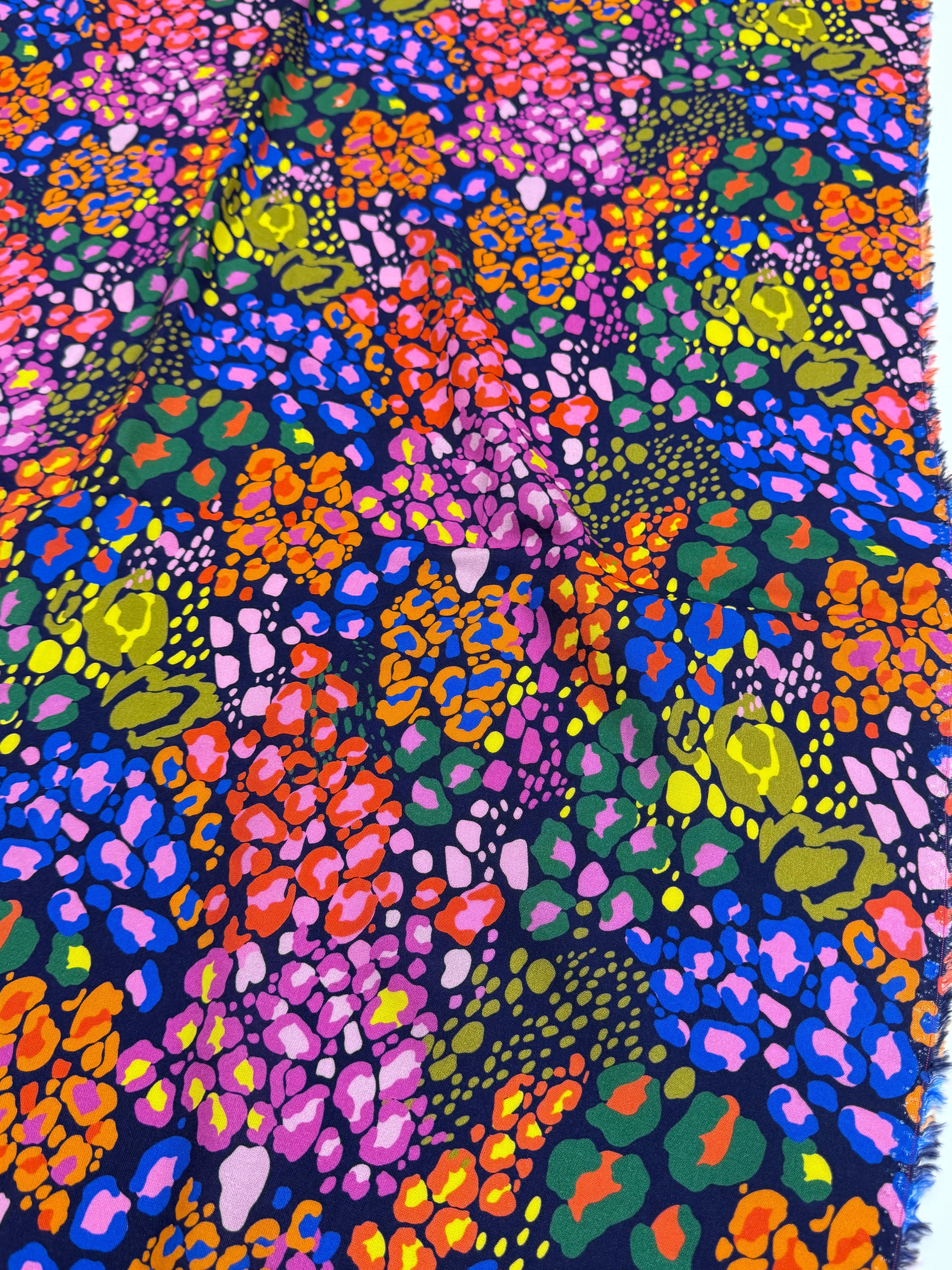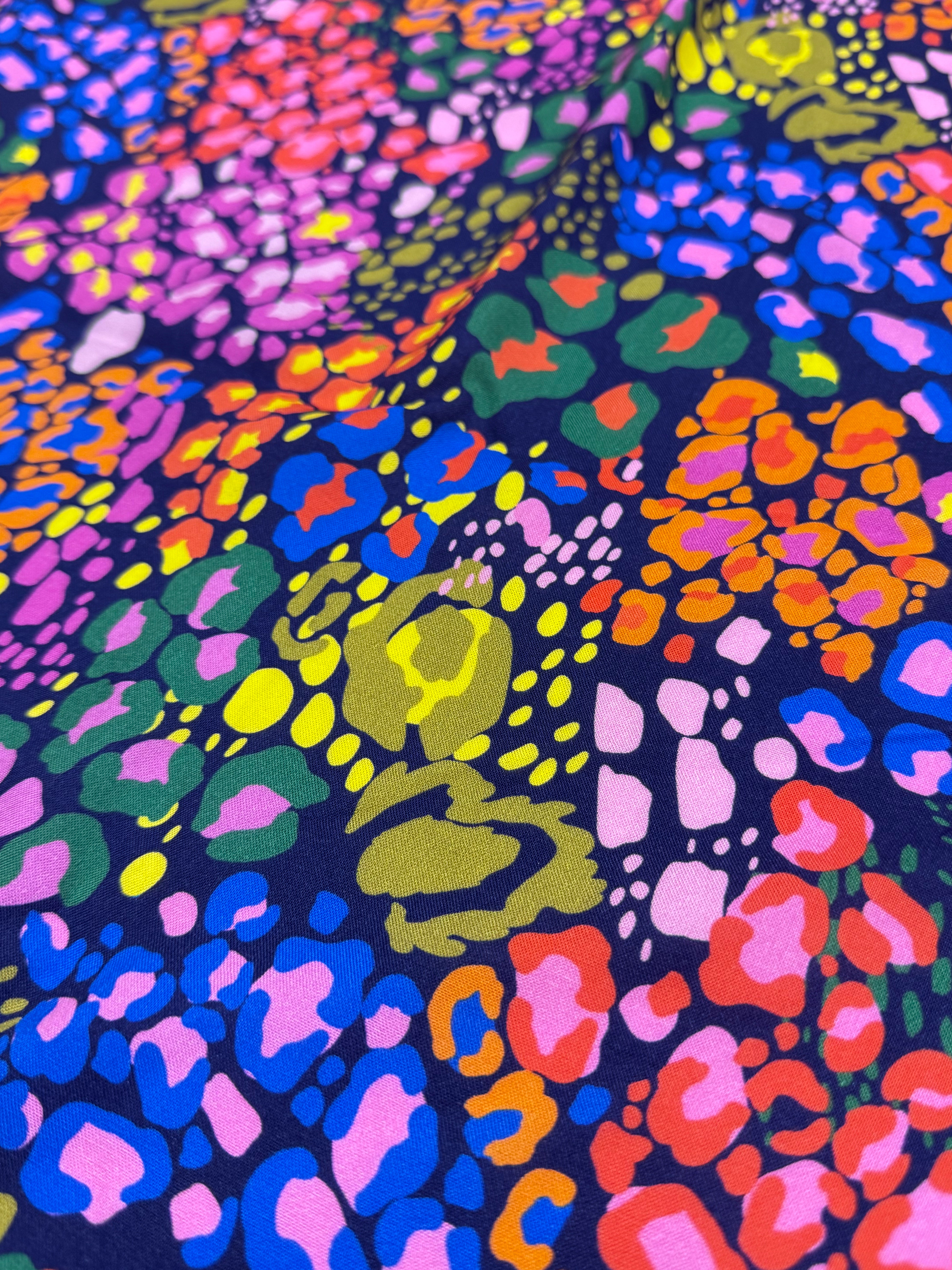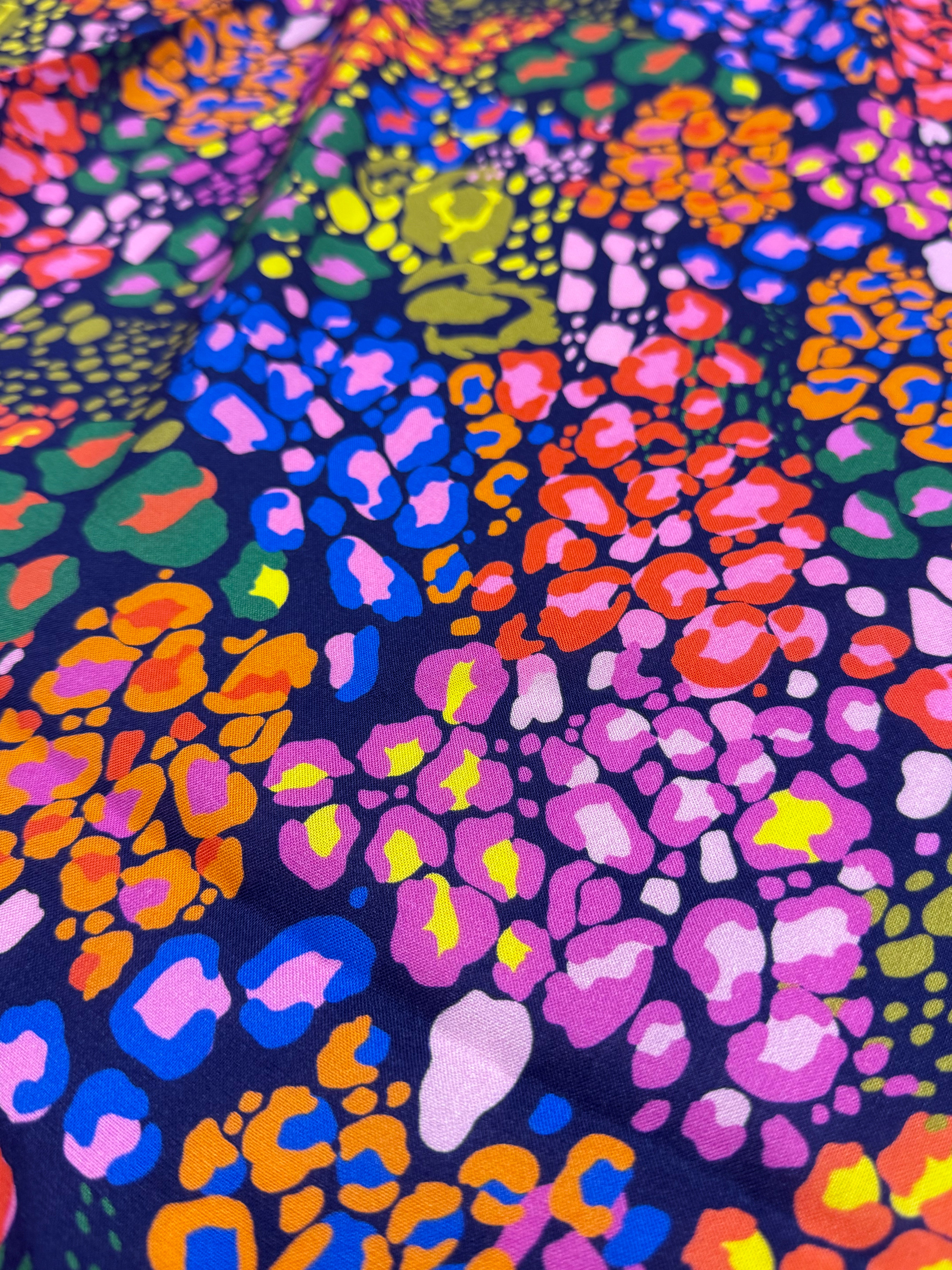 Unleash your wild side with Midnight Prowl, a striking animal-inspired print with vibrant pops of colour on a deep, moody backdrop. Perfect for statement dresses, standout coordinates, or fearless accessories, this fabric is your ticket to sewing pieces that turn heads—day or night.