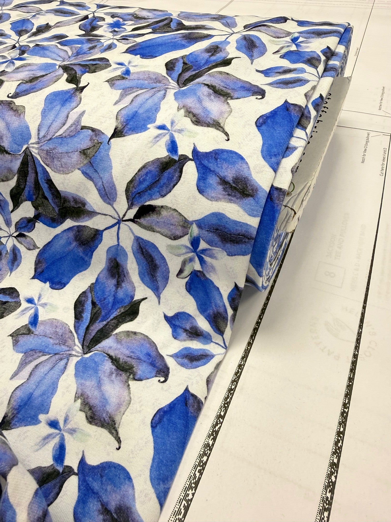 The painterly blue blooms, layered with inky tones and soft lavender hues, sit beautifully against a light cream background, giving this fabric a fresh, airy feel. The watercolour effect adds depth and softness, making it perfect for garments that feel both feminine and easy to wear.