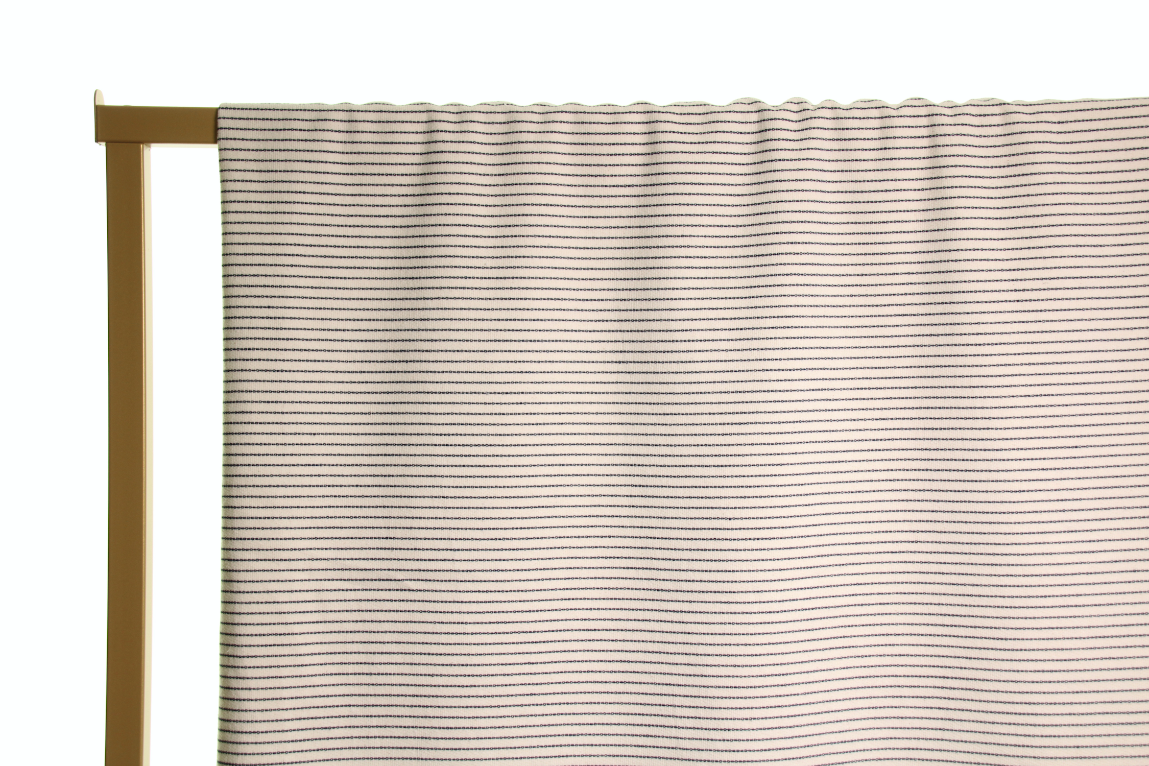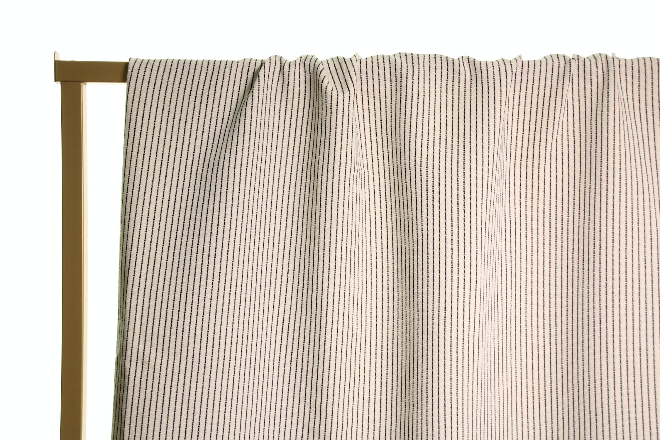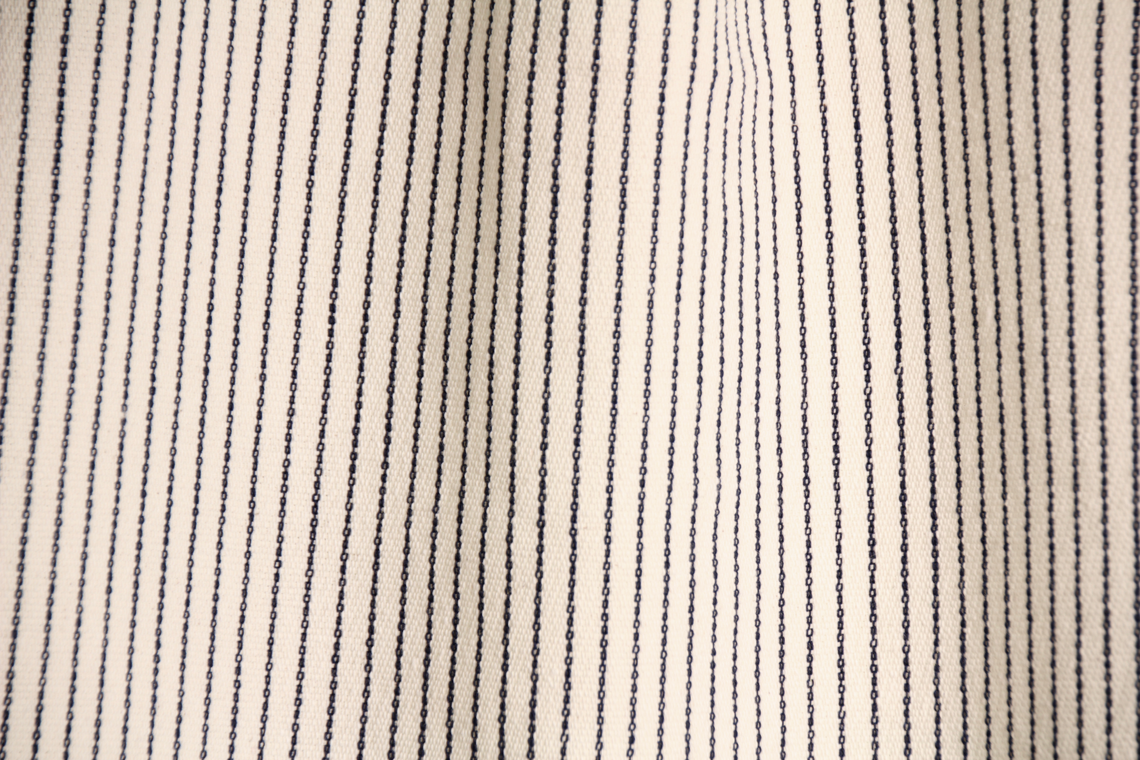 A soft beige cotton with navy lines. This is a medium weight jeans fabric. It's perfect for trousers, jackets, dungarees, ... and also comes in another variant. The stripes are at a right angle with the selvedge, but the fabric can be used in both directions.