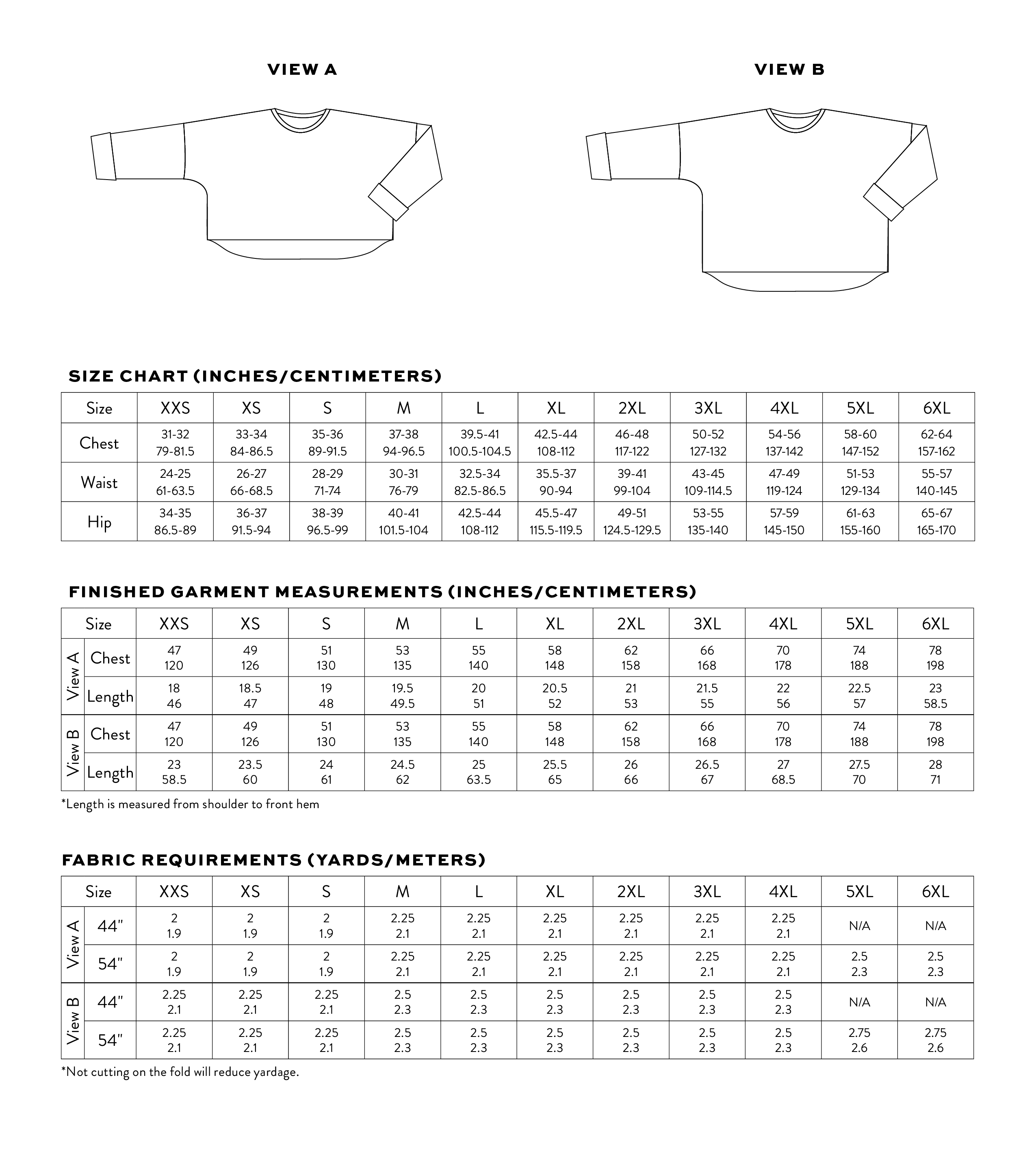 The All Around Crew is designed with comfort in mind and includes two views. View A is cropped and hits at the natural waistline. View B is tunic length and hits below the hips. Both views have a wide, relaxed fit with dropped shoulders and a gently curved back hemline. The boxy style sleeves are meant to be worn cuffed for a casual look. If you have never sewn with knit fabric before this is a great, simple pattern to start with!
