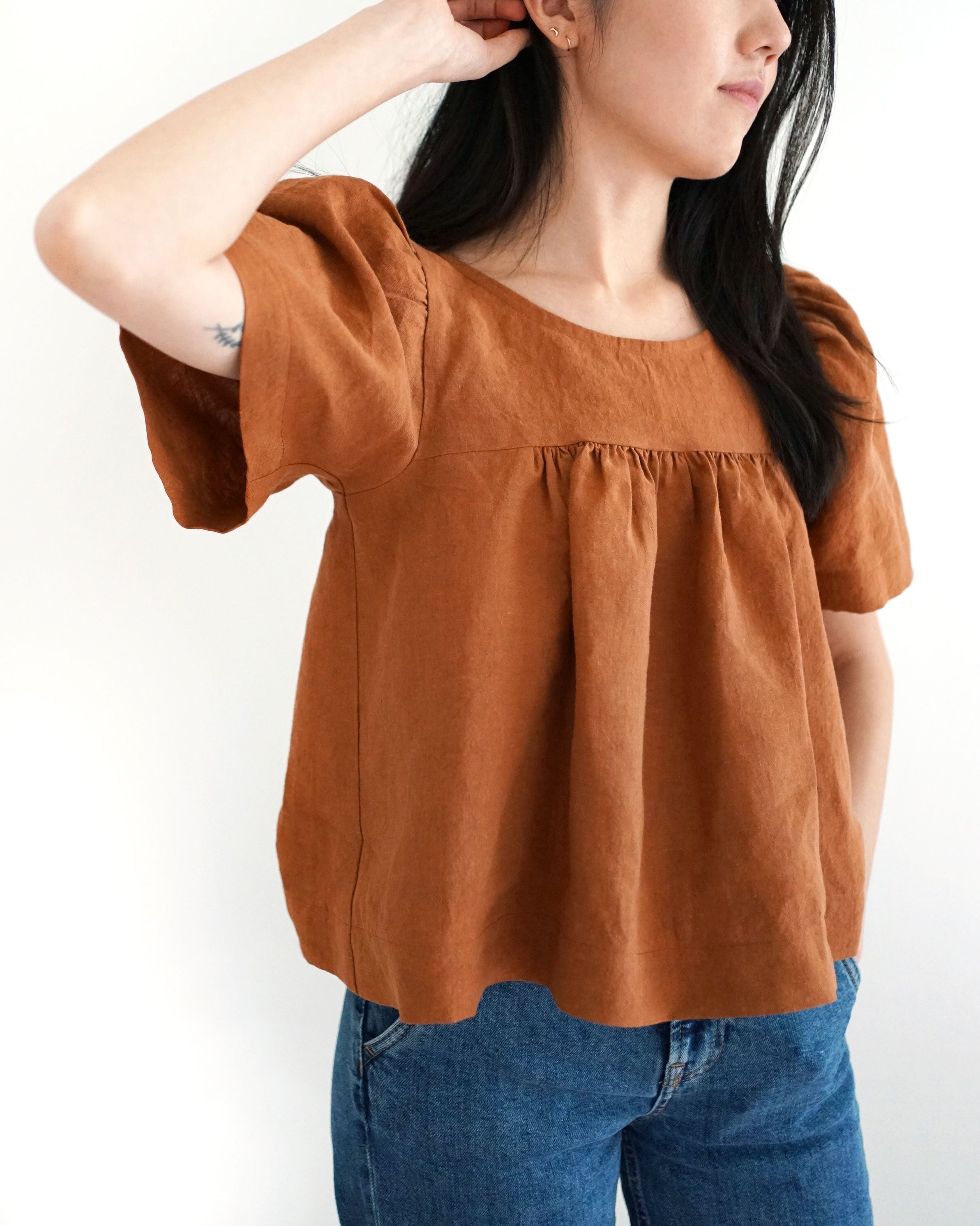 The Champagne Field Dress is a prairie style dress with patch pockets and optional patchwork view with inseam pockets. The front and back bodice include soft gathers that sit above the bust. View A is a mini dress, hitting above the knee and includes a flutter sleeve. View B is a midi dress, hitting mid calf with a high-low hem and gathered puff sleeves finished with a wide elastic cuff. Both views include a large bottom ruffle. View C is a babydoll style top which include soft gathers that sit above the bust and has a flowing bell sleeve. The length is semi cropped that hits right below the natural waist.