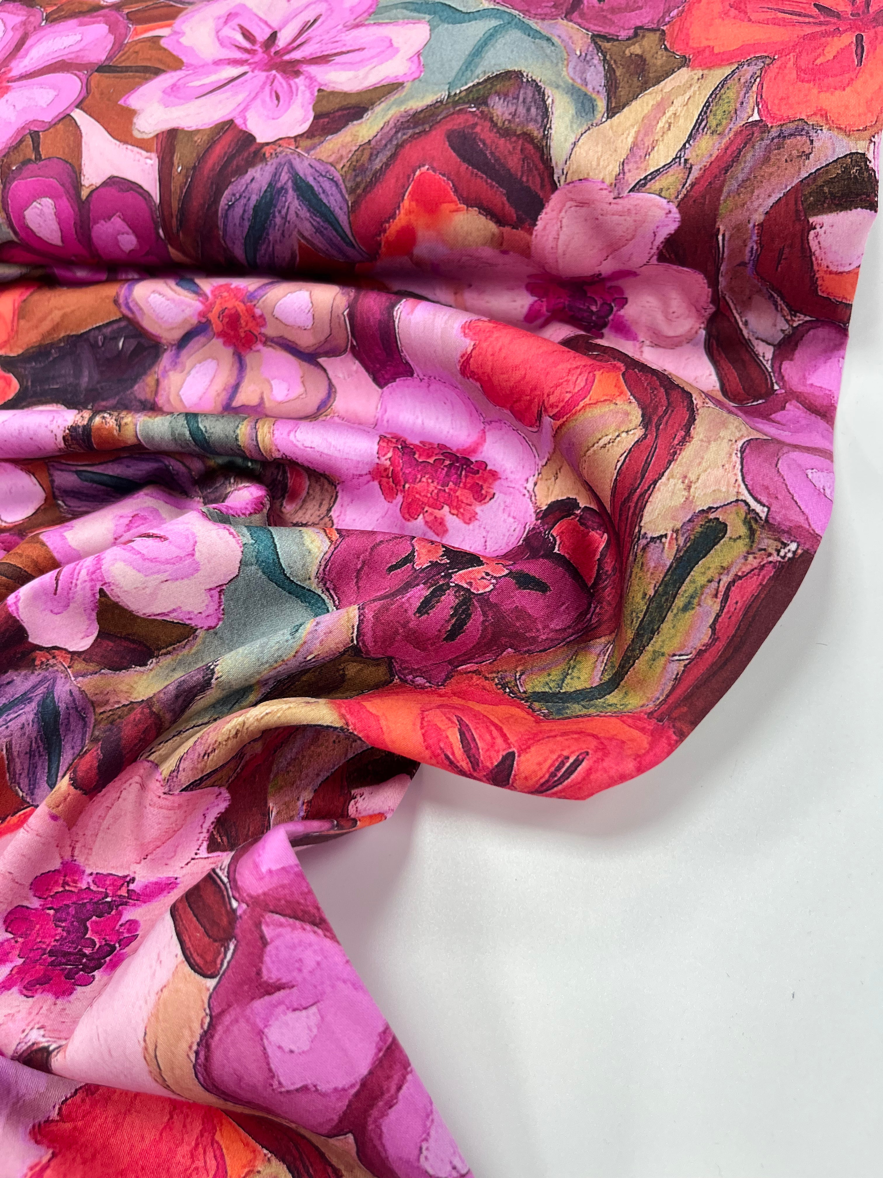 A vibrant explosion of painterly florals in rich shades of fuchsia, coral, magenta and red, set against leafy greens and warm undertones. Printed on smooth cotton satin, this fabric has a soft sheen and a slightly structured drape, making it perfect for statement dresses, skirts, jackets, or bold separates that showcase its artistic flair.