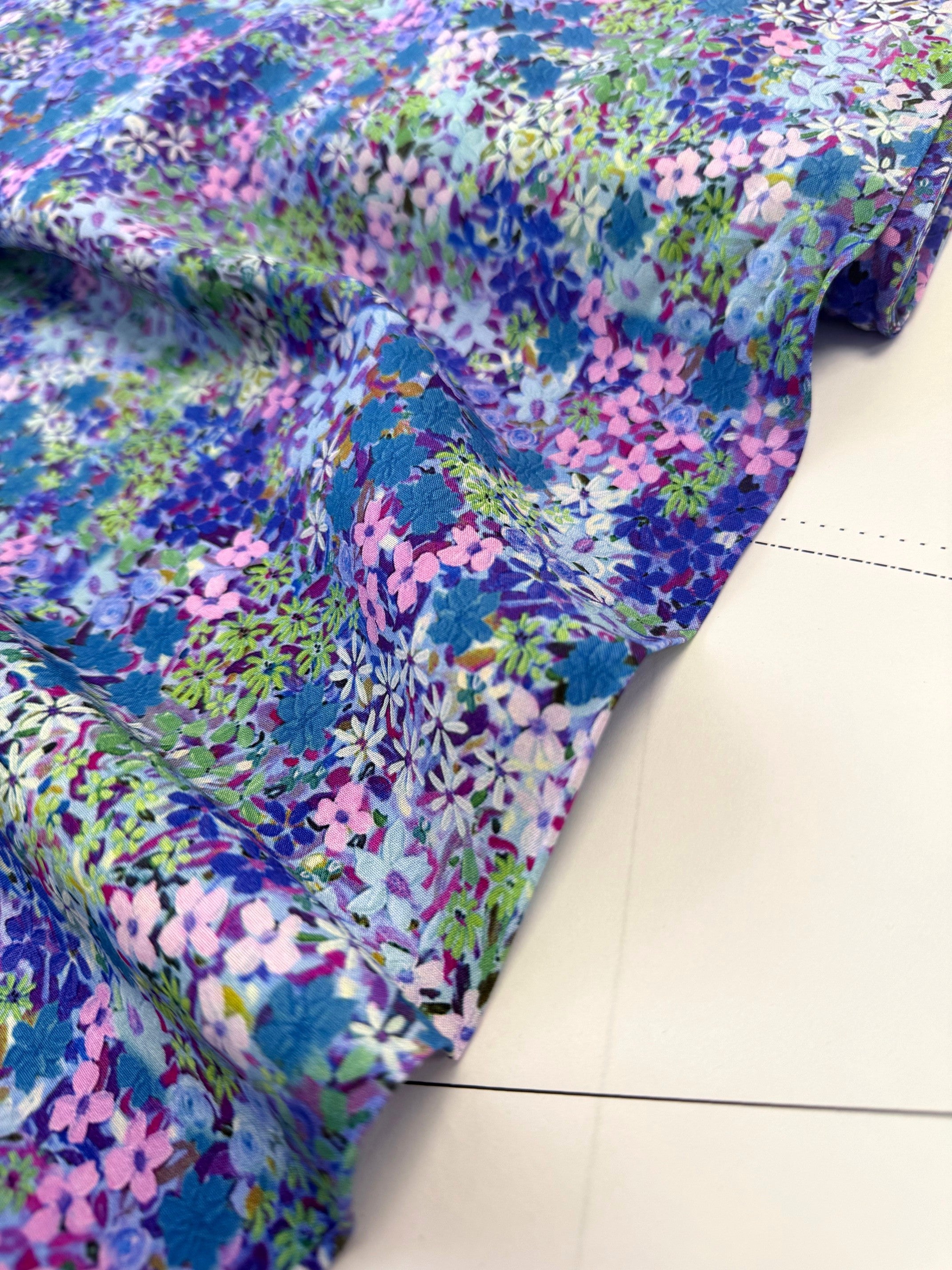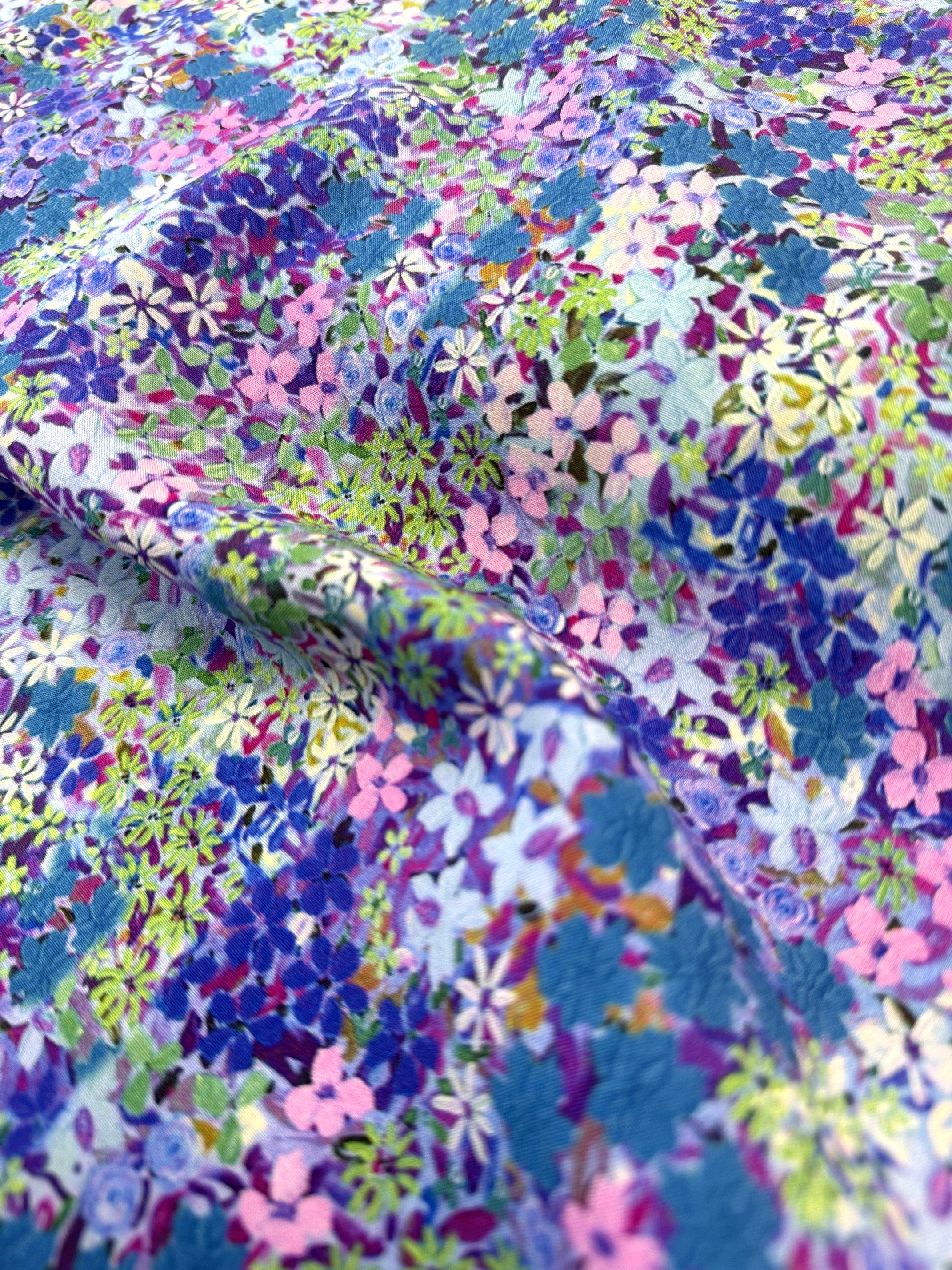 A densely packed, intricate pattern with shades of blue, pink, green, and violet: