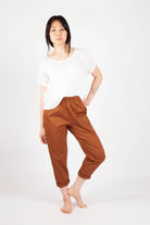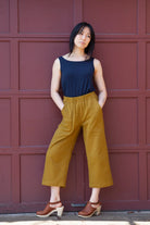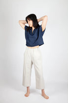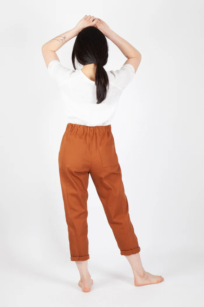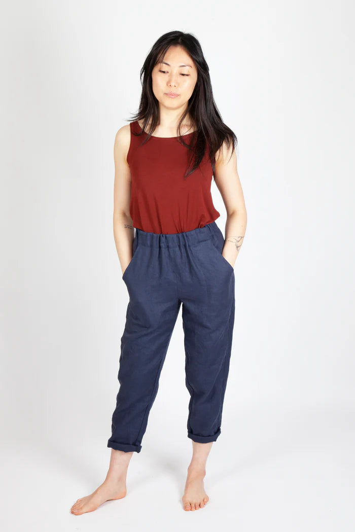 The Free Range Slacks are casual, comfortable, and timeless high-waisted pants with your choice of a wide or tapered leg. Both options have an elastic high waist, side panels, topstitched front pockets, and optional back patch pocket(s). The instructions include options for French and flat-fell leg seams.