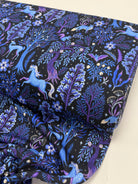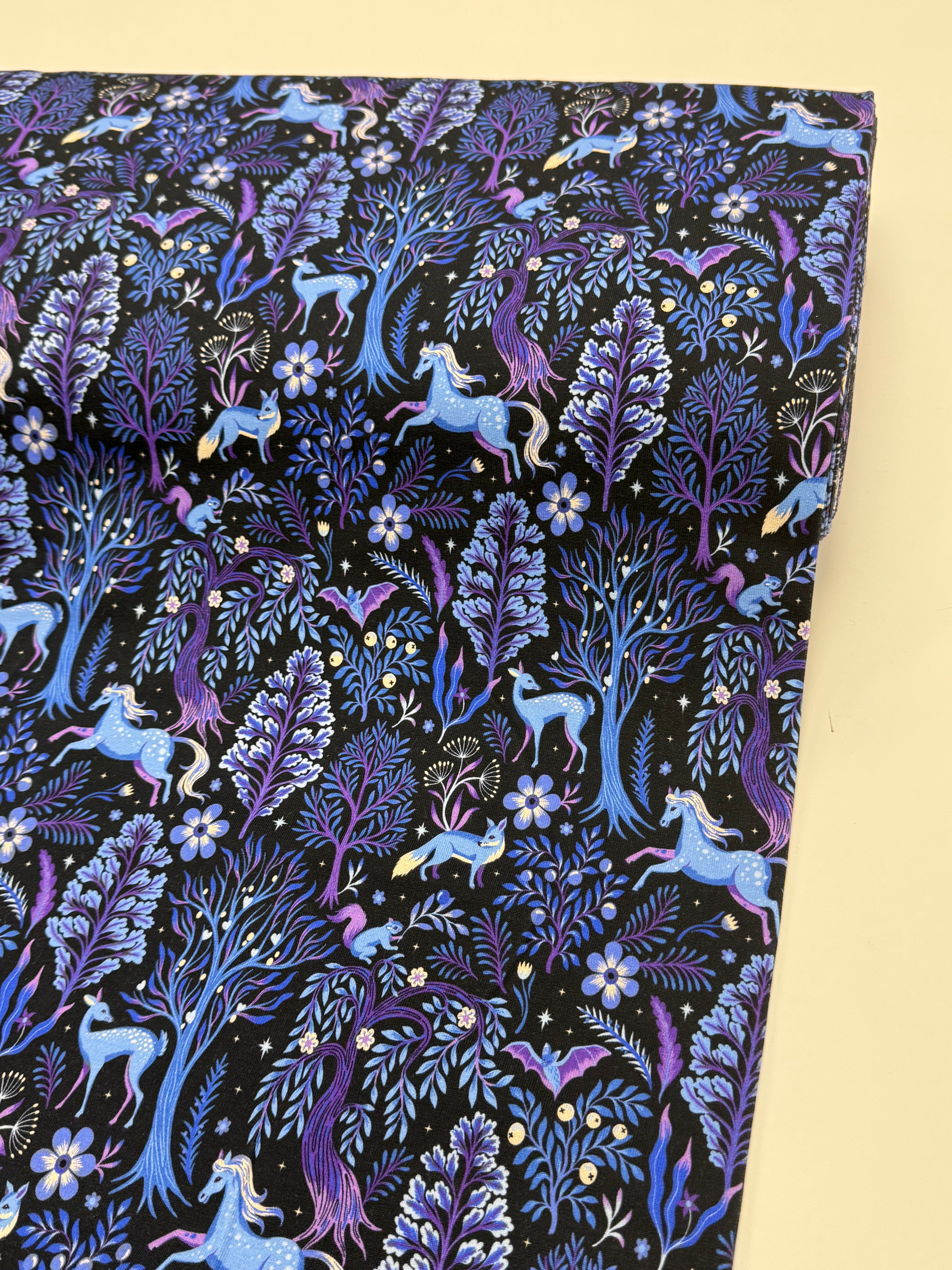 Step into a world of magic with Enchanted Forest, a soft and cozy French Terry fabric featuring whimsical woodland creatures, graceful unicorns, and enchanted trees under a starry sky. Available in two colourways — a dreamy pink and plum palette or a midnight blue and indigo version — this fabric is perfect for creating playful yet comfortable sweaters, hoodies, and loungewear. With its gentle stretch and smooth texture, it’s ideal for adding a touch of fantasy to your everyday wardrobe.
