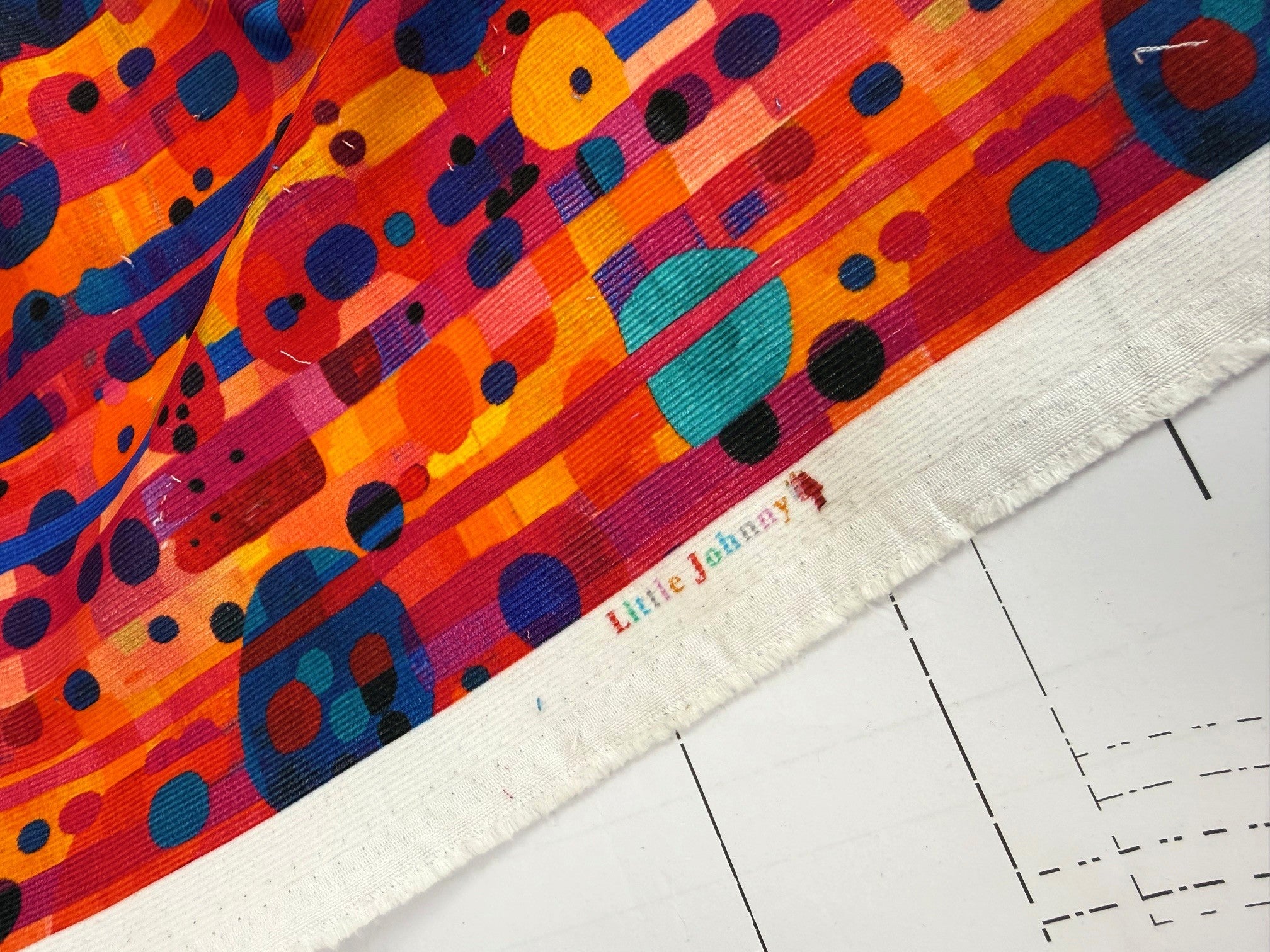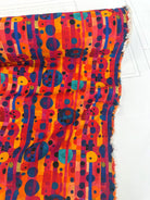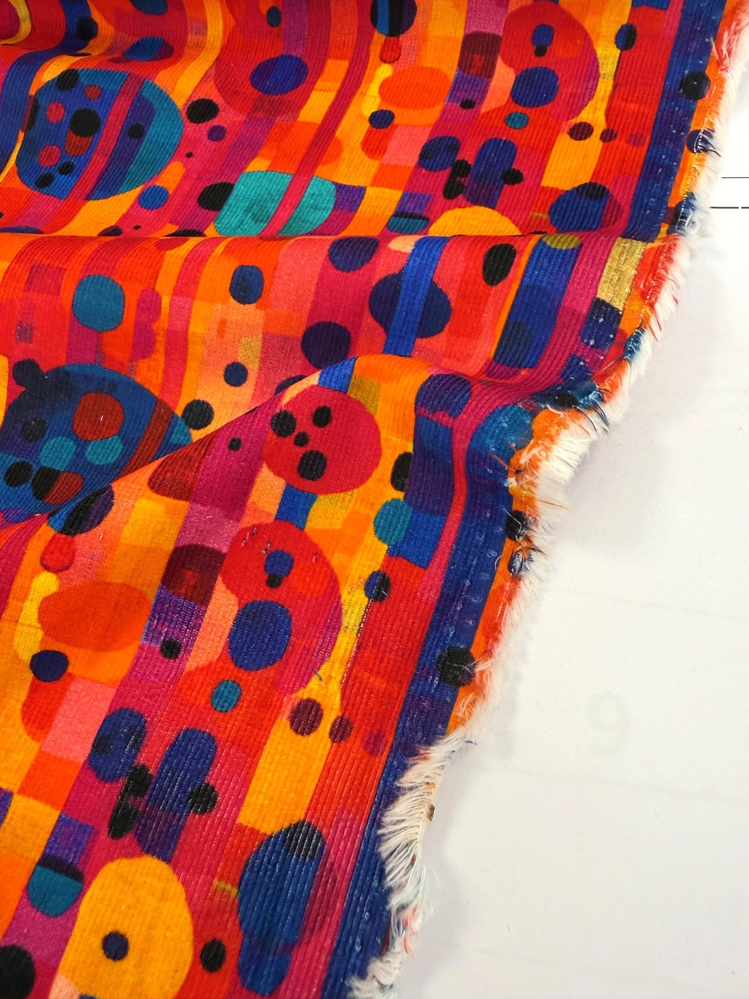 A bold geometric design bursting with energy — vivid oranges, hot pinks, blues, and purples collide in a lively pattern of dots and stripes. Ideal for standout retro-inspired garments or fun children’s wear.