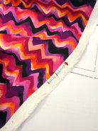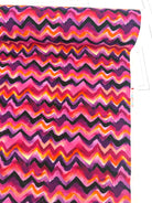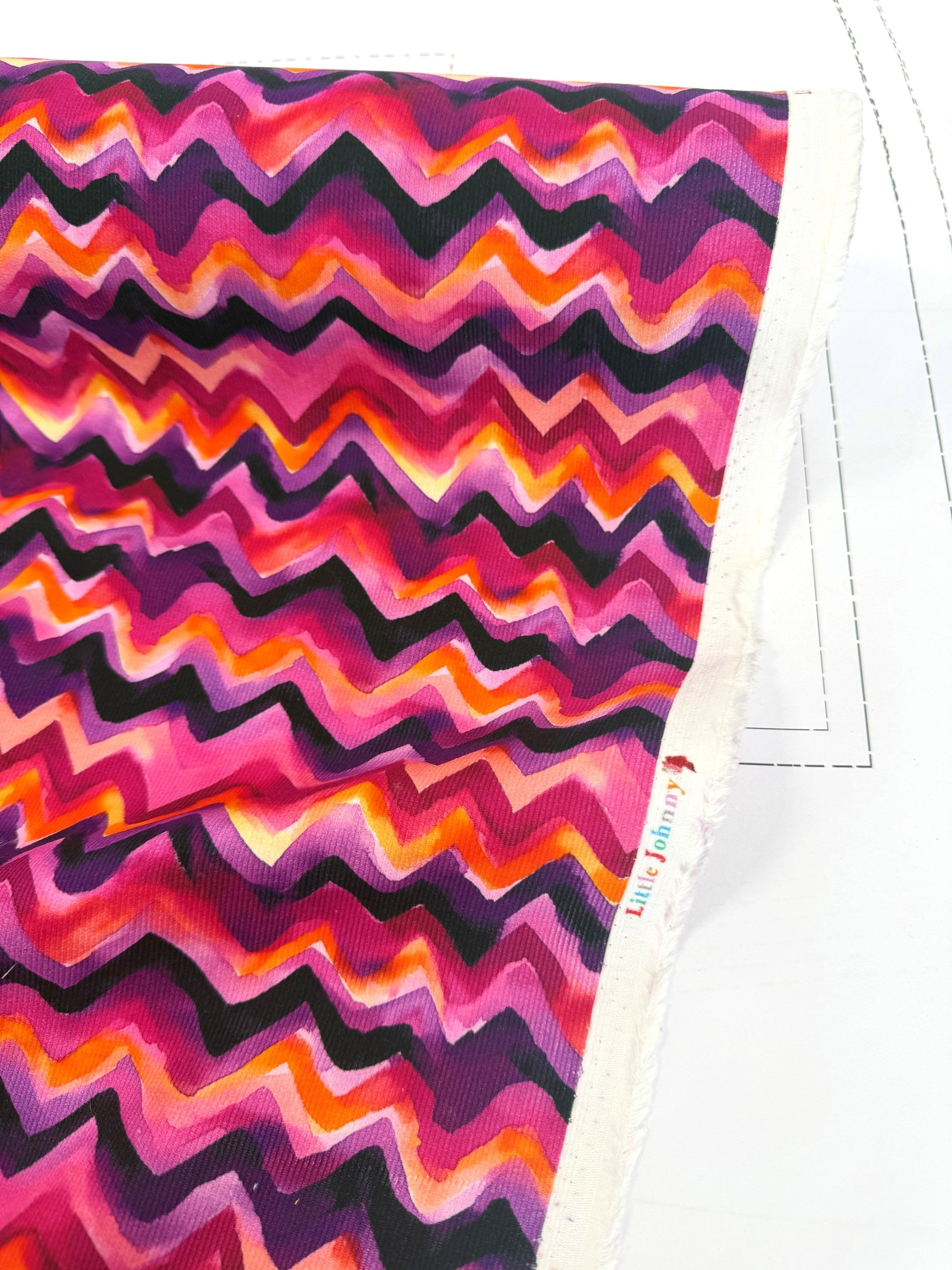 Vibrant chevrons in shades of fuchsia, magenta, orange, and plum run across the fabric in an eye-catching rhythm. A striking needlecord for those who love bold, modern, and dynamic prints.