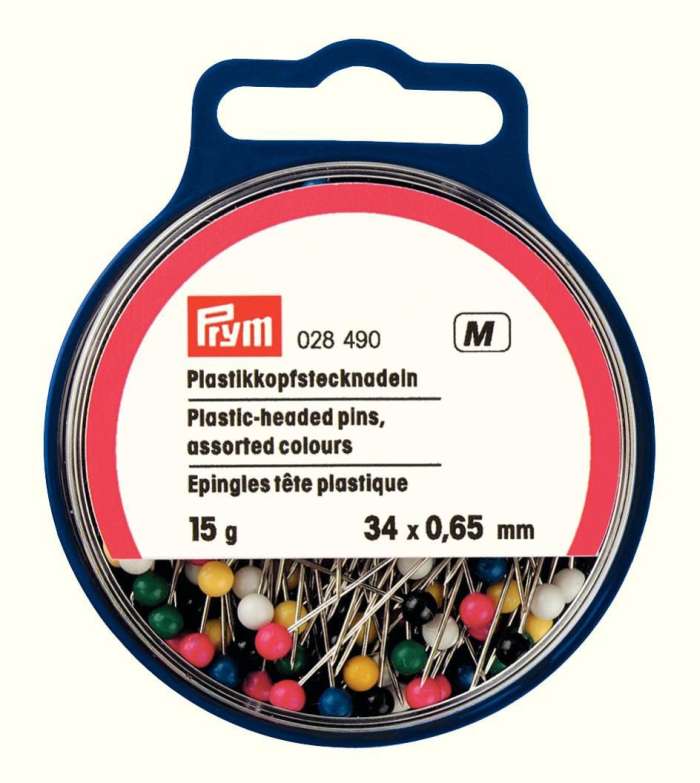 These pins made of hardened steel have a round plastic head in simple assorted colours neon pink and yellow or in mixed colours. Its meticulous and even surface finish increases it sliding capability and provides good rust protection. This sleek, tapering tip also ensures easy penetration without damaging the material, even for firm fabrics. Thanks to their colourful heads, these pins are always well visible and can be easily and completely removed from the sewing work again. Prym offers these pins with plastic head in a round canister in three lengths from 32 mm to 45 mm.