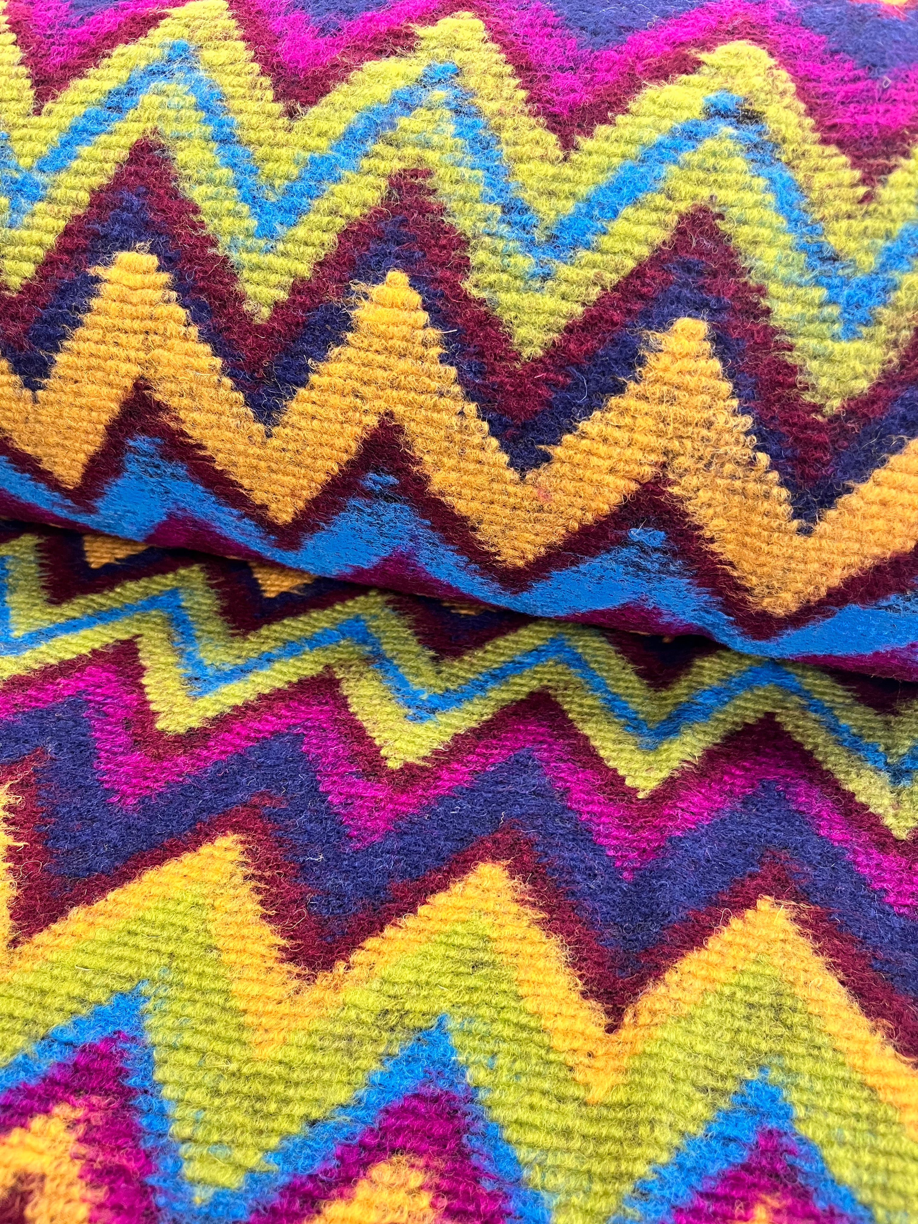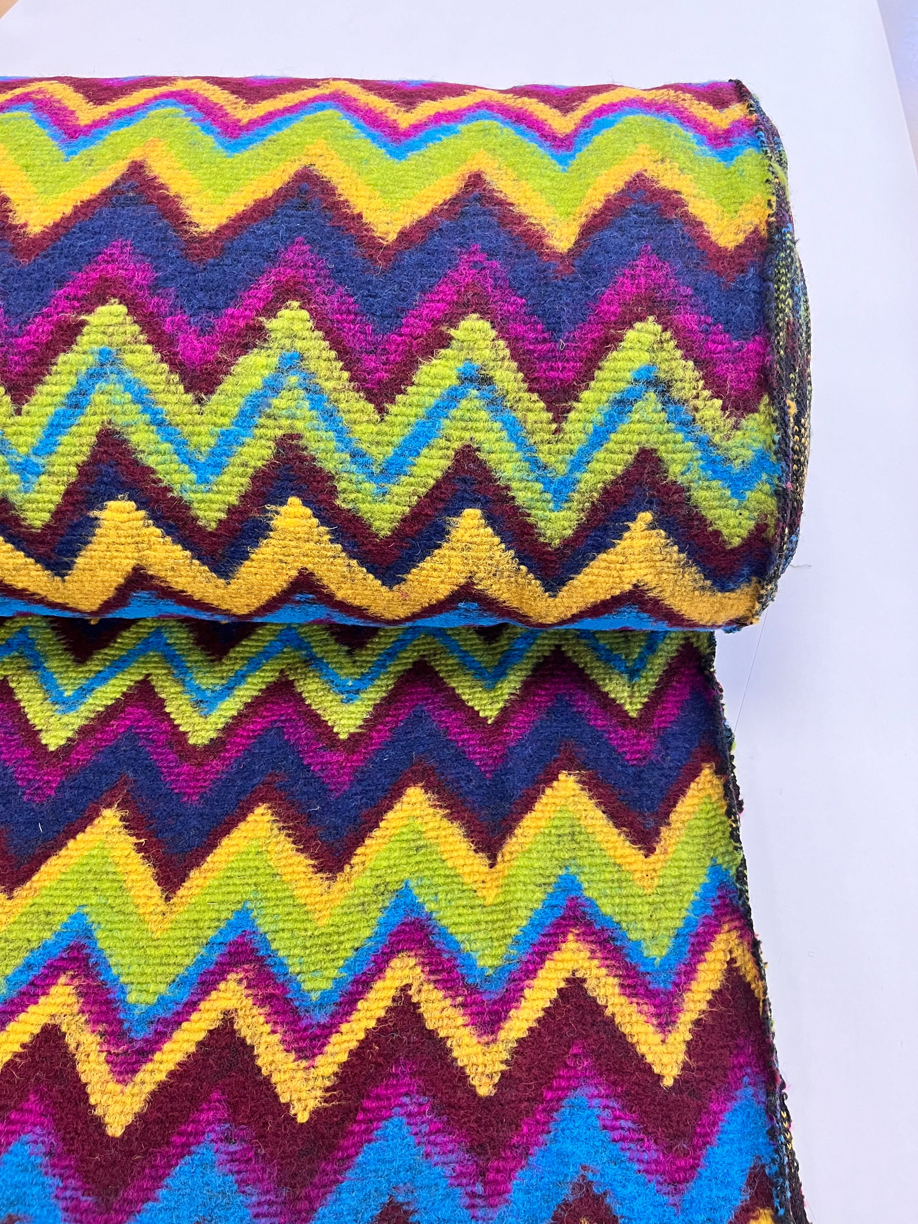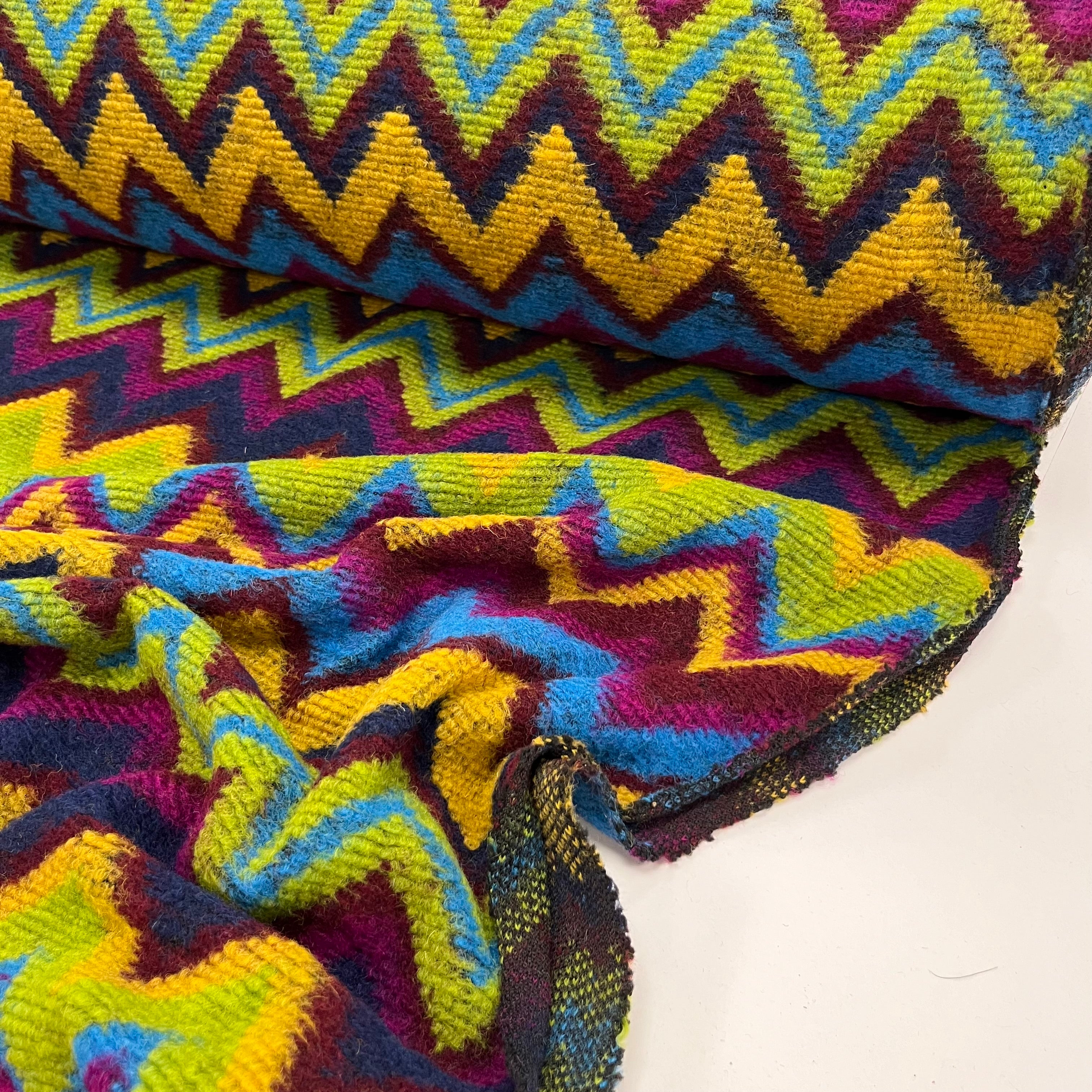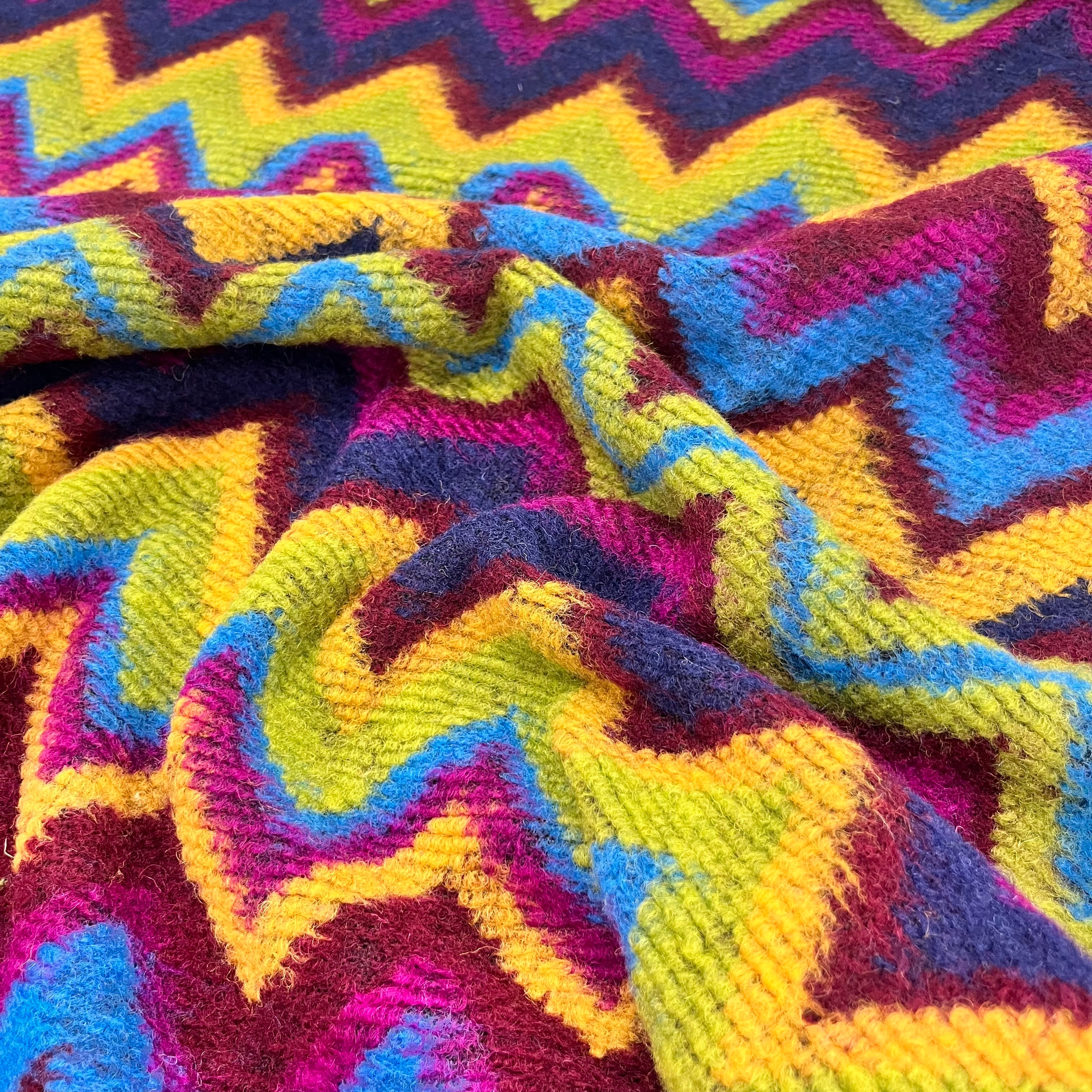 A riot of colour and pattern! This heavy knit fabric features a bold chevron design in jewel tones of magenta, lime, cobalt, mustard, and navy. Soft, warm, and full of personality — perfect for statement jackets, cosy cardigans, or standout coatigans.