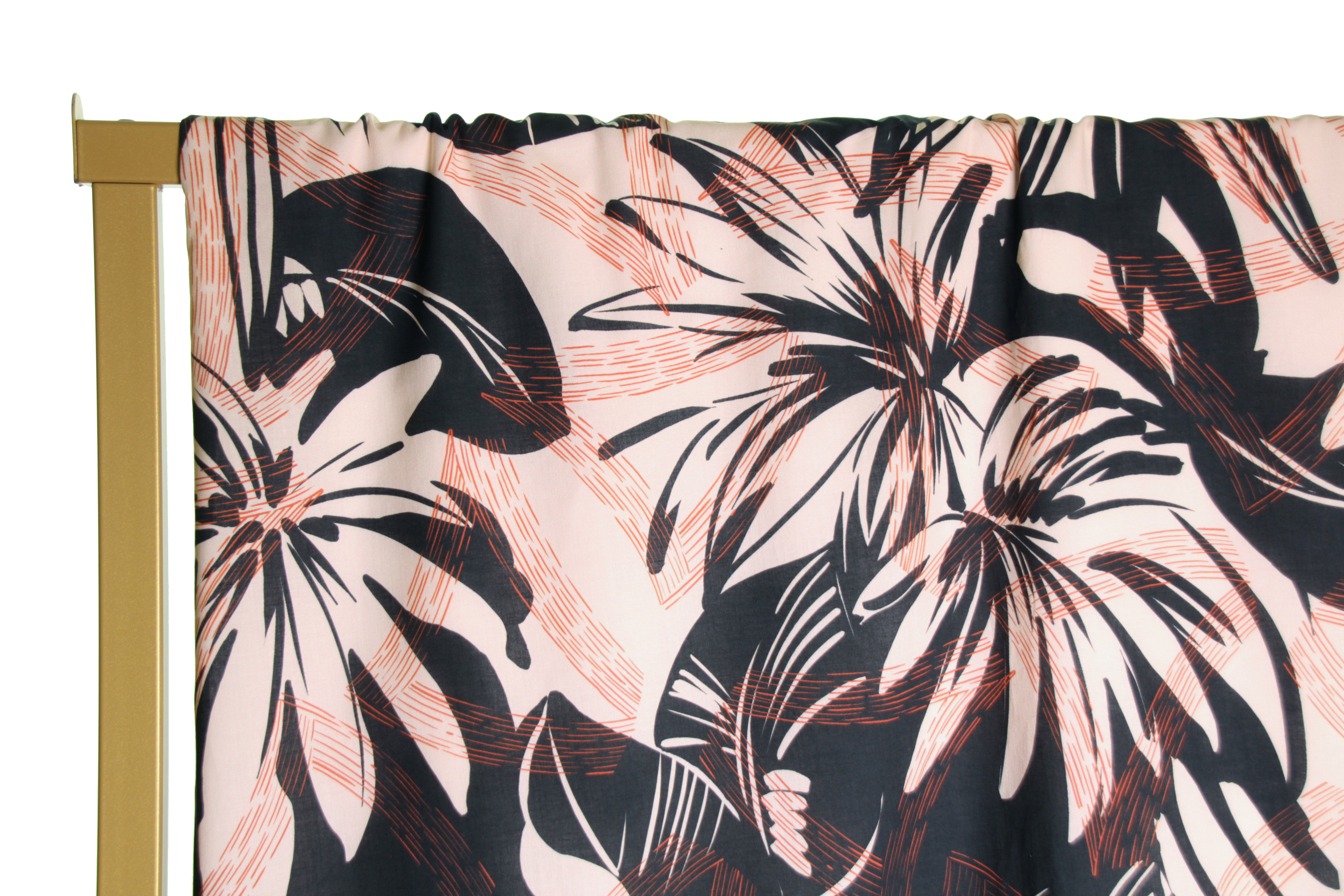 A lightweight cotton with black and beige tropical leaves and a fine red line. This fabric is perfect for blouses, dresses, skirts...