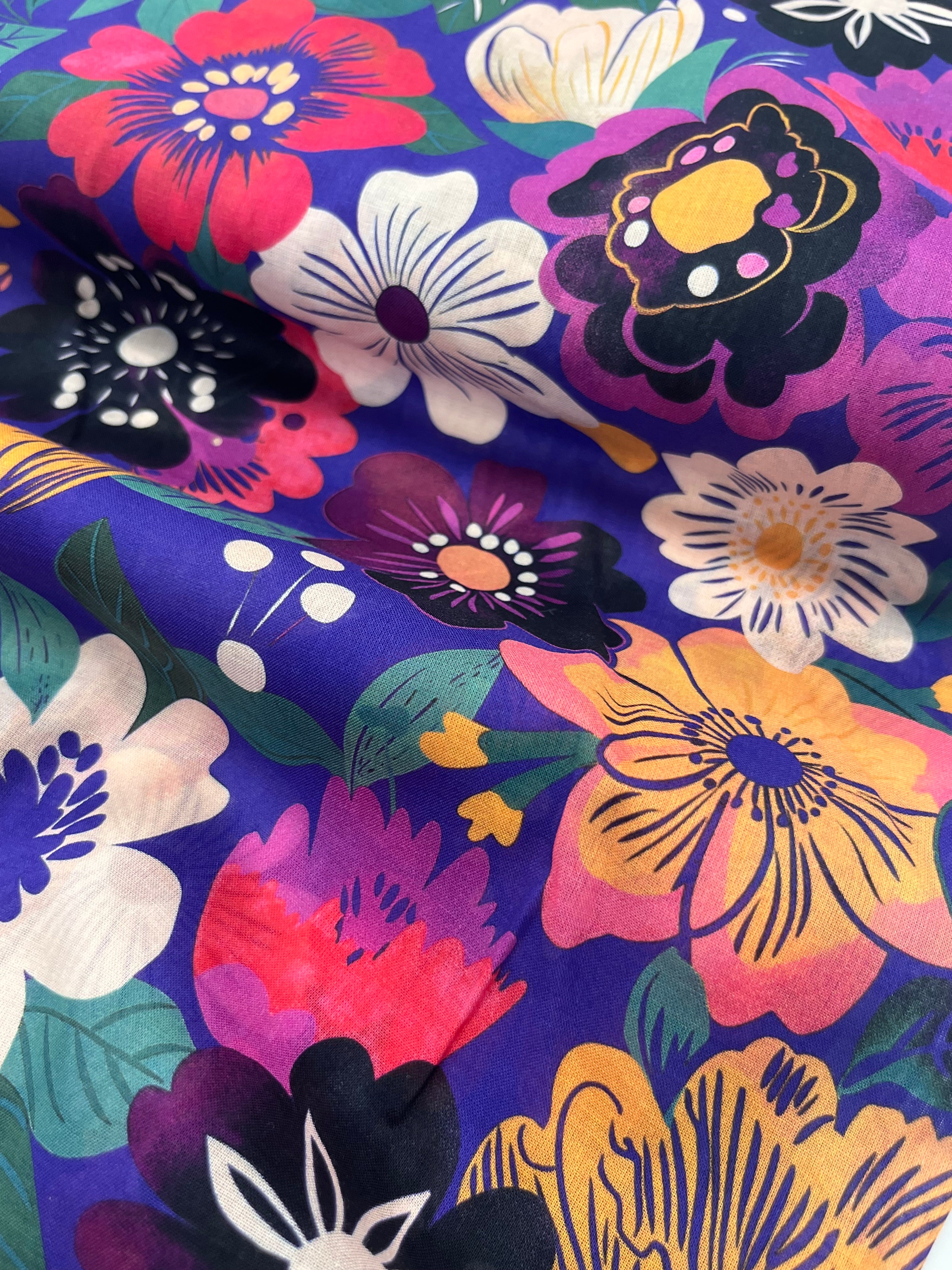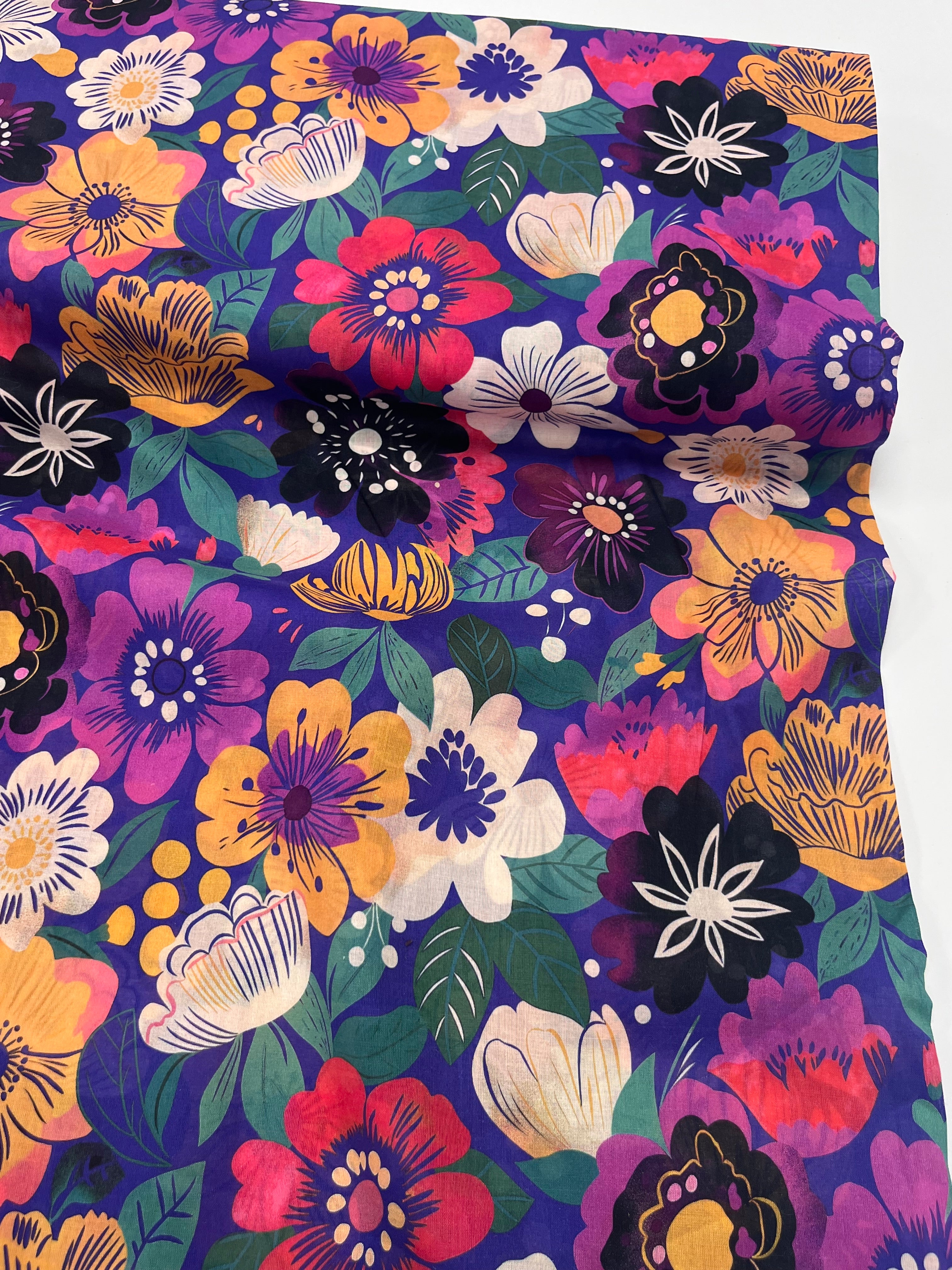This is a lovely fluid and drapey cotton with a lovely retro floral print on a dark purple background.