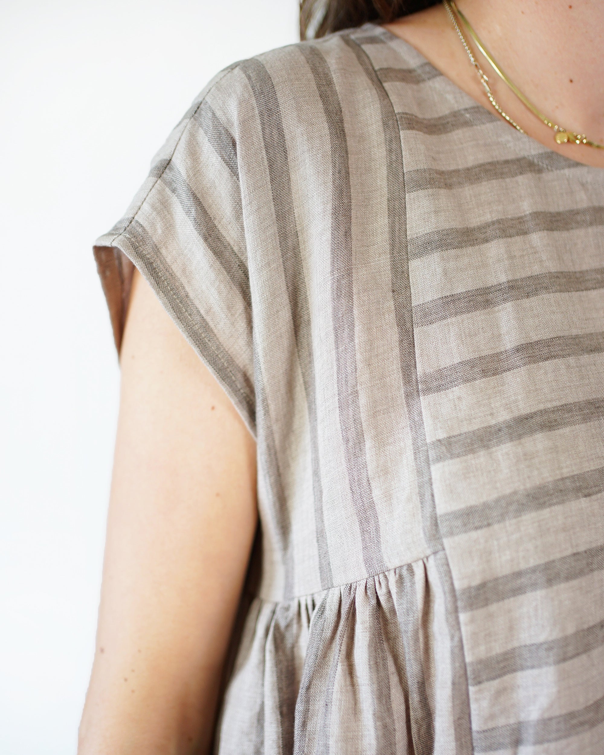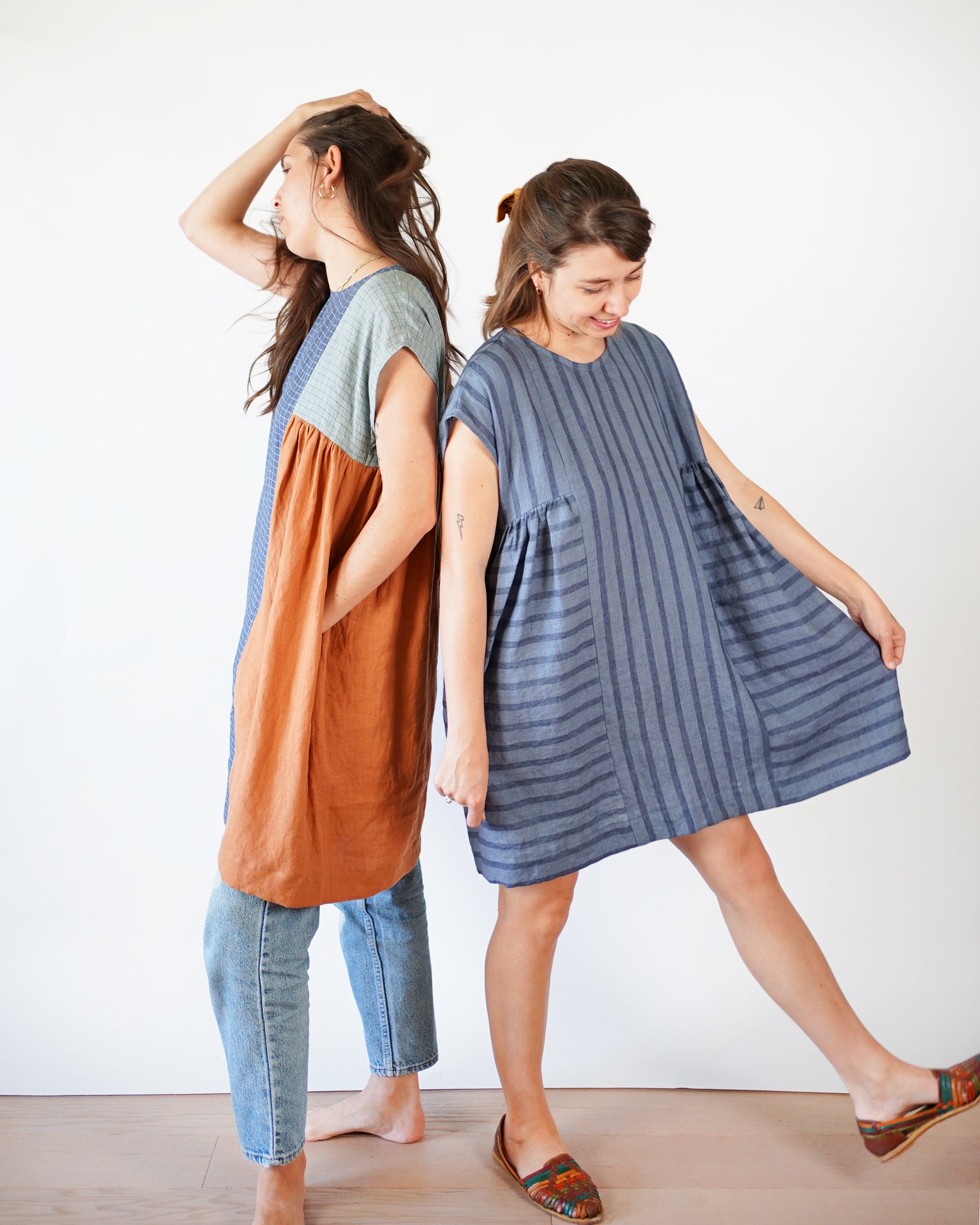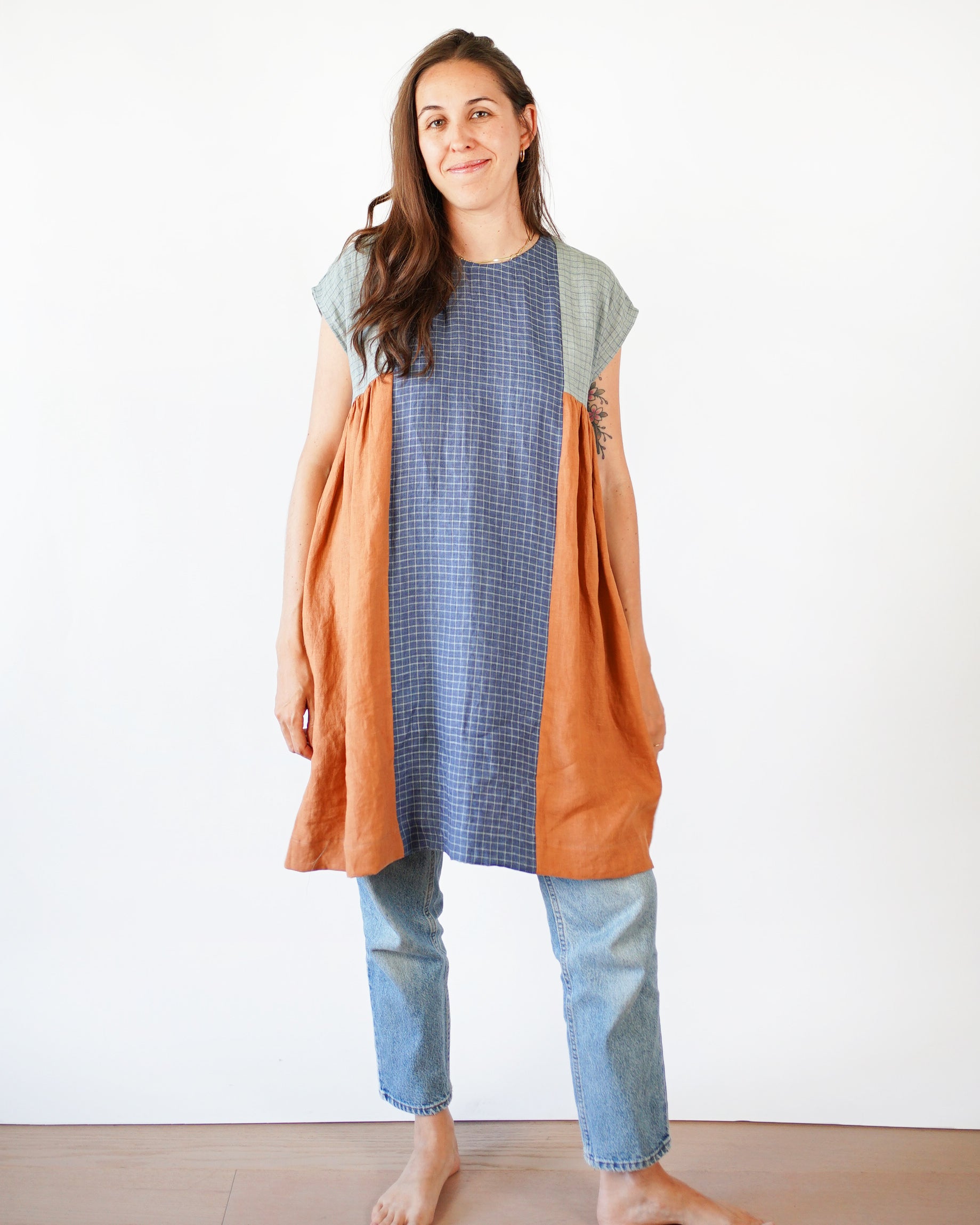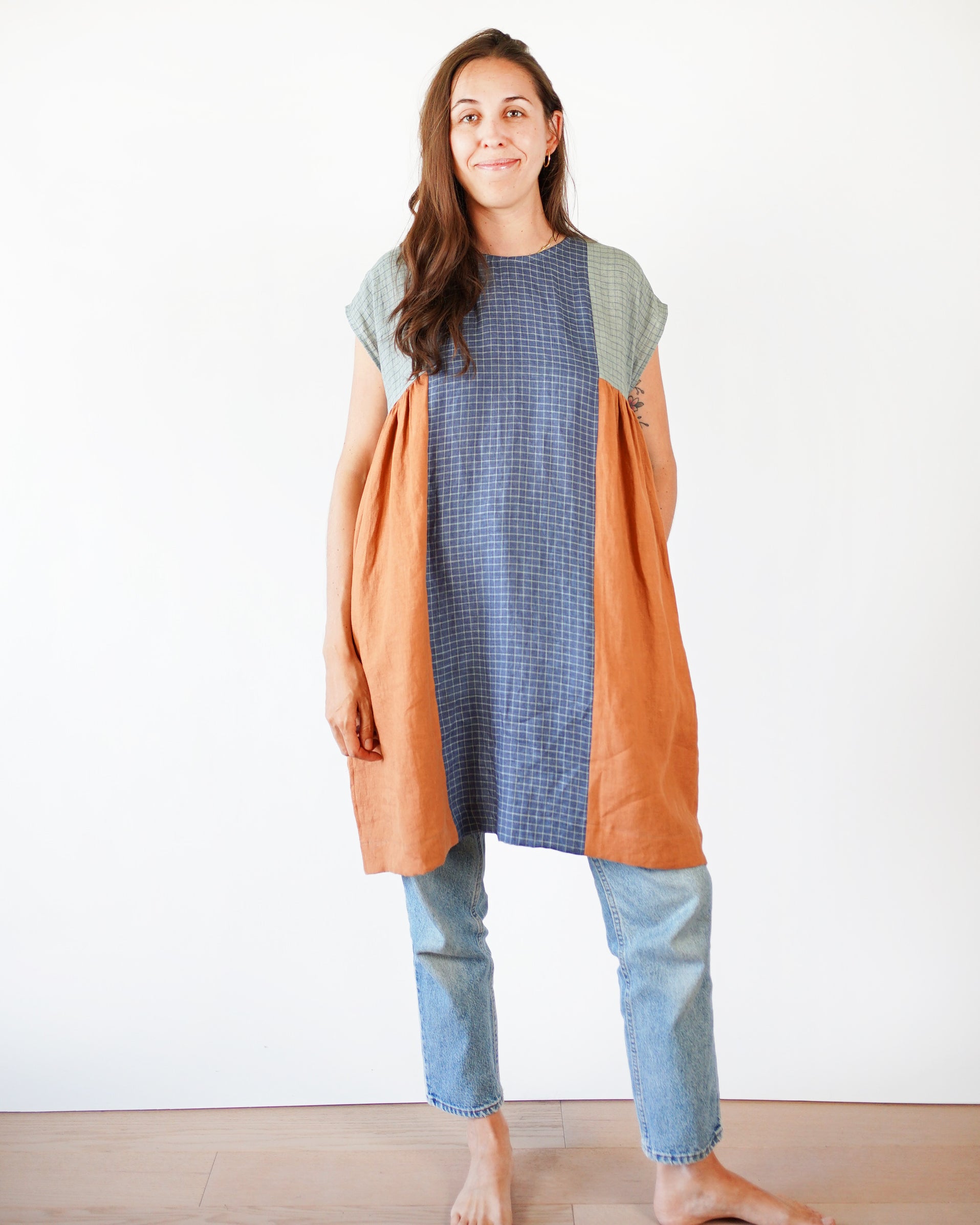 The Collage Gather Dress has a relaxed boxy fit with soft gathers on the side for a little extra shape and movement. The dress has hidden inseam pockets and comes with multiple dress lengths marked directly on the pattern from mini to maxi. For your convenience, we also included is a separate file featuring our favorite length, 34" (86 cm). Designed to be sewn as a patchwork or with a single fabric, it is fun to sew, easily customizable and comes together quickly.