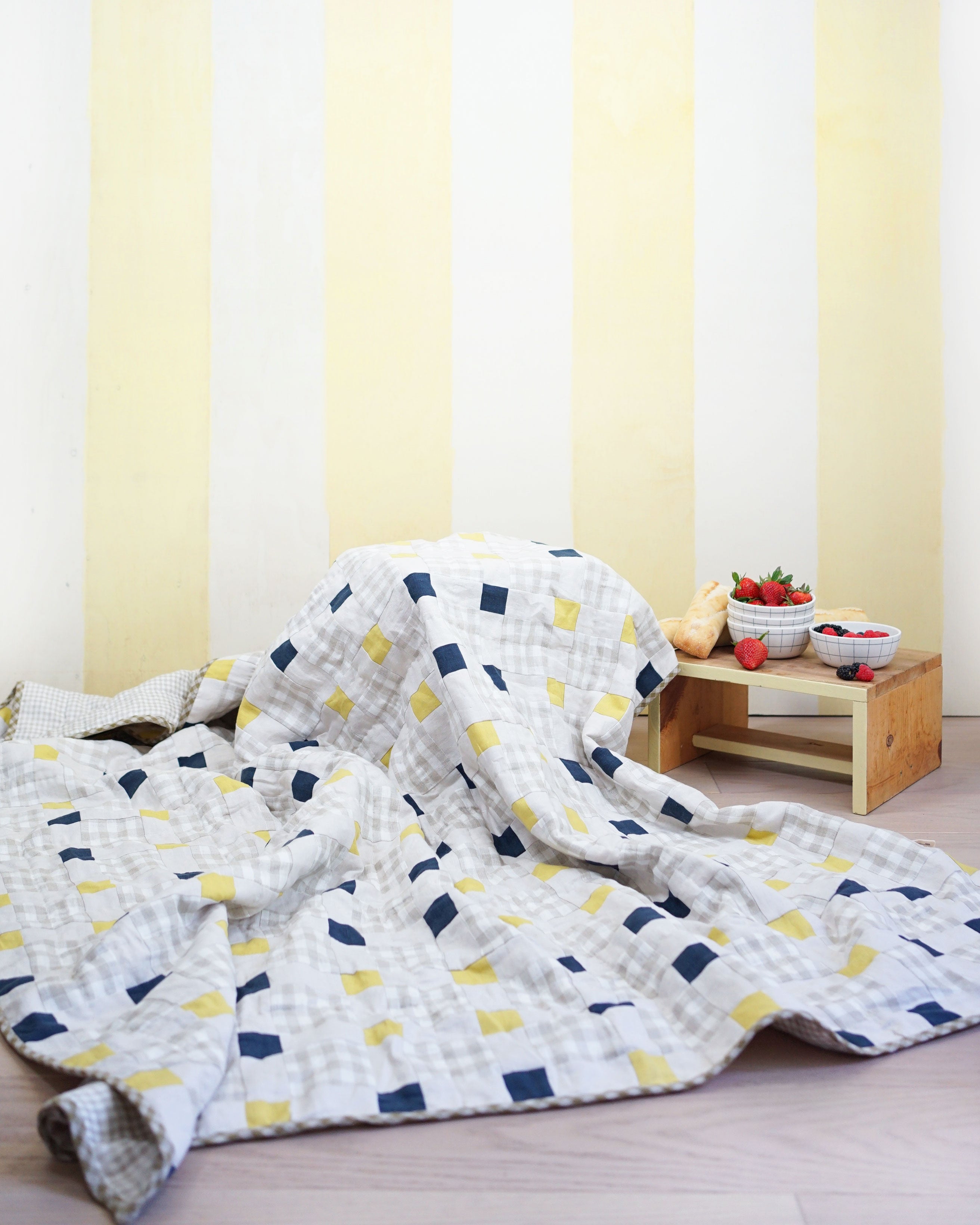 The Picnic Square Quilt is a simple pattern based on squares and rectangles that is perfect for beginners. If you can sew a straight line you can make this quilt. It comes together very quickly using the chain piecing method for your quilt top. The Picnic Square Quilt looks beautiful in solid fabrics and prints or can show off your scrap collection. The basic shapes are reminiscent of a town square park, the perfect location for a picnic.