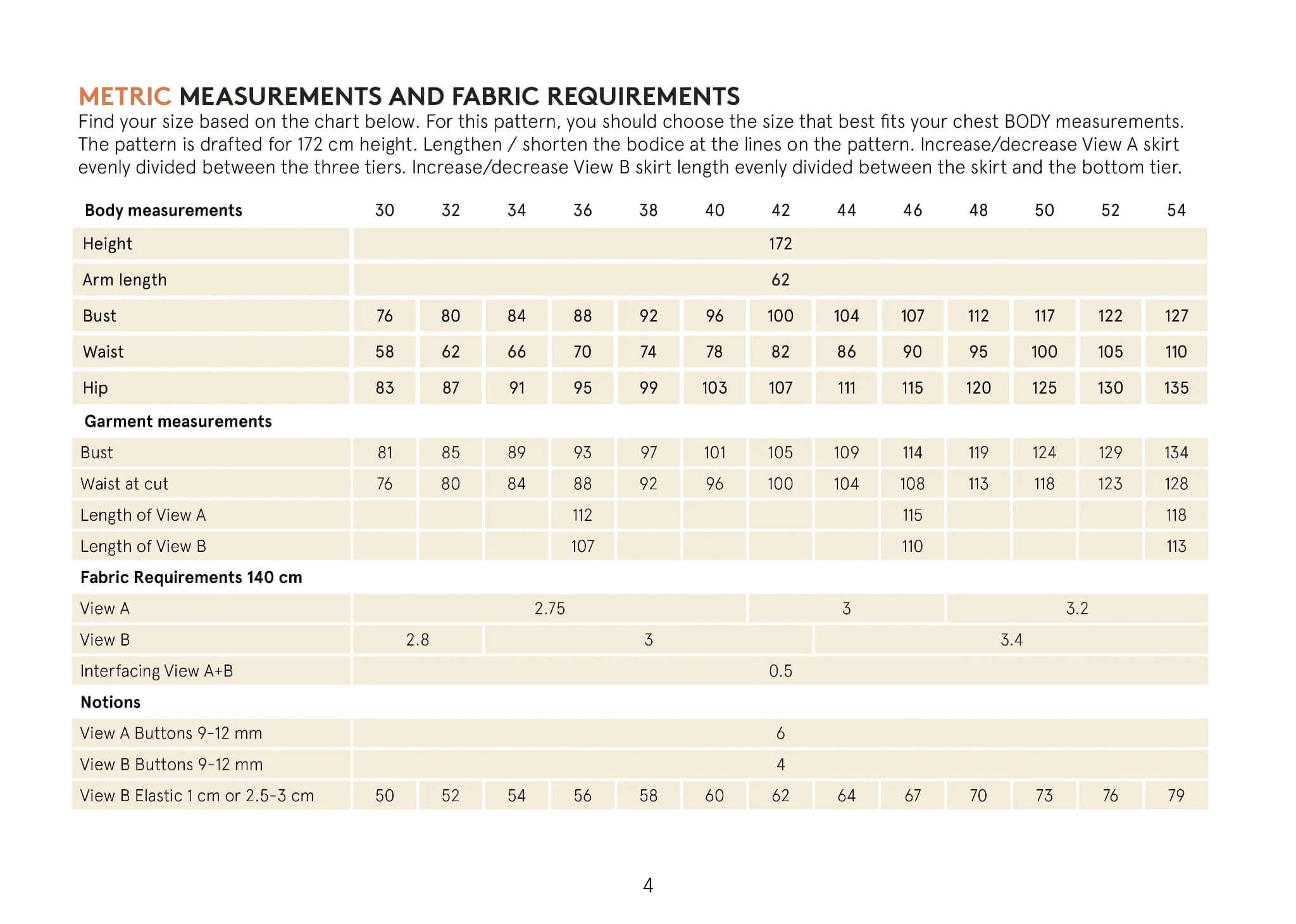 Flip through the images to find fabric requirements and measurements for the Freedom dress sewing pattern.
