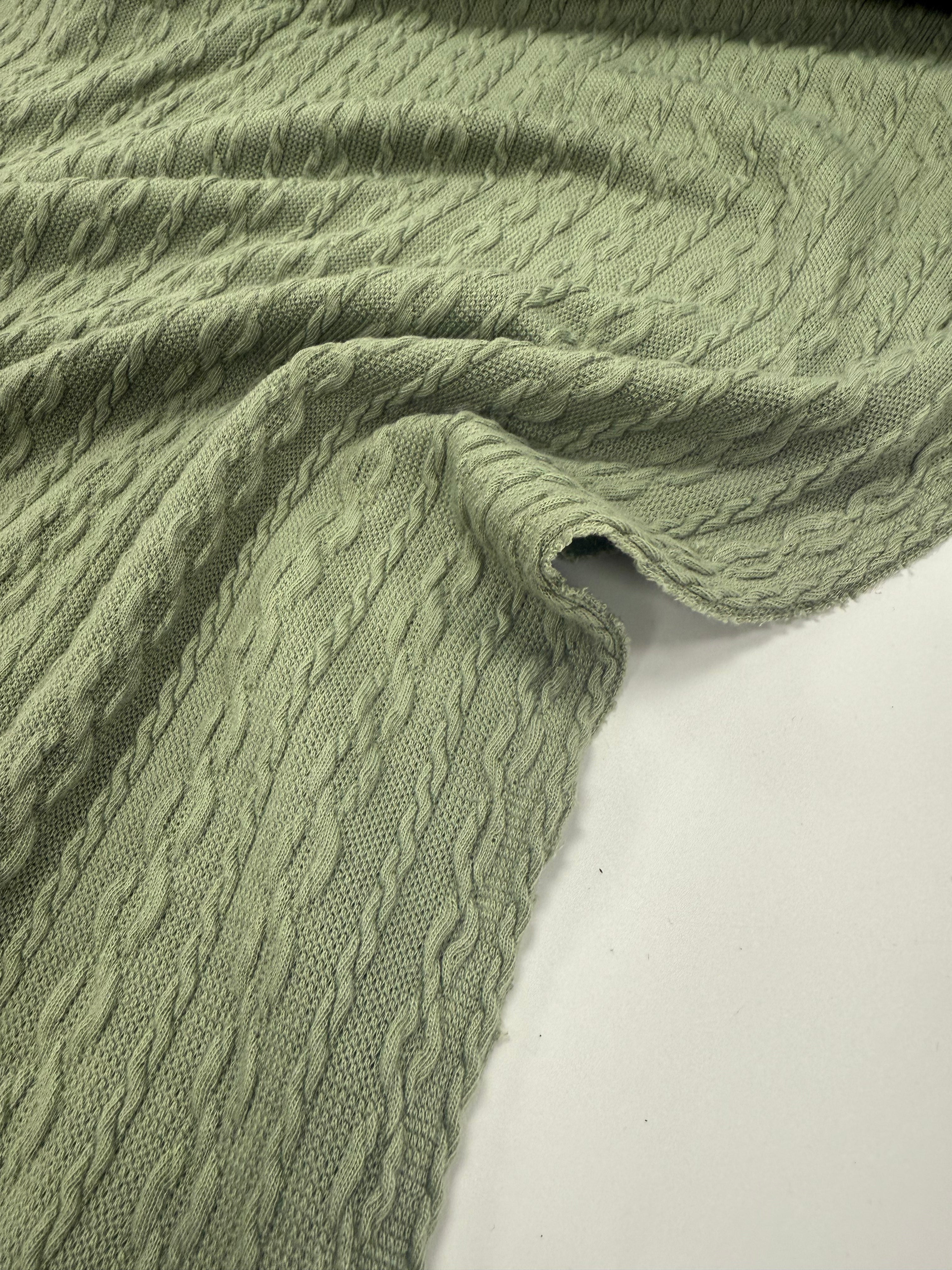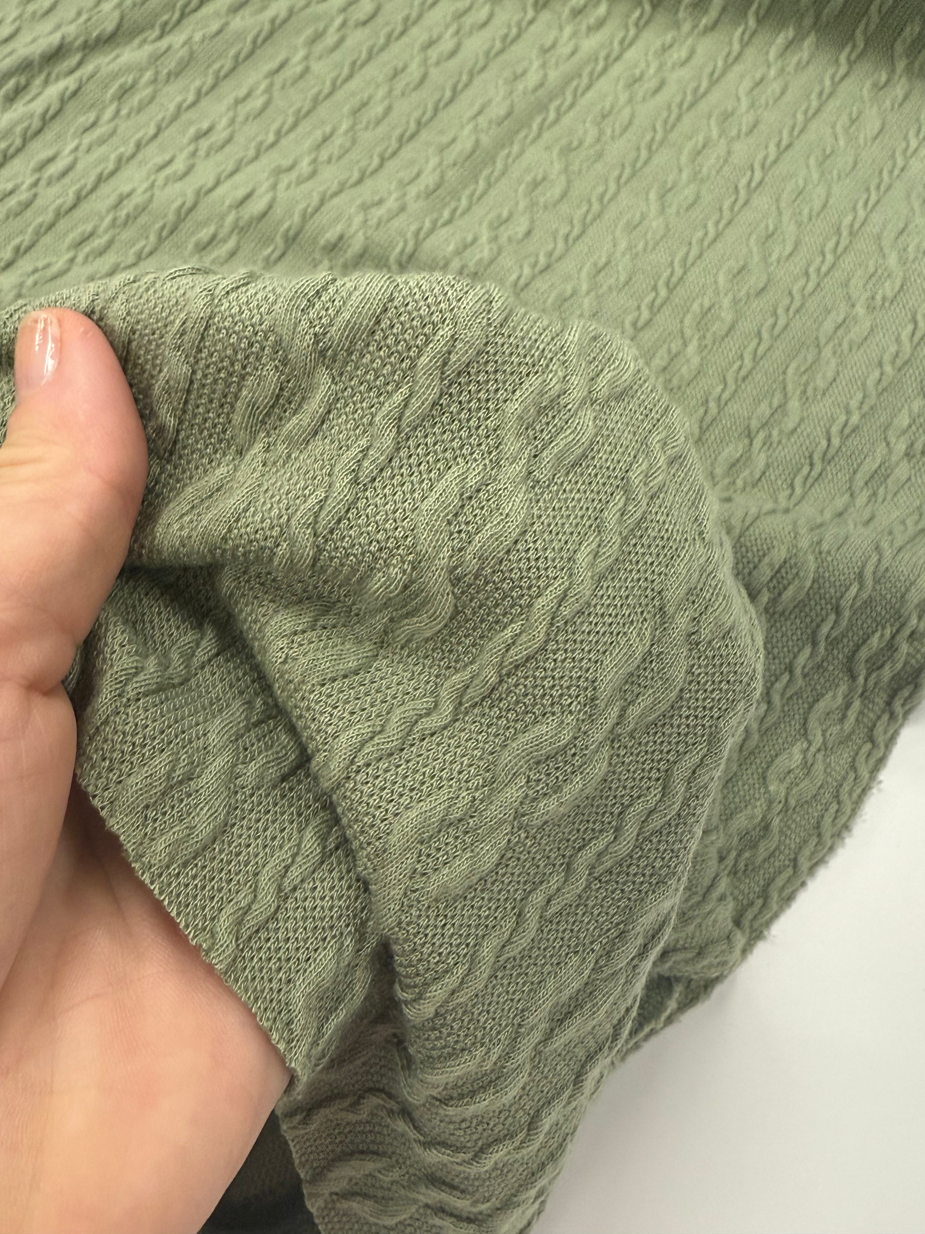 A beautifully drapey medium-weight cable knit that combines the look of a classic hand-knit with the ease of sewing. Made from 98% polyester and 2% elastane, it offers a soft touch, gentle stretch, and elegant drape. Perfect for cardigans, sweaters, jumper dresses, and cozy layering pieces, this fabric brings both comfort and style. Available in three delicate shades — blush pink, soft lilac, and sage green — it’s ideal for creating timeless, wearable garments with a modern twist.