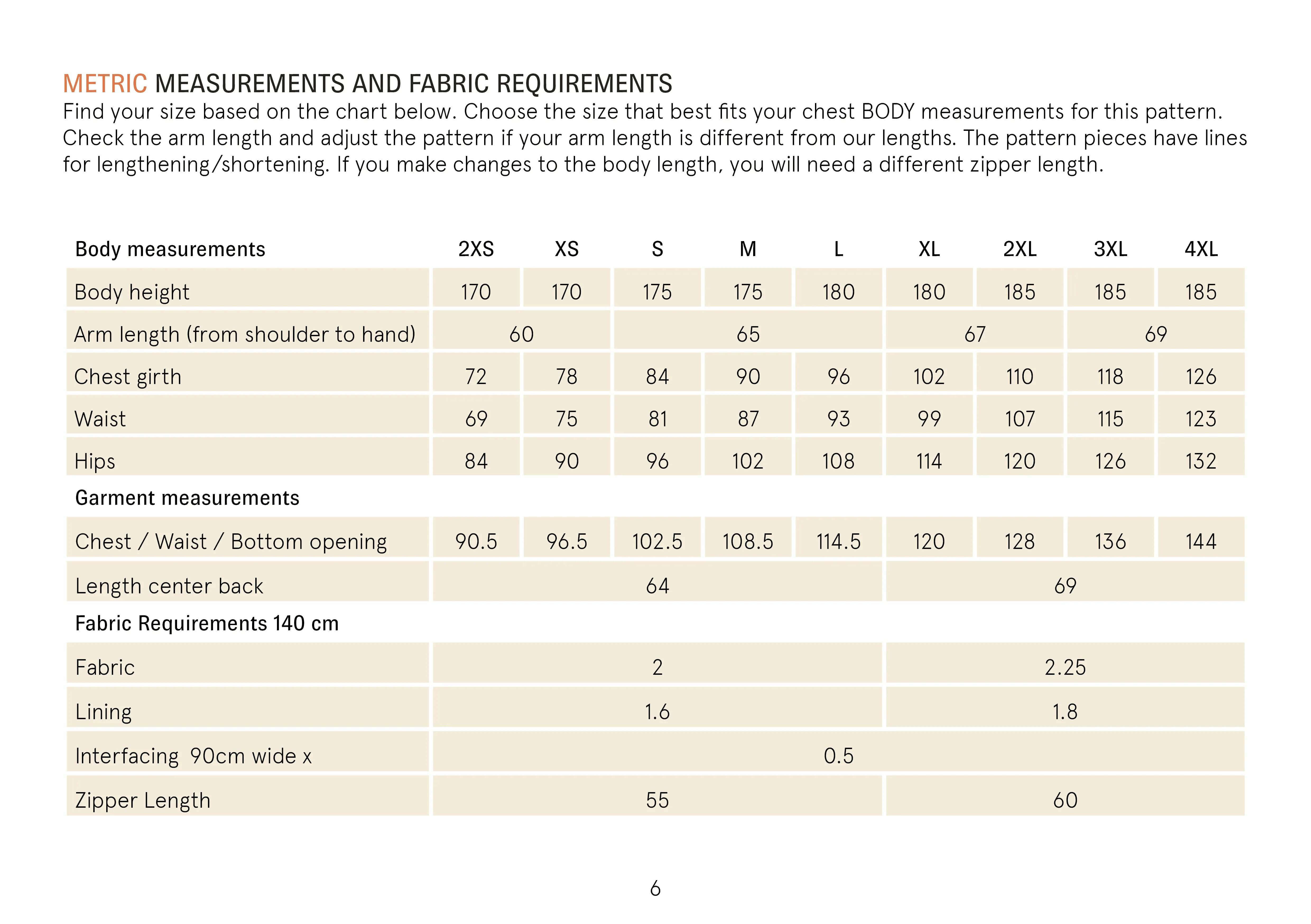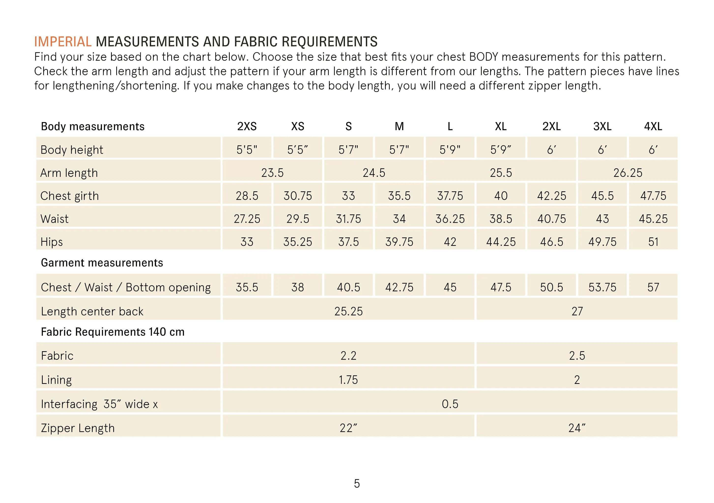 Flip through the images to find fabric requirements and measurements for the Bear Jacket sewing pattern.