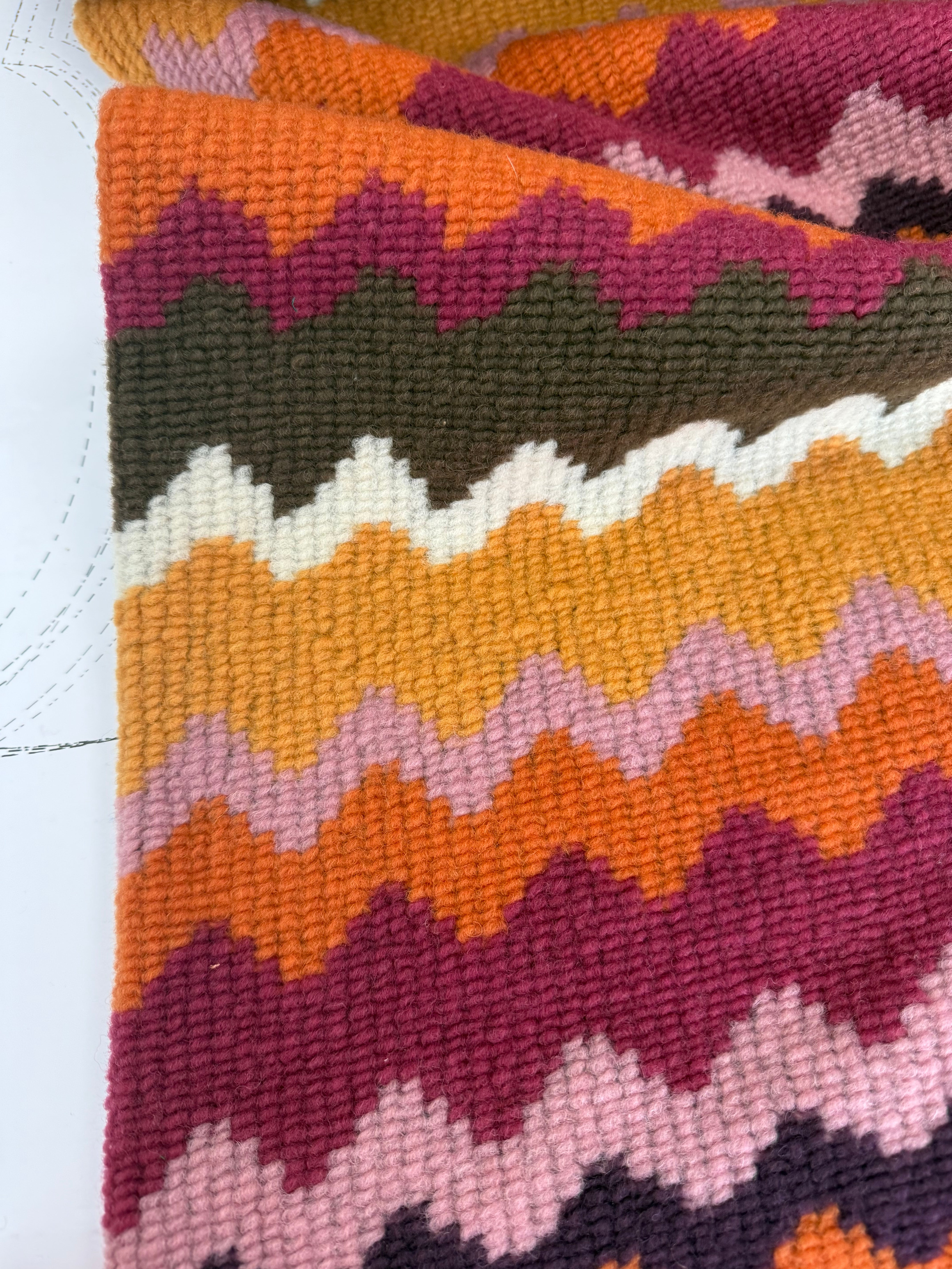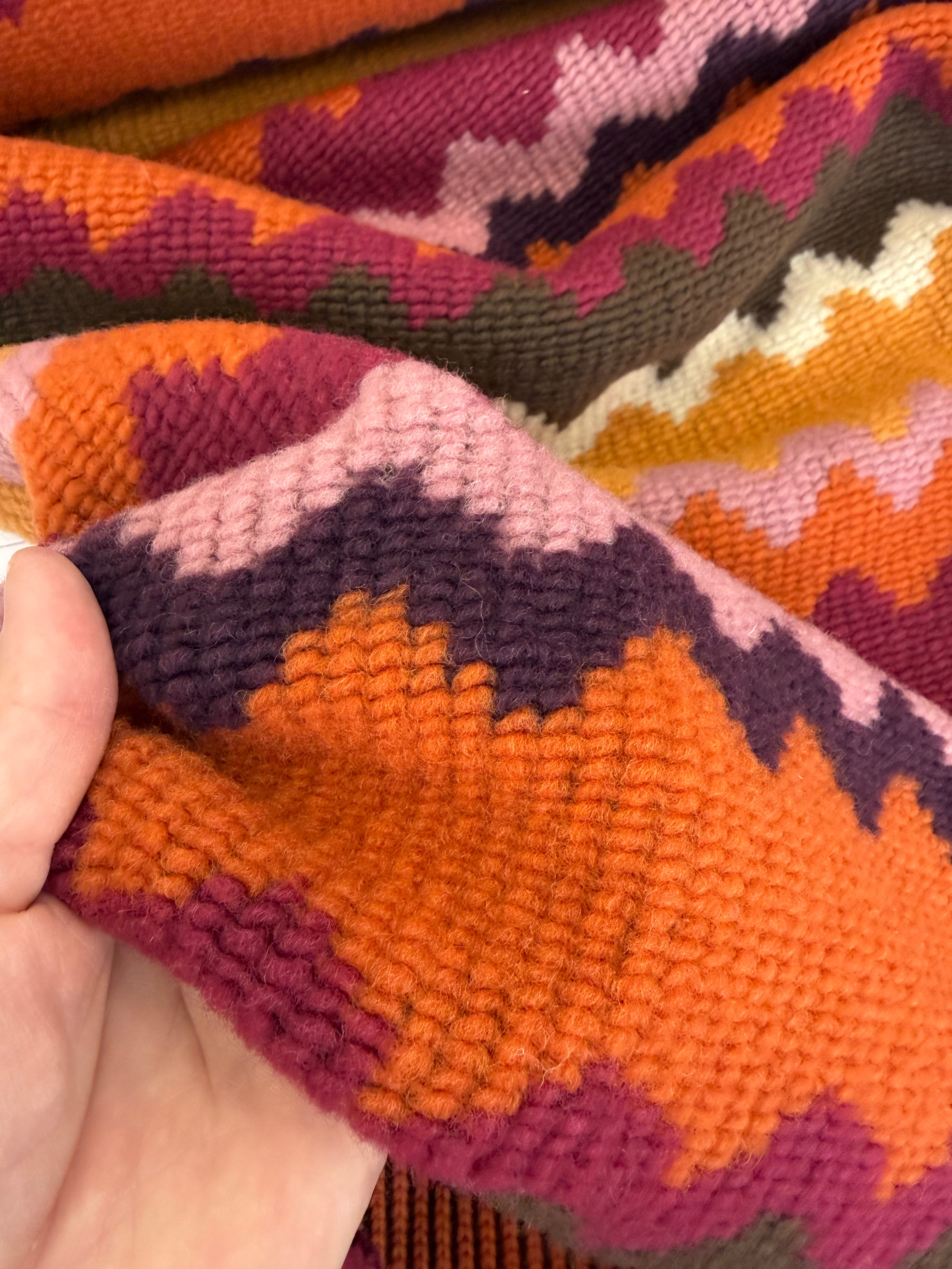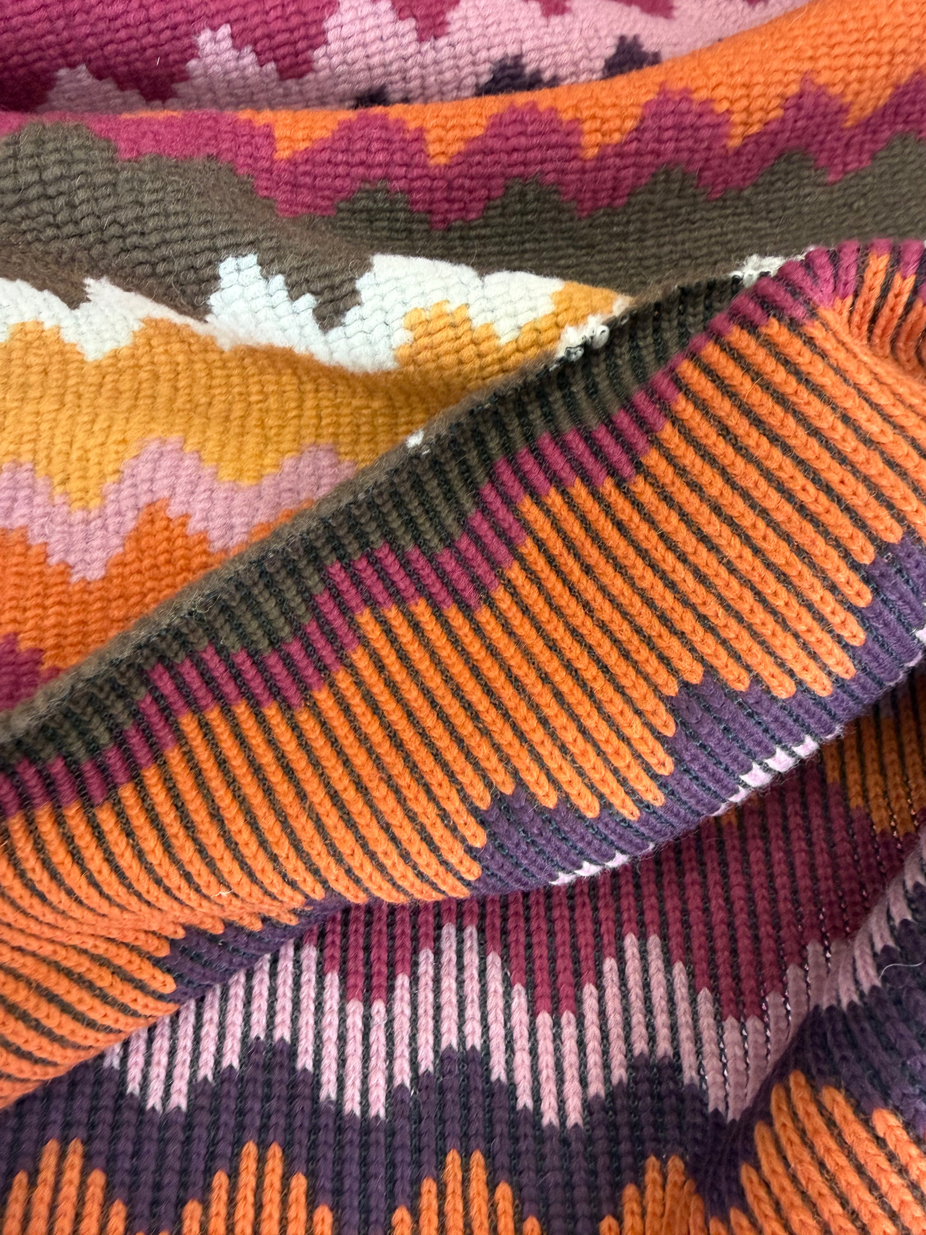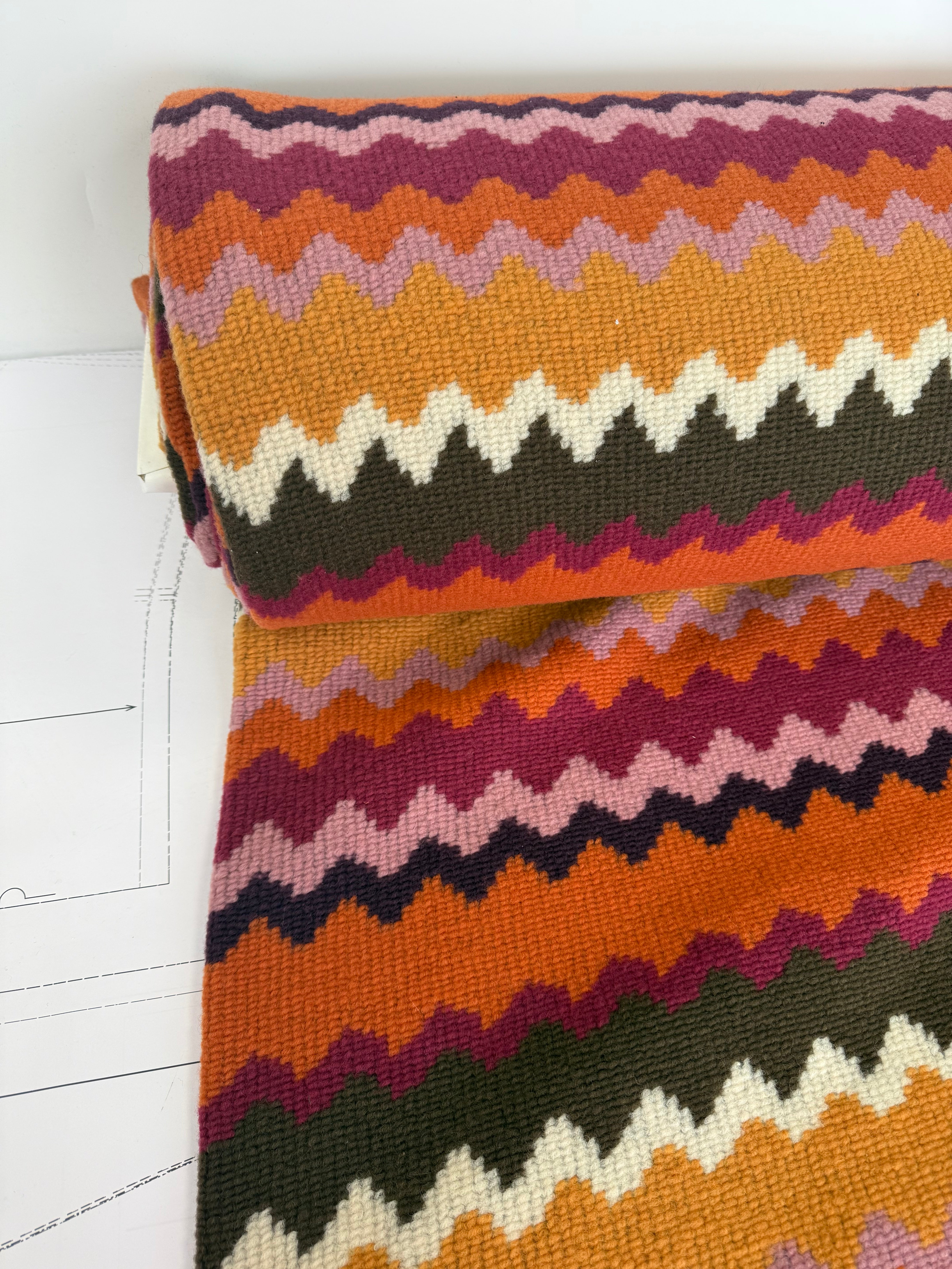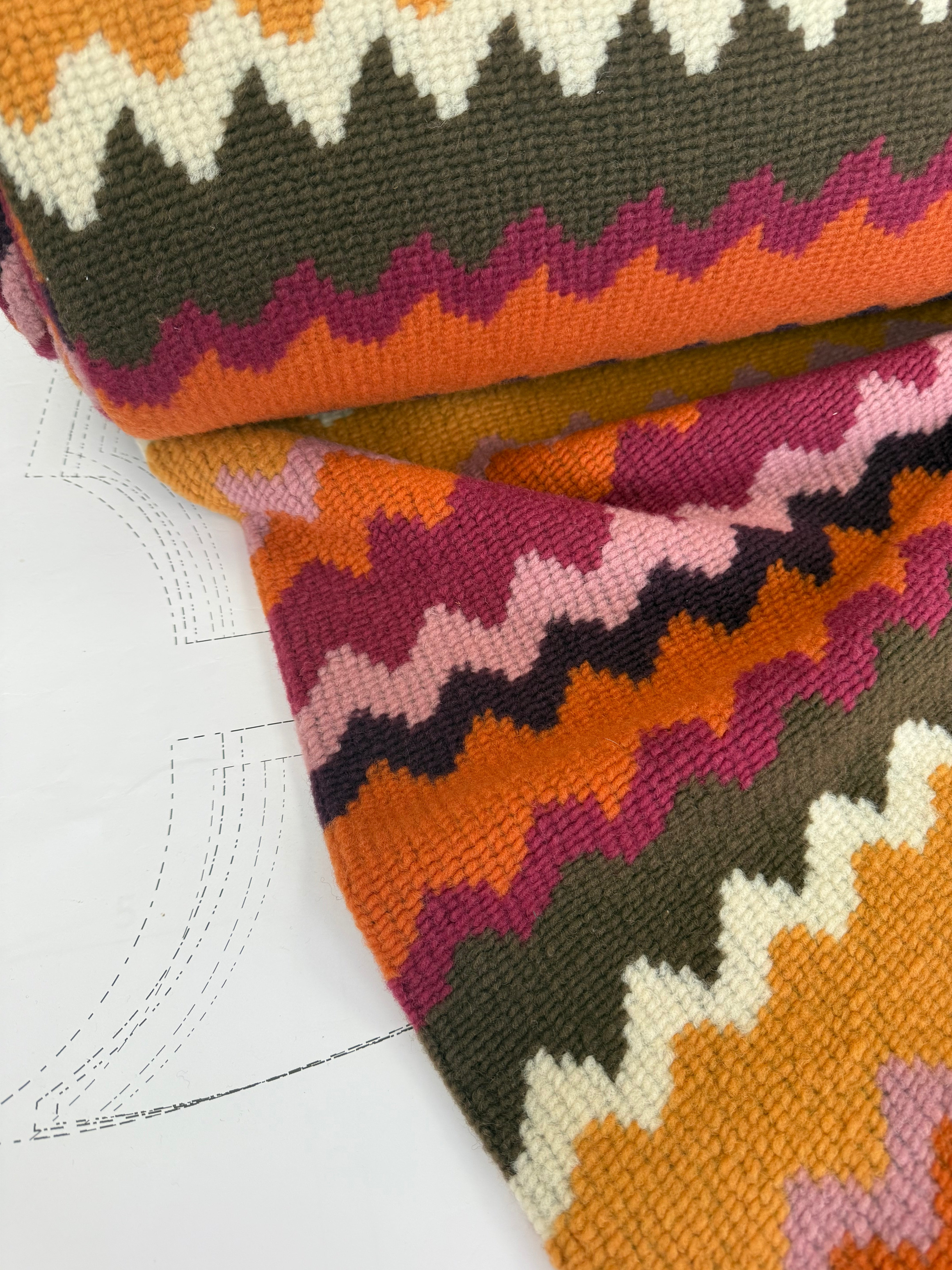 Rich, warm, and oh-so cosy. This design combines earthy olive, pumpkin orange, deep magenta, blush pink, and cream in a bold zigzag. A real showstopper for autumn/winter makes — imagine a chic coatigan, tunic dress, or oversized jumper