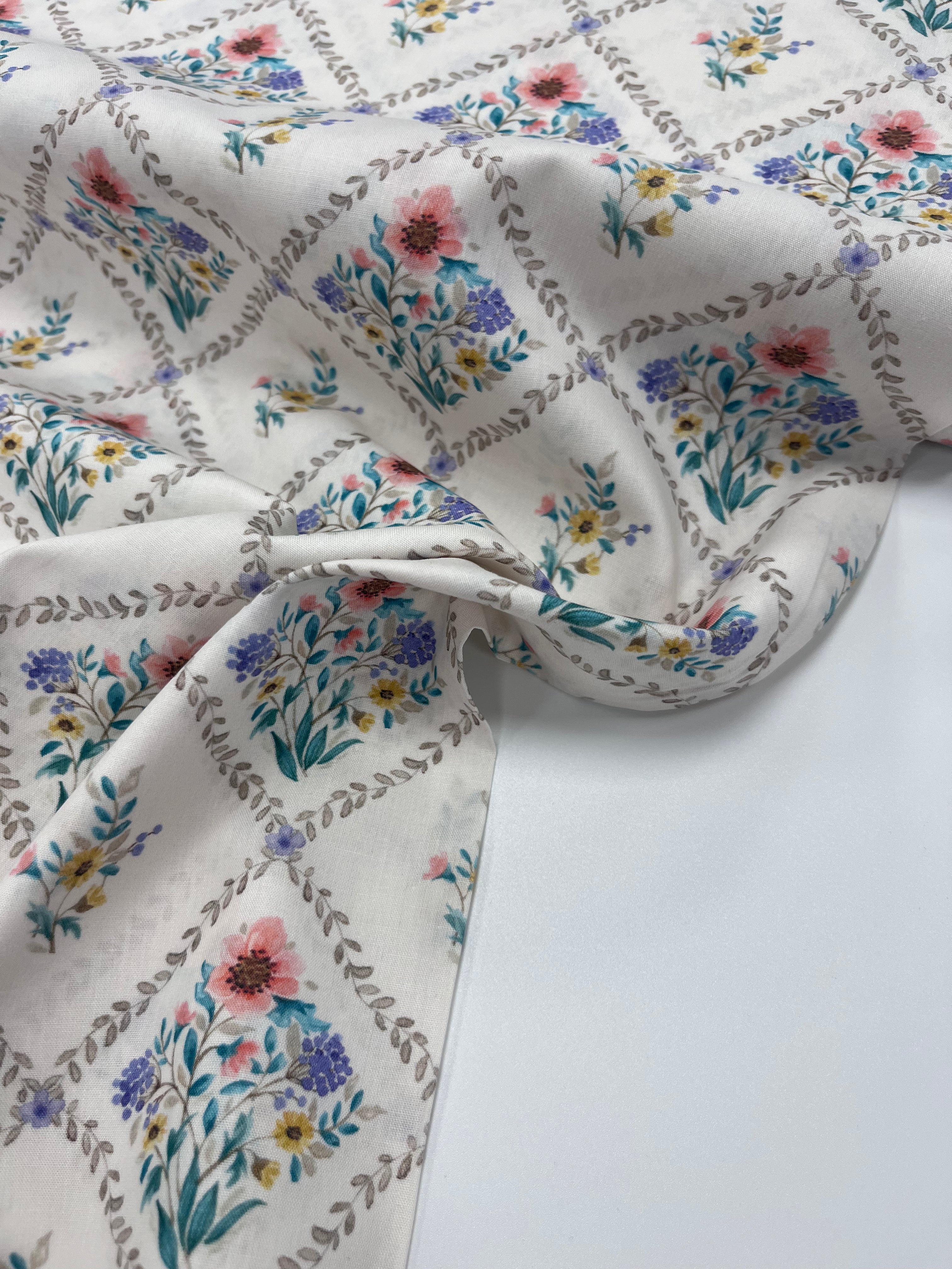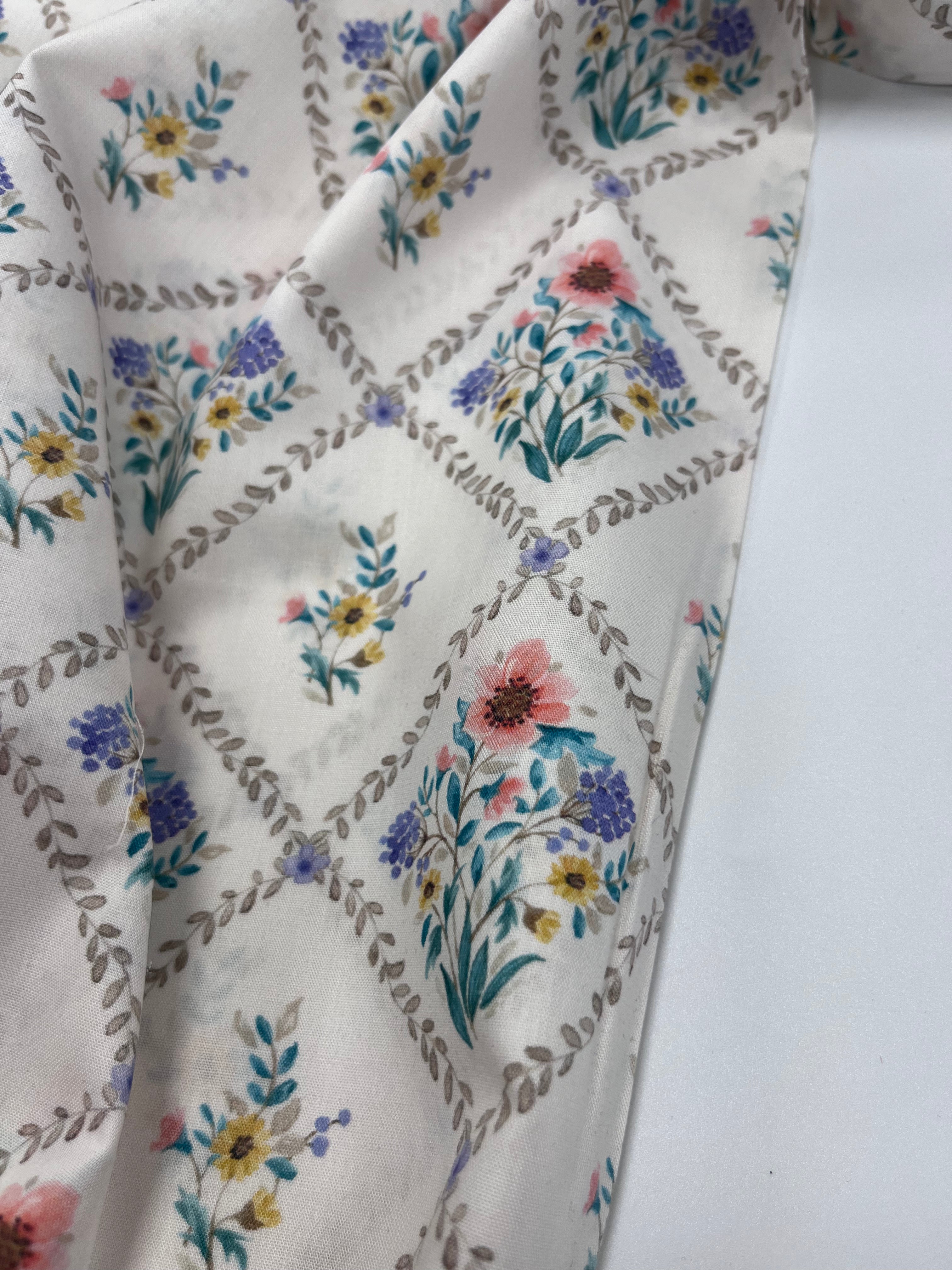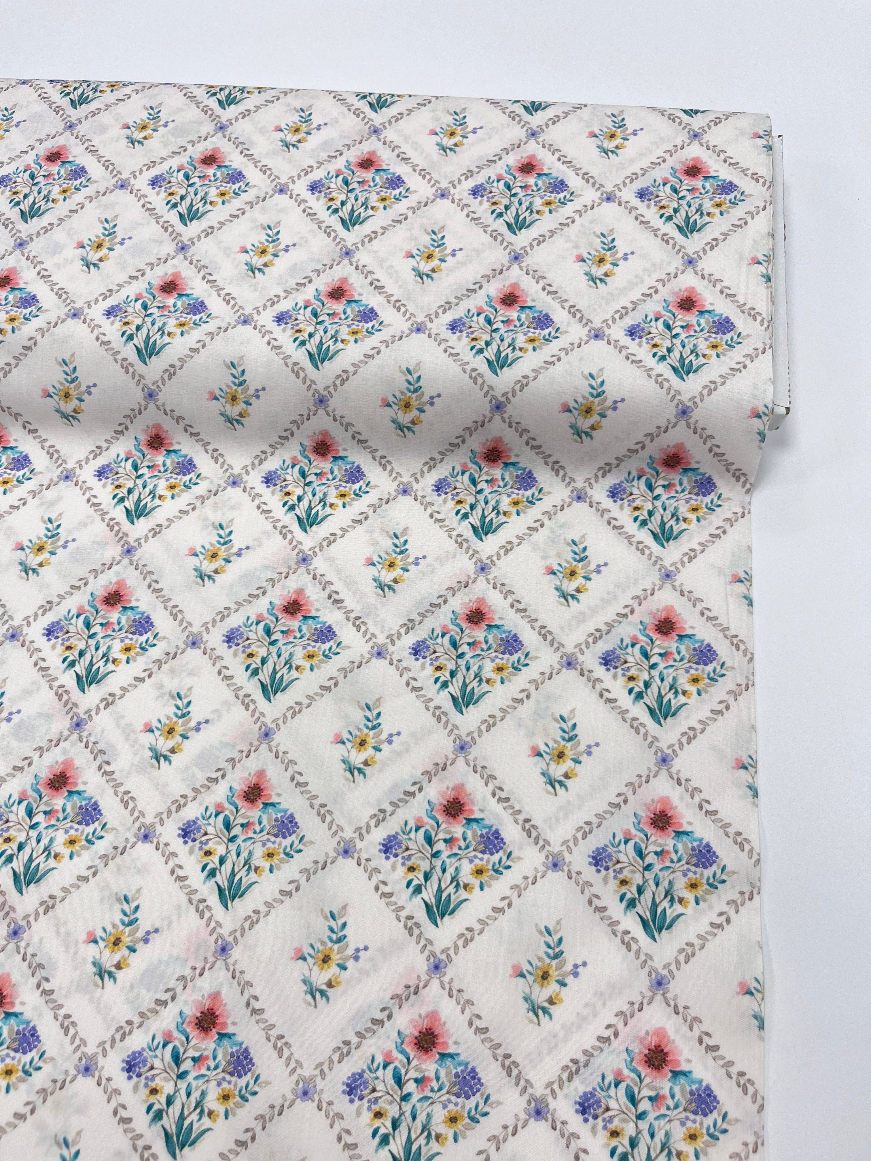 Trellis A striking floral trellis design on a rich off white background. Coral pinks, soft yellows, and lavender blooms stand out against the dark base, framed by a leafy lattice for a classic and timeless look. Coordinates perfectly with Meadow – Off white.