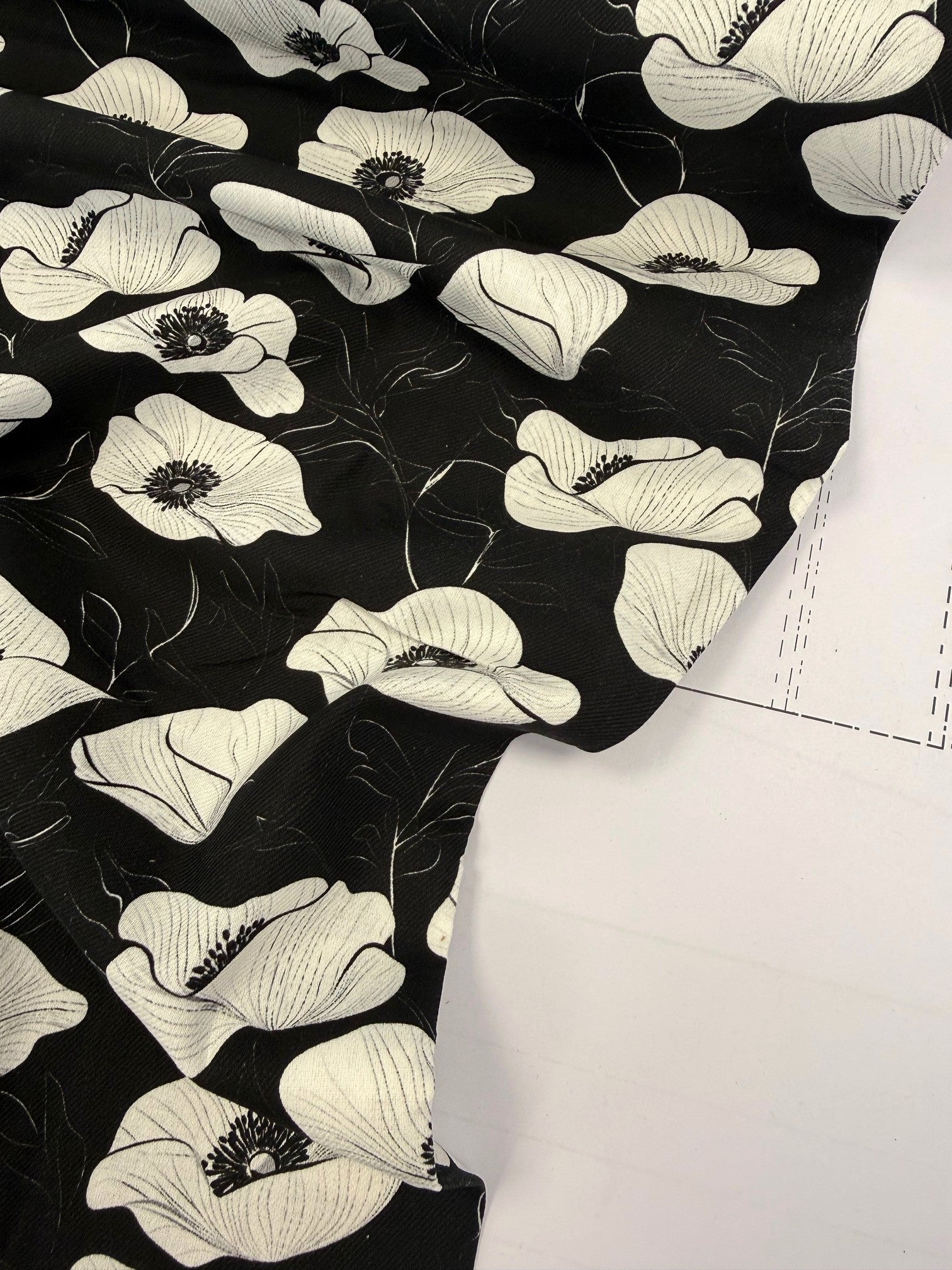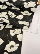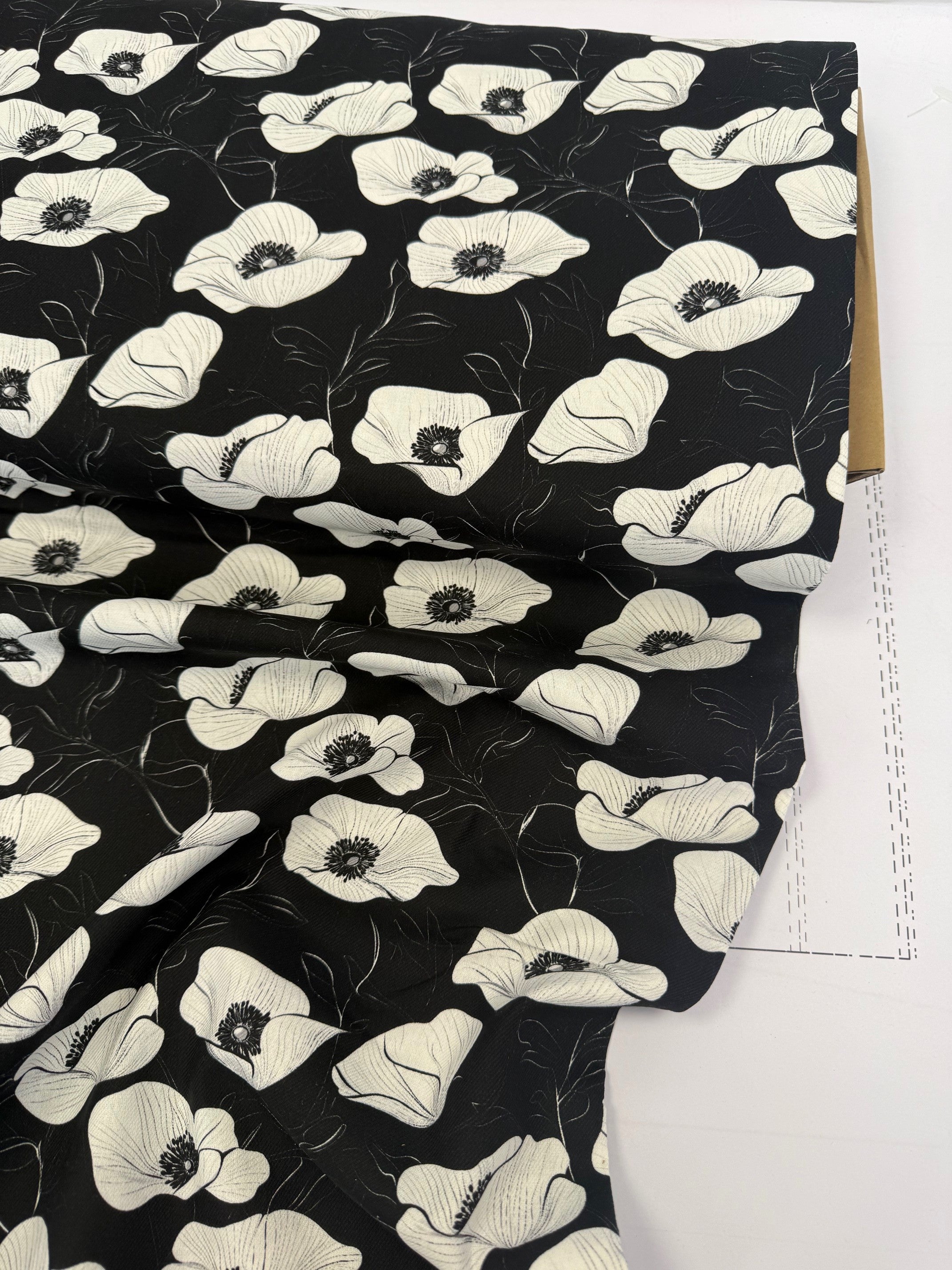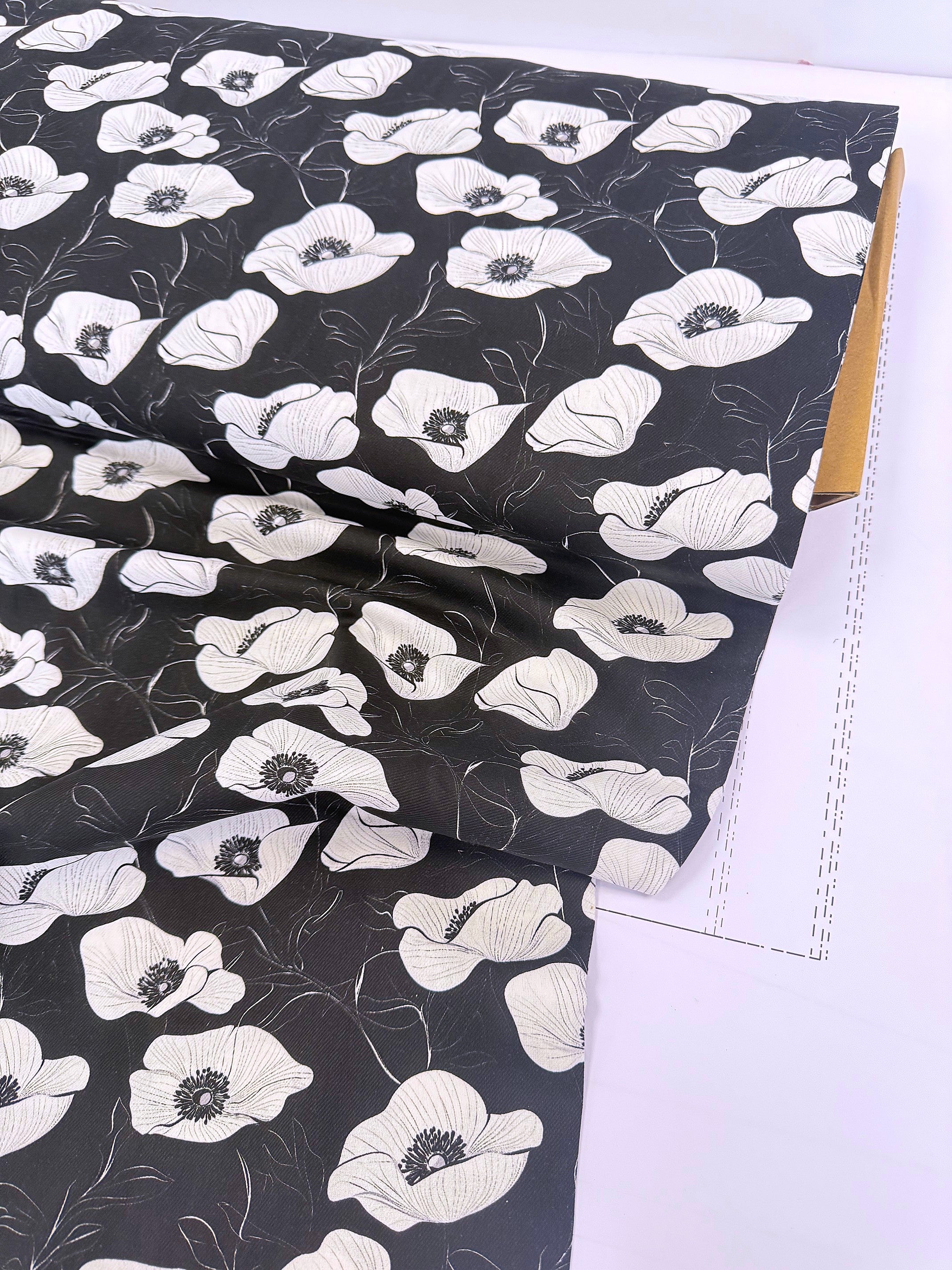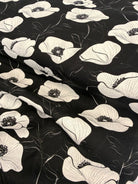 A striking black fabric featuring elegant white poppy blooms outlined with fine black detailing. The large-scale floral design creates a bold yet timeless look, perfect for statement garments like dresses, skirts, or outerwear. The high contrast makes the flowers really pop against the dark background, giving it a sophisticated and modern aesthetic.