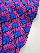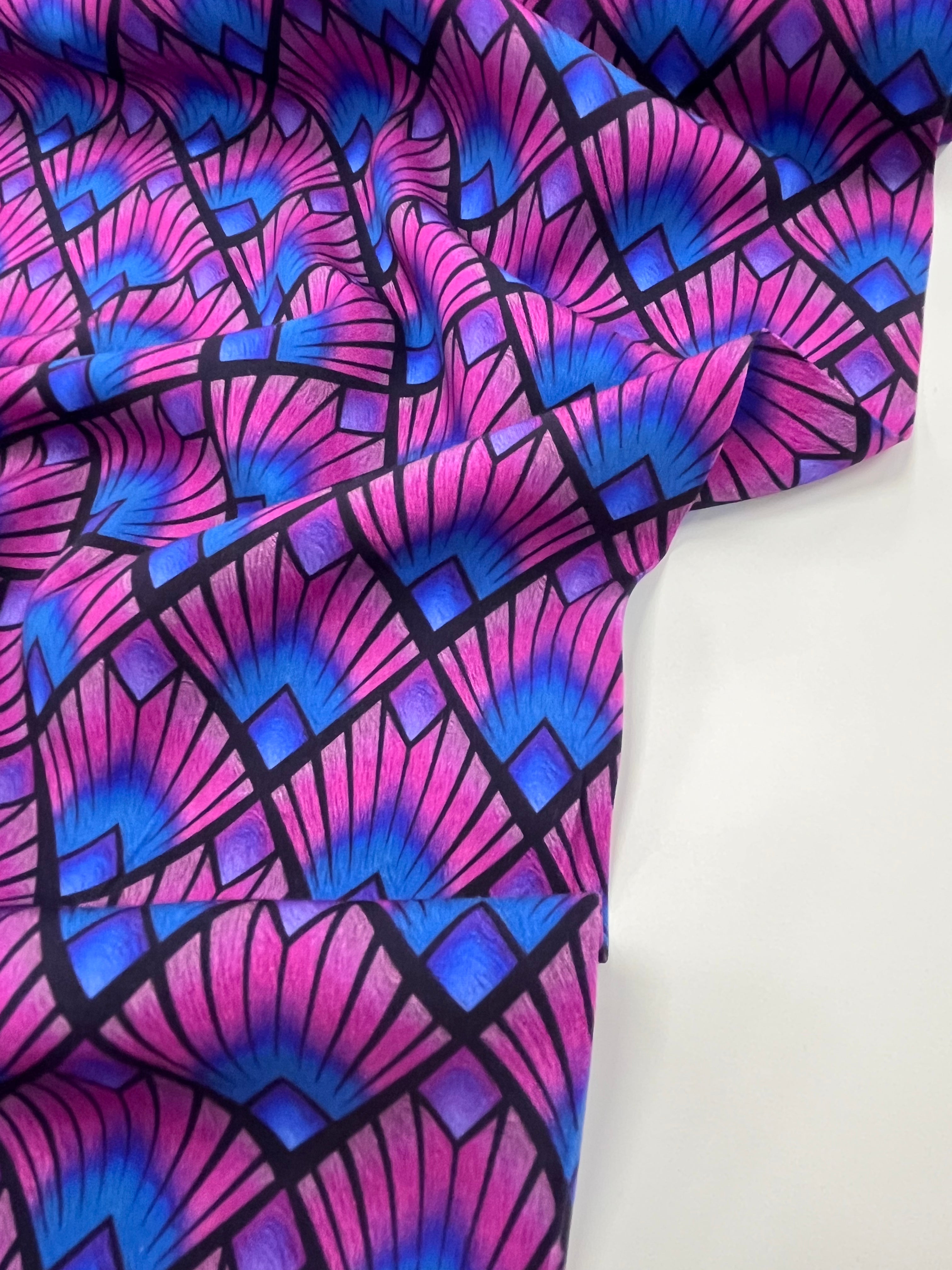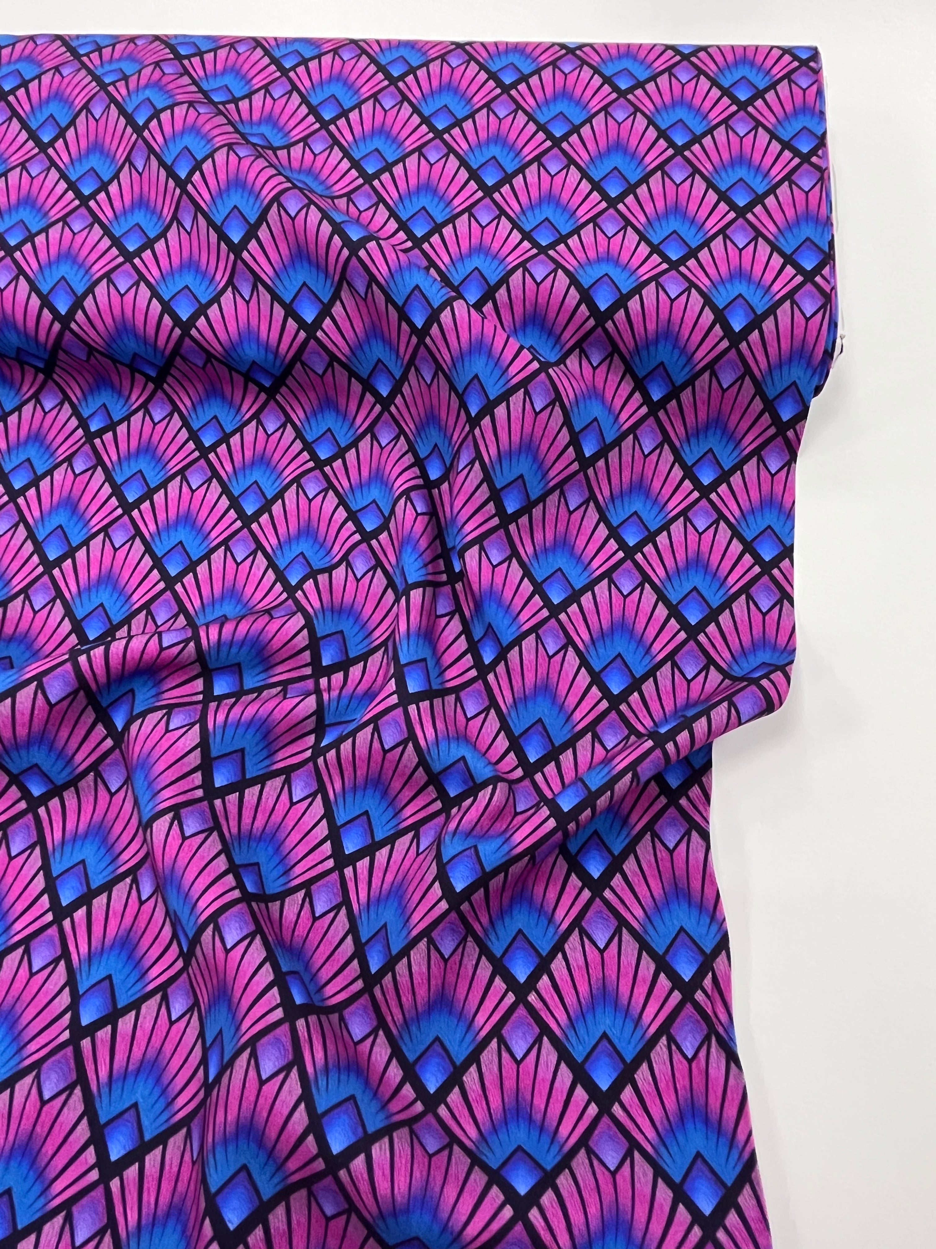 Radiance is a bold viscose fabric designed to make an impact. Its striking geometric design combines sharp lines with vibrant shades of pink and blue that blend seamlessly into each other, creating a dramatic, almost glowing effect.