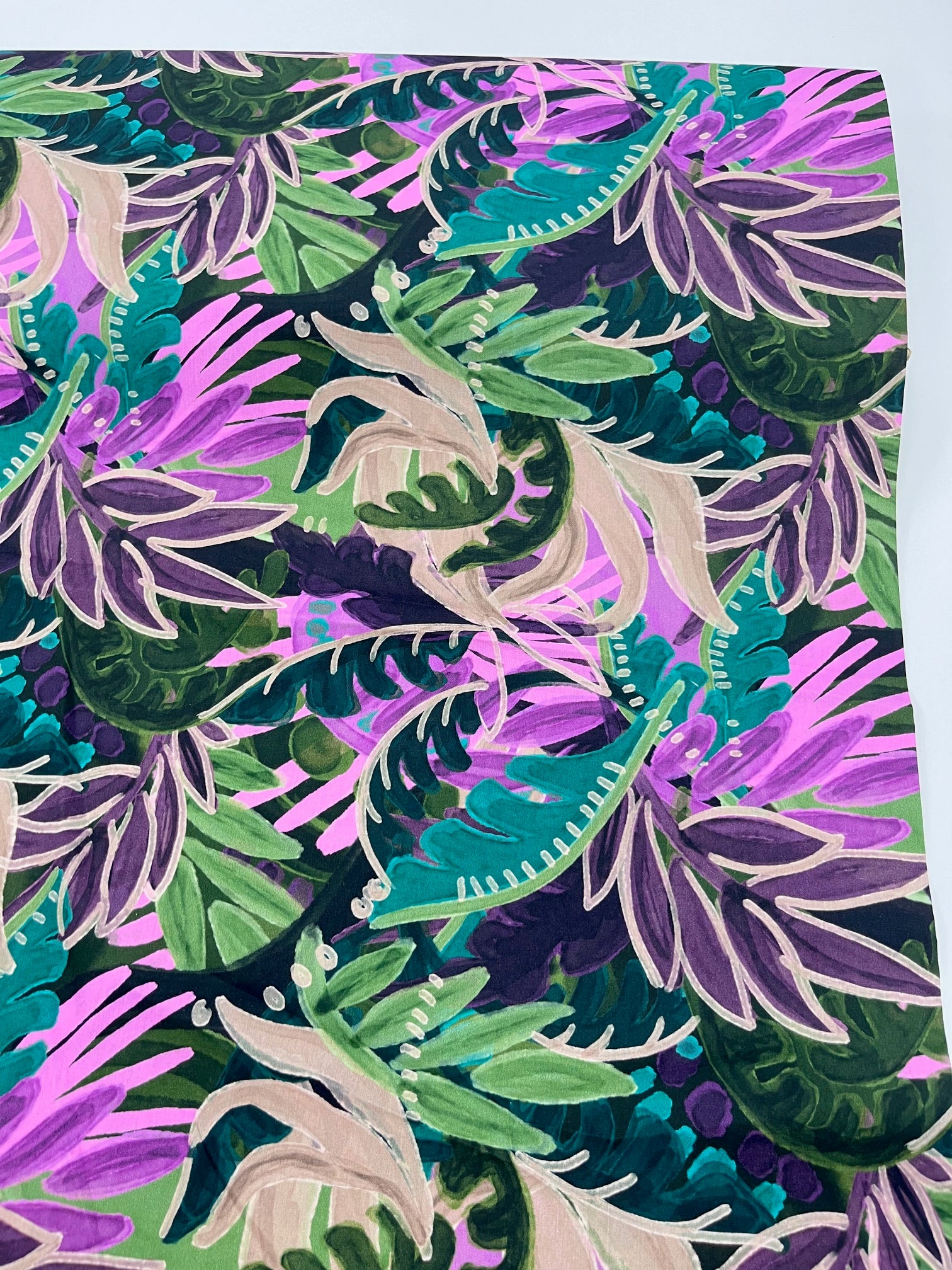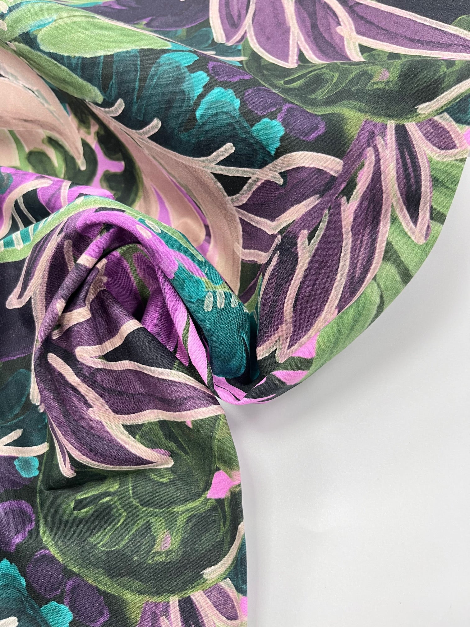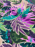 A lush, tropical-inspired print featuring sweeping leaves and layered foliage in vibrant shades. The Emerald colourway blends greens, teals, purples and soft beige highlights, while the Orchid colourway bursts with magenta, mustard, plum and pink tones. Printed on a breathable cotton-viscose blend, this fabric has a soft drape and lightweight feel, perfect for dresses, blouses, skirts and transitional trousers.