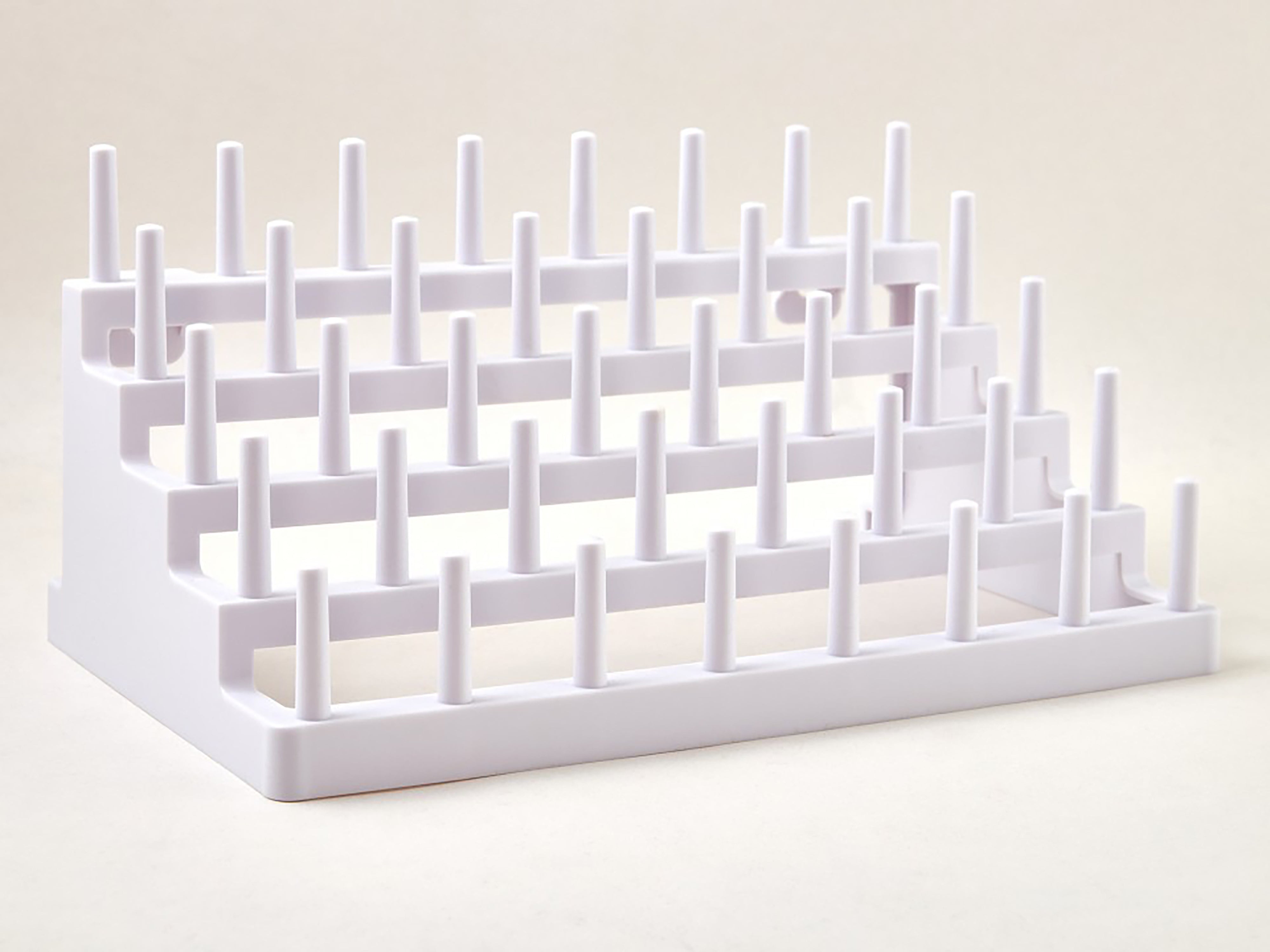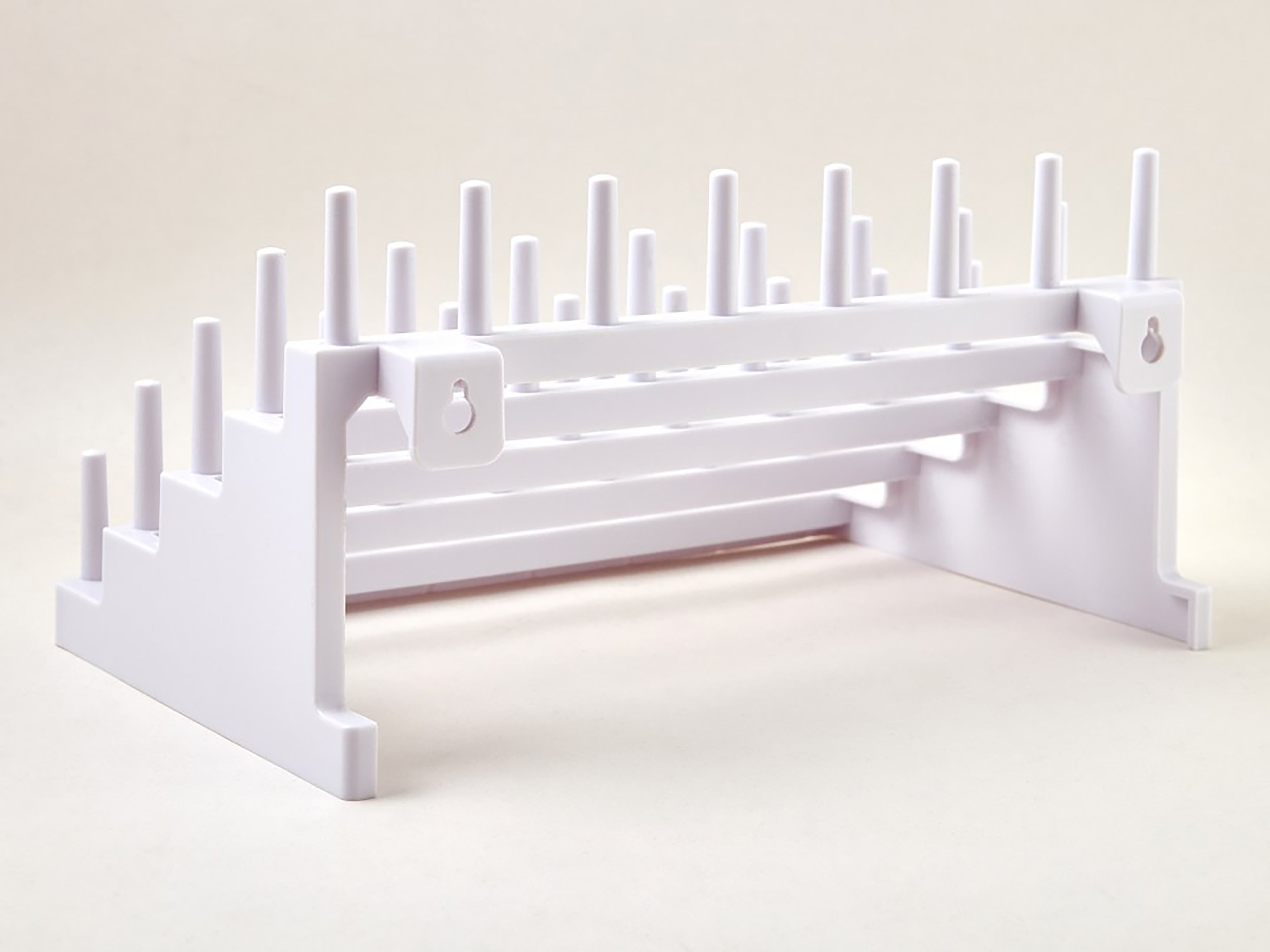 Keep your sewing space neat and colourful with this handy thread rack! It holds up to 40 spools (fits most 100m and 1000m spools) and can be used freestanding, in a drawer, or wall-mounted to suit your setup.