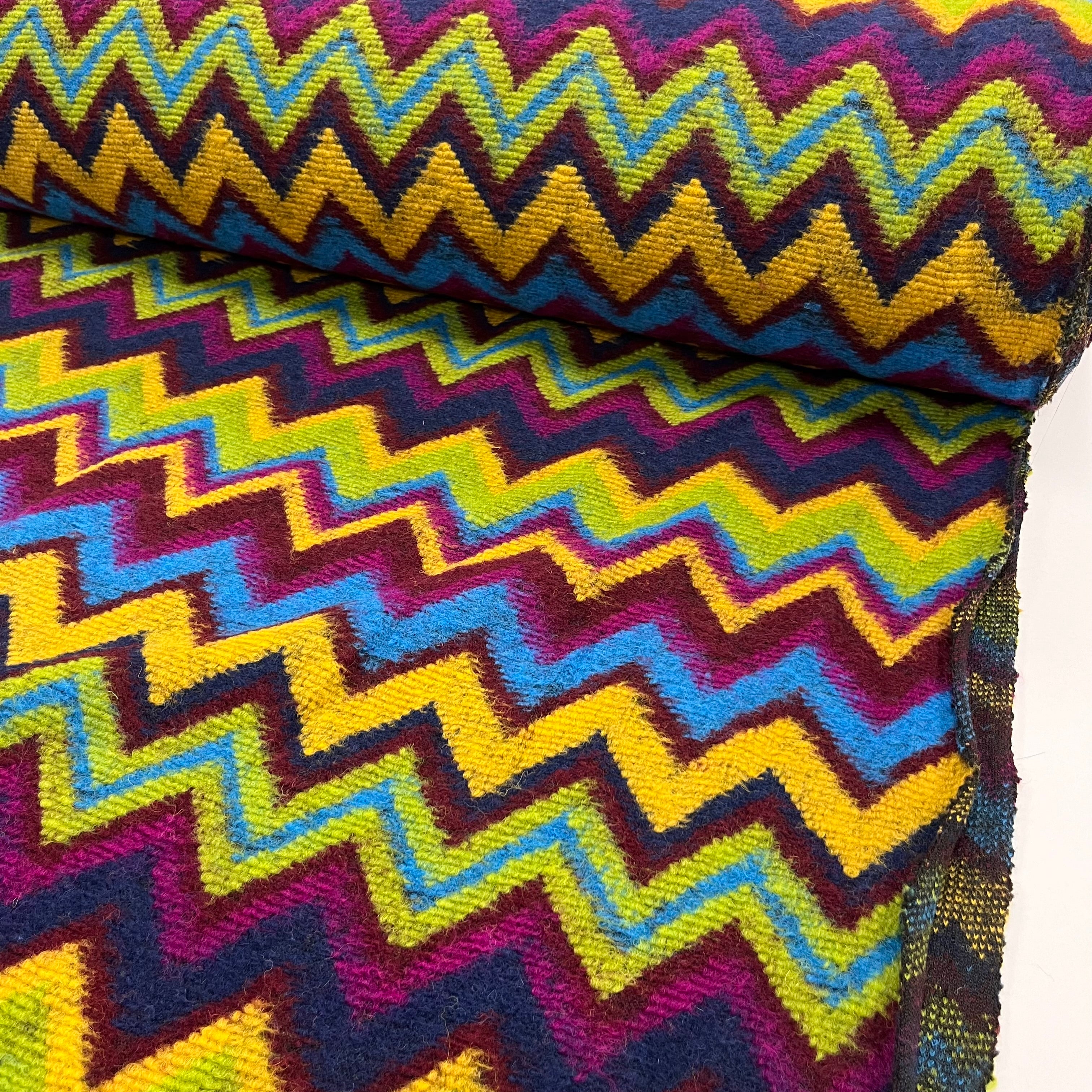 A riot of colour and pattern! This heavy knit fabric features a bold chevron design in jewel tones of magenta, lime, cobalt, mustard, and navy. Soft, warm, and full of personality — perfect for statement jackets, cosy cardigans, or standout coatigans.