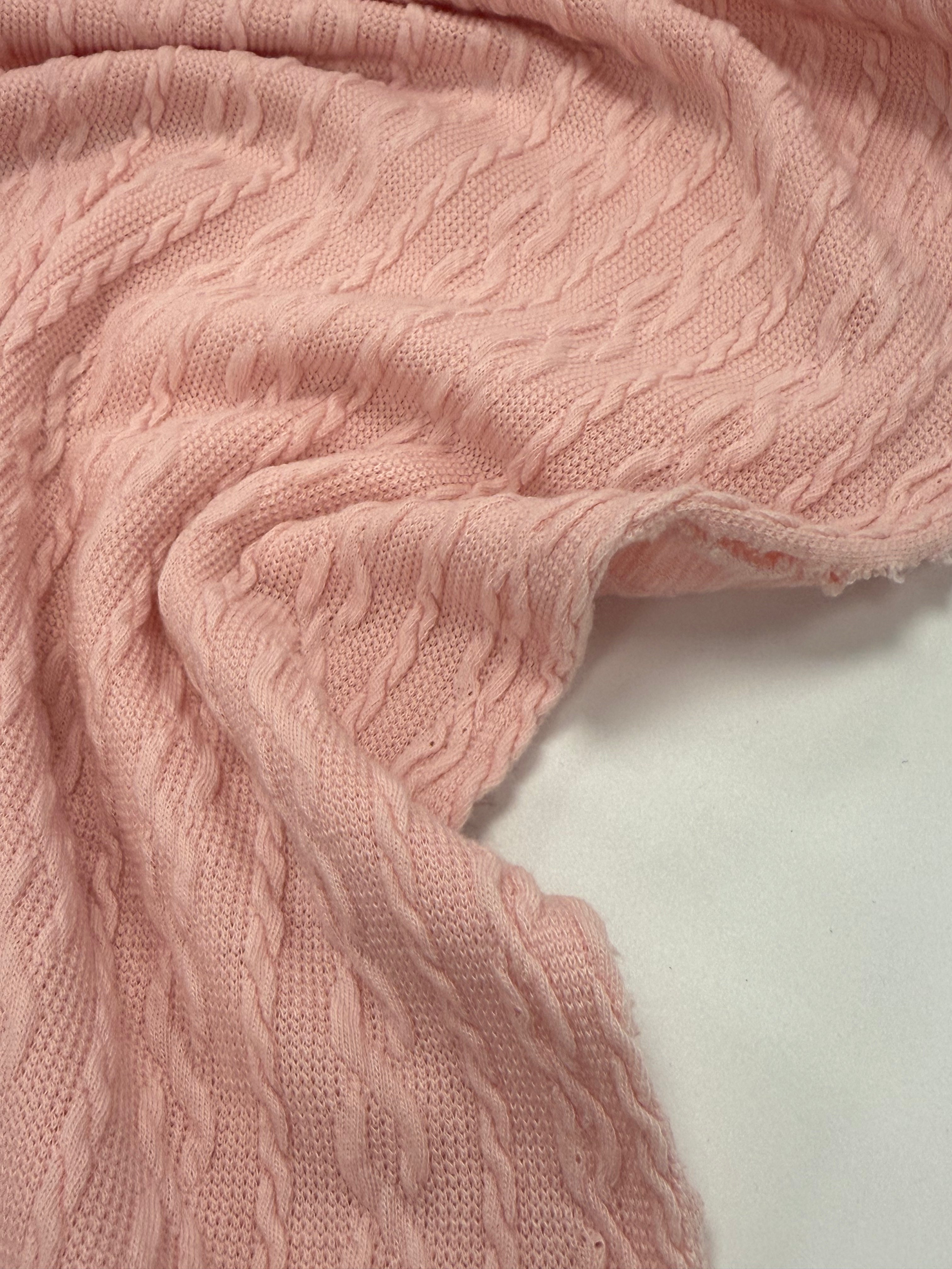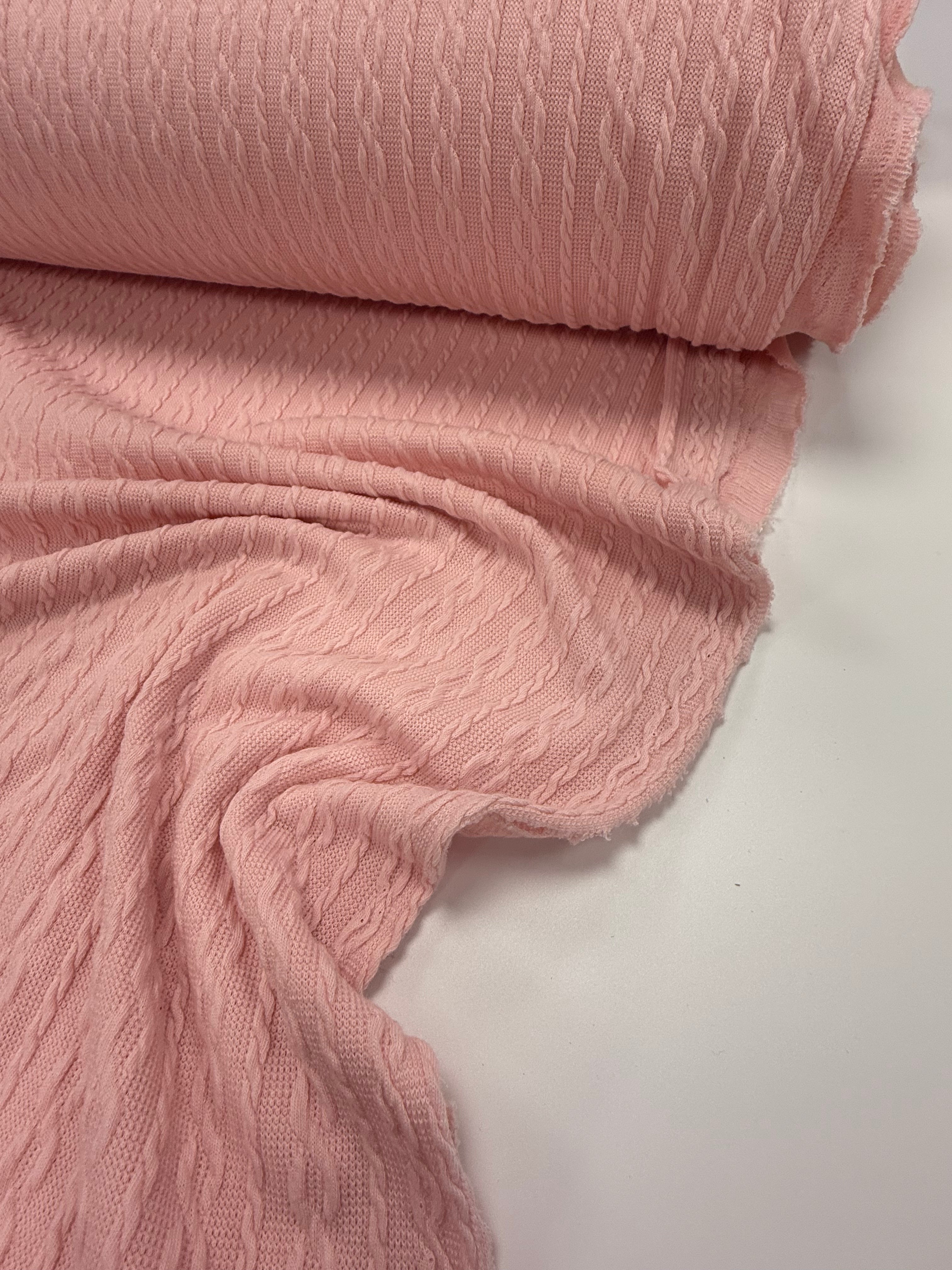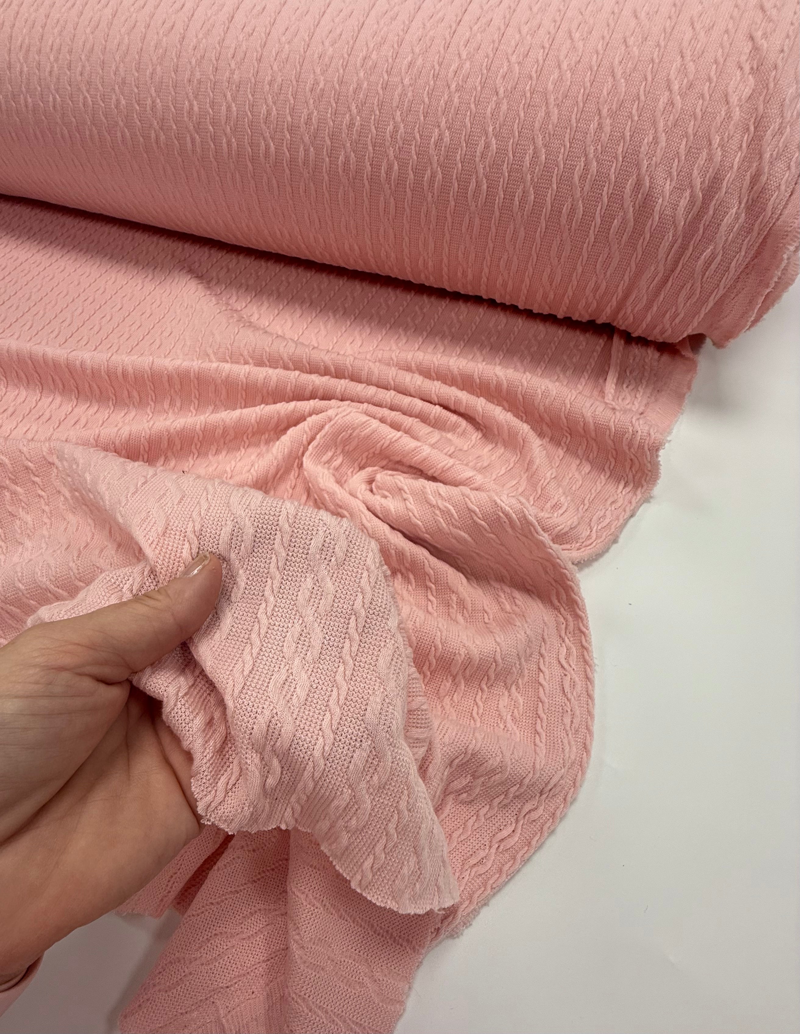 A beautifully drapey medium-weight cable knit that combines the look of a classic hand-knit with the ease of sewing. Made from 98% polyester and 2% elastane, it offers a soft touch, gentle stretch, and elegant drape. Perfect for cardigans, sweaters, jumper dresses, and cozy layering pieces, this fabric brings both comfort and style. Available in three delicate shades — blush pink, soft lilac, and sage green — it’s ideal for creating timeless, wearable garments with a modern twist.