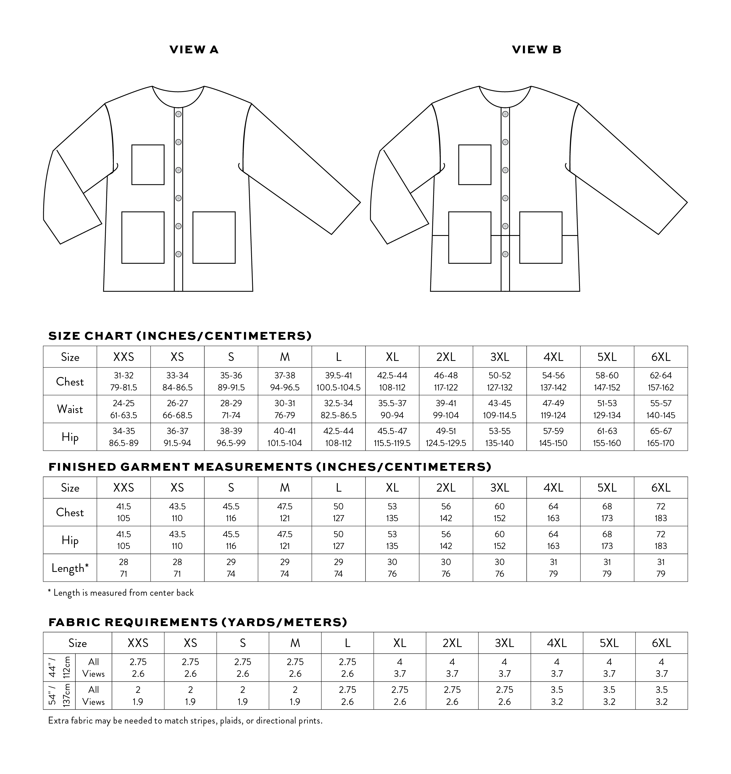 Pattern includes sizes XXS - 6XL (Bust 31” - 64” / 79cm - 162cm)